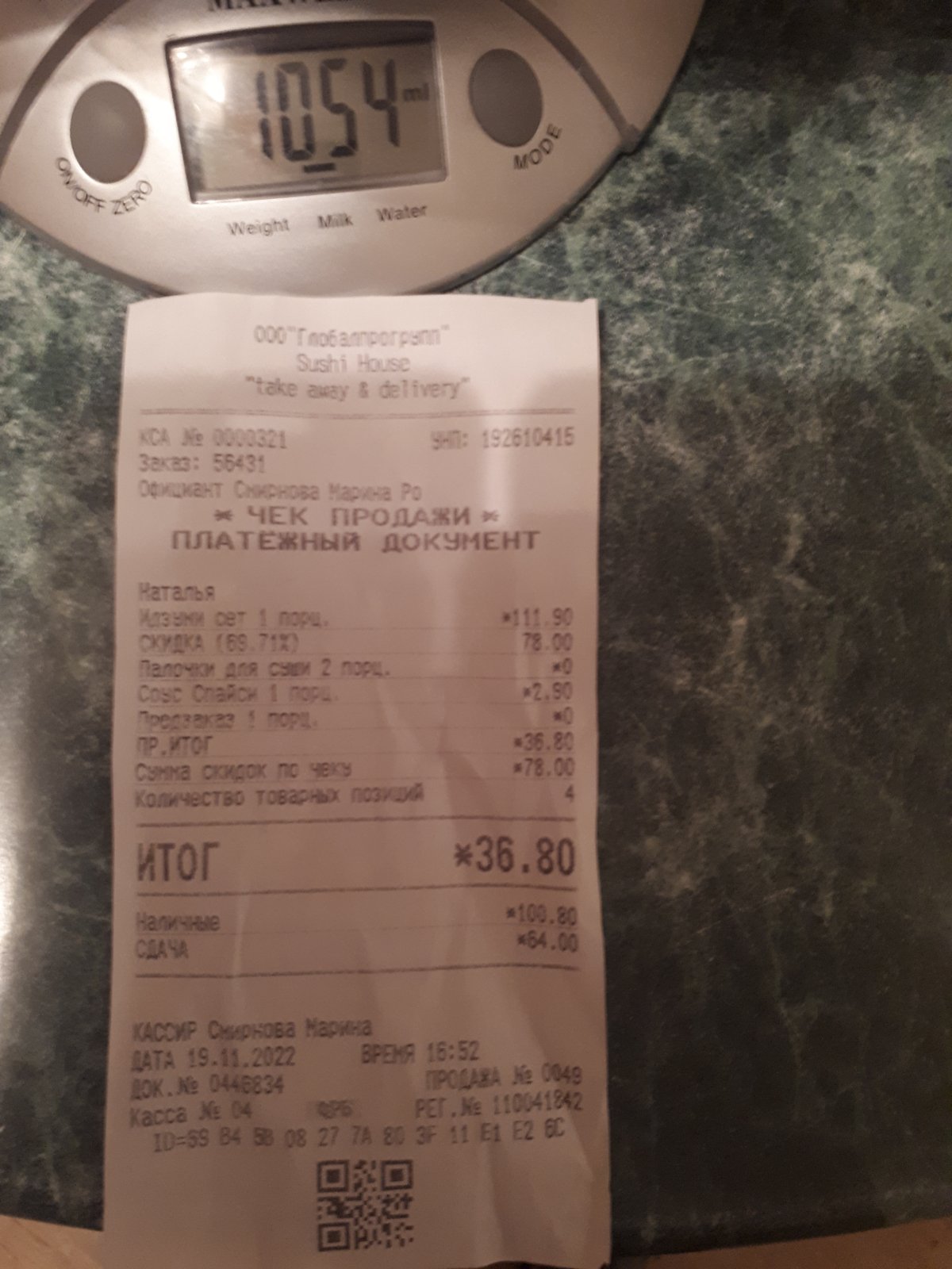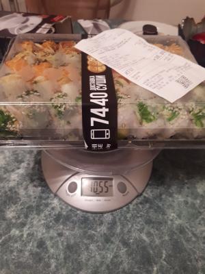 Привезли суши в 18.36- 1.40 мин, в Минске и доставка 1.40 мин, опоздание на 30 минут Хорошо, с супругой приняли суши, оплатили ,курьер сообщил, что нам придёт смс с промокодом на скидку. СМС естественно не пришла.