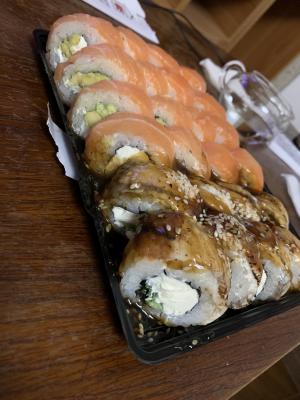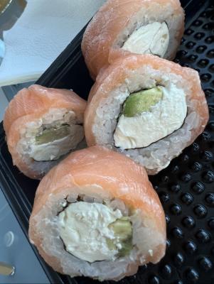 Приехали суши где Филадельфия была с жиром просто белая ужасная , вкус рыбы был как будто она речная , суши без рыбы отличные , очень жалко так как предыдущие разы было очень вкусные суши
