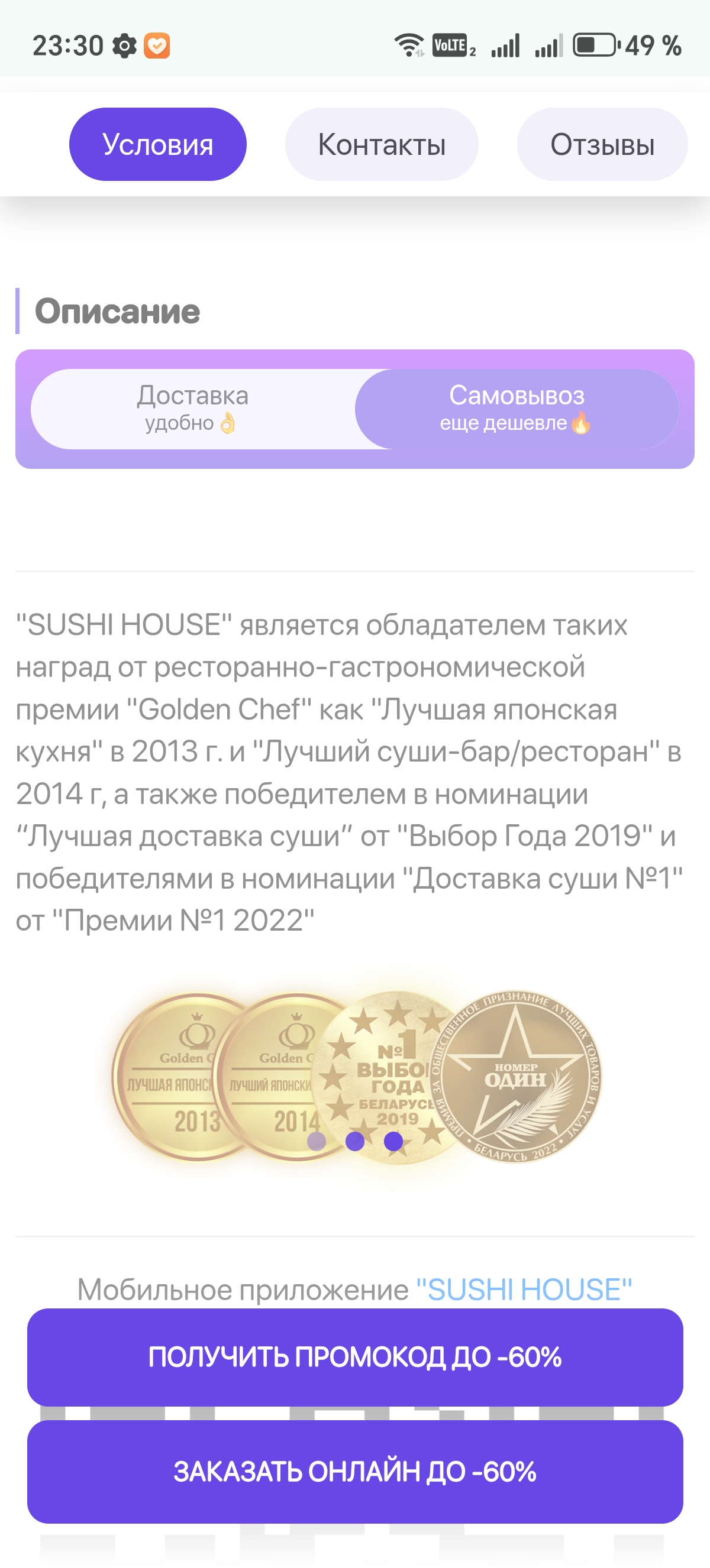- Промокод дает право на скидку до 25% на сеты от "SUSHI HOUSE"