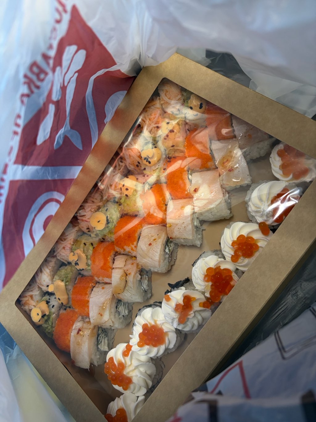 Состав: лосось, огурец, сливочный сыр, соус спайси, кунжут кимчи, соус терияки, кляр, сухари панко