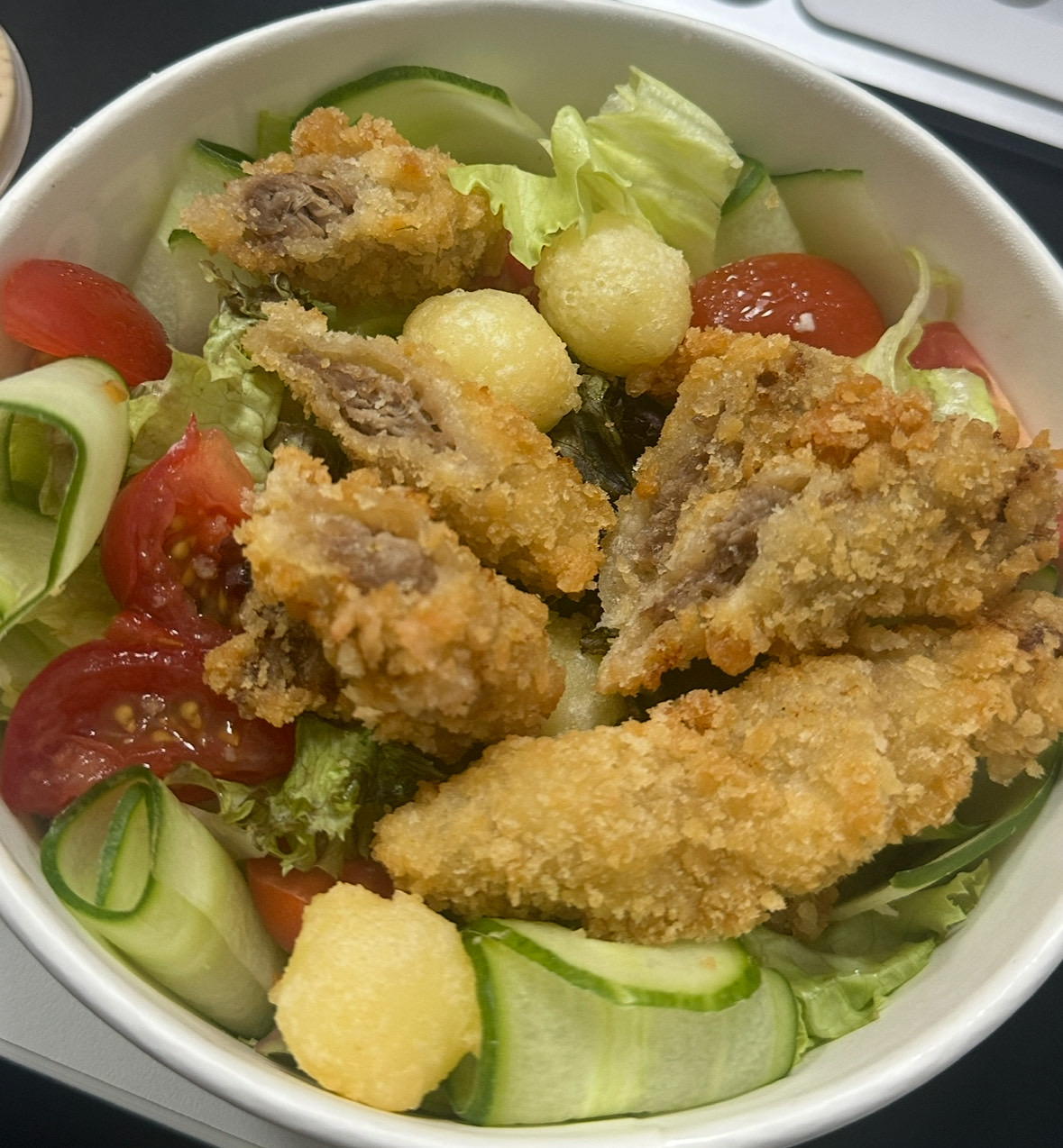 Состав: шампиньоны жаренные, сыр чеддер, кранч лук, сливочный сыр, томаты черри, соус спайси, соус терияки, кляр, сухари панко