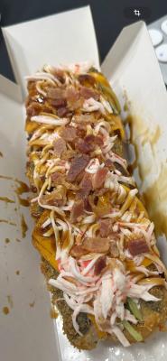Состав: краб микс, сыр чеддер, огурец, чипс бекона, сливочный сыр, соус терияки, кляр, сухари панко