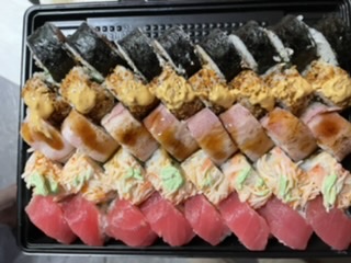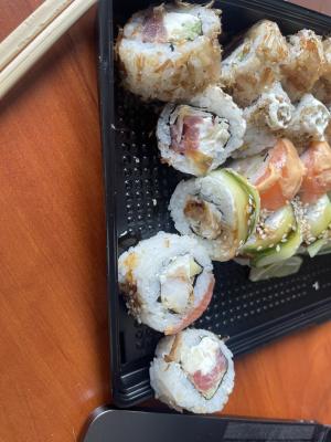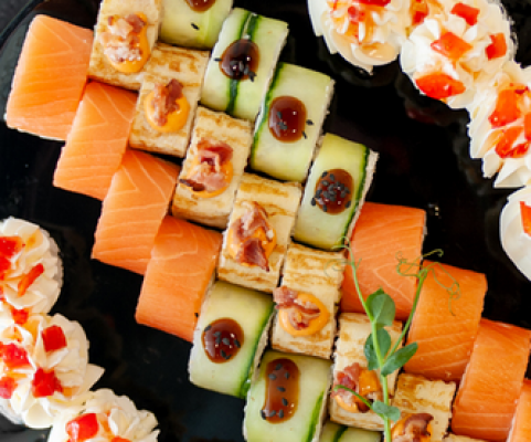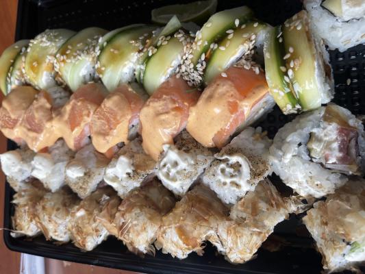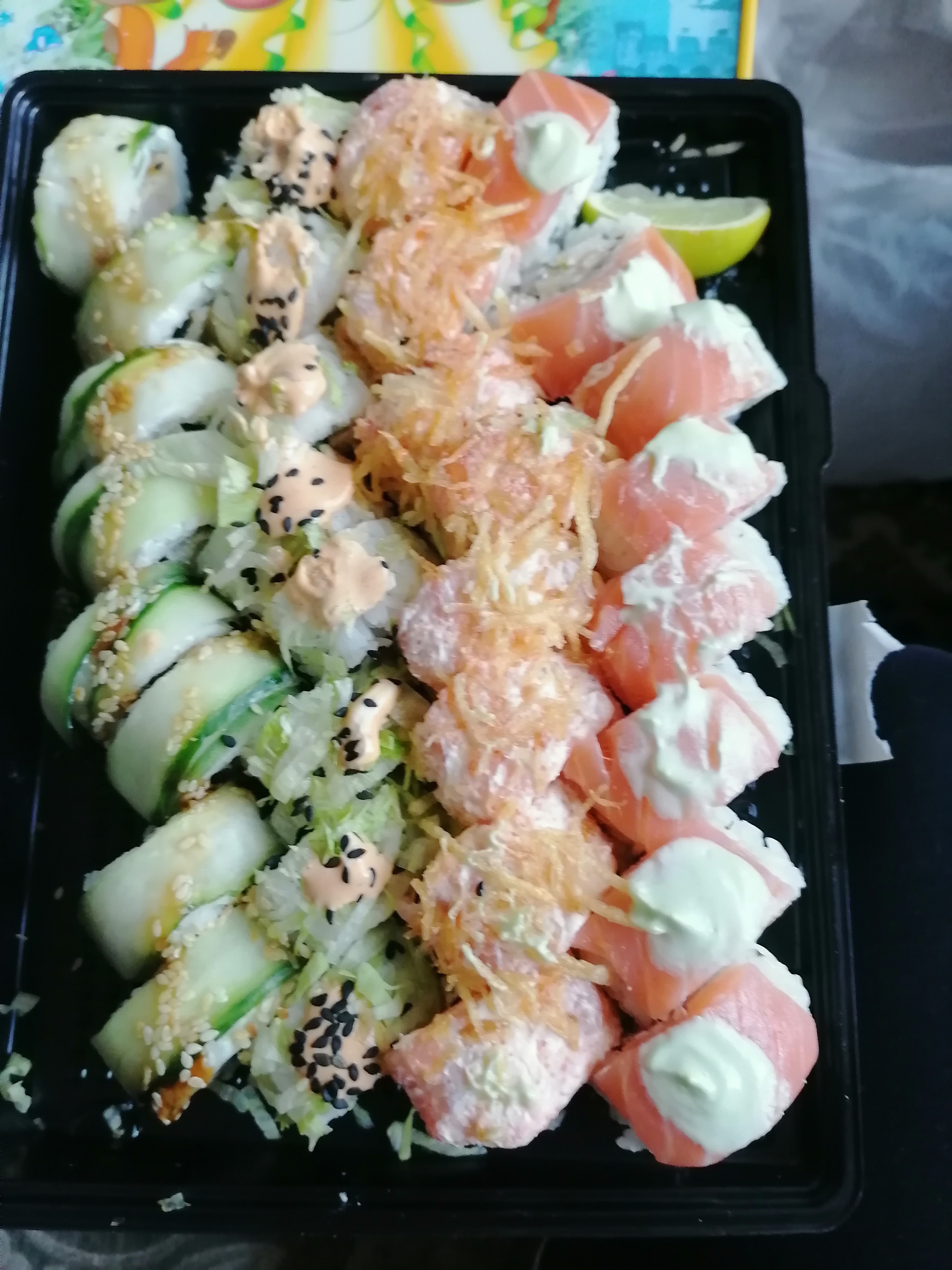 Состав: лосось, огурец, сливочный сыр, соус спайси, кунжут кимчи, соус терияки, кляр, сухари панко