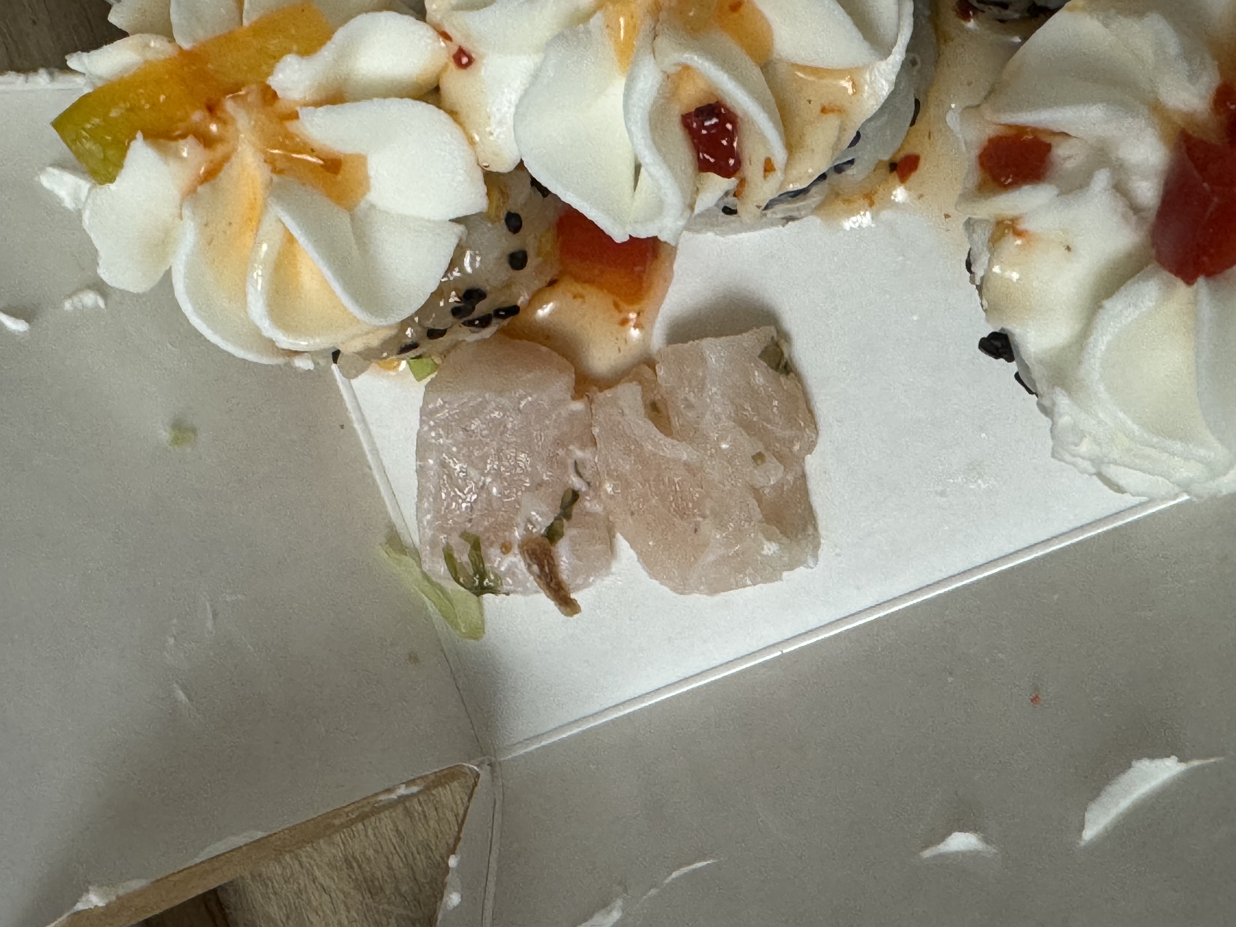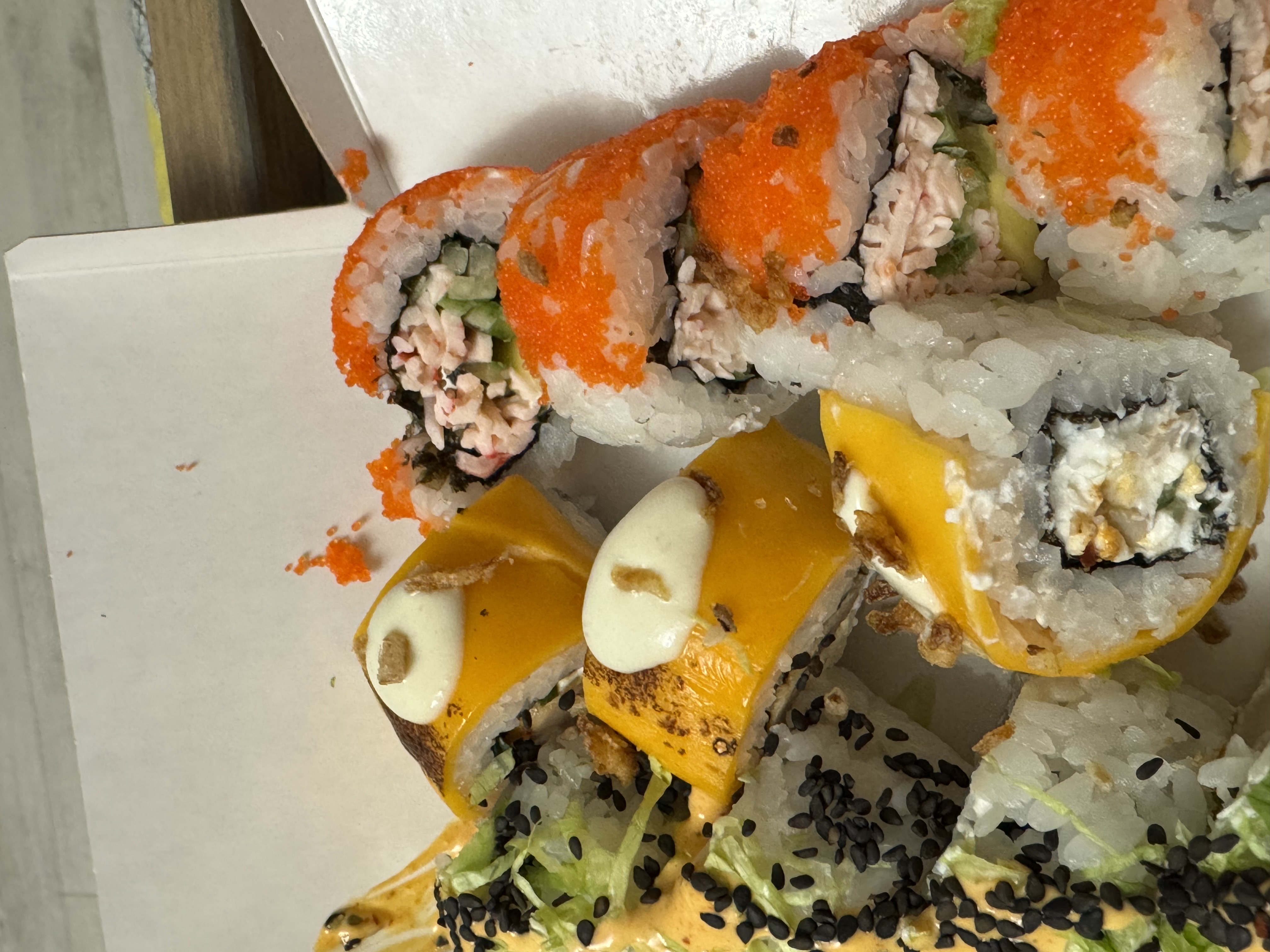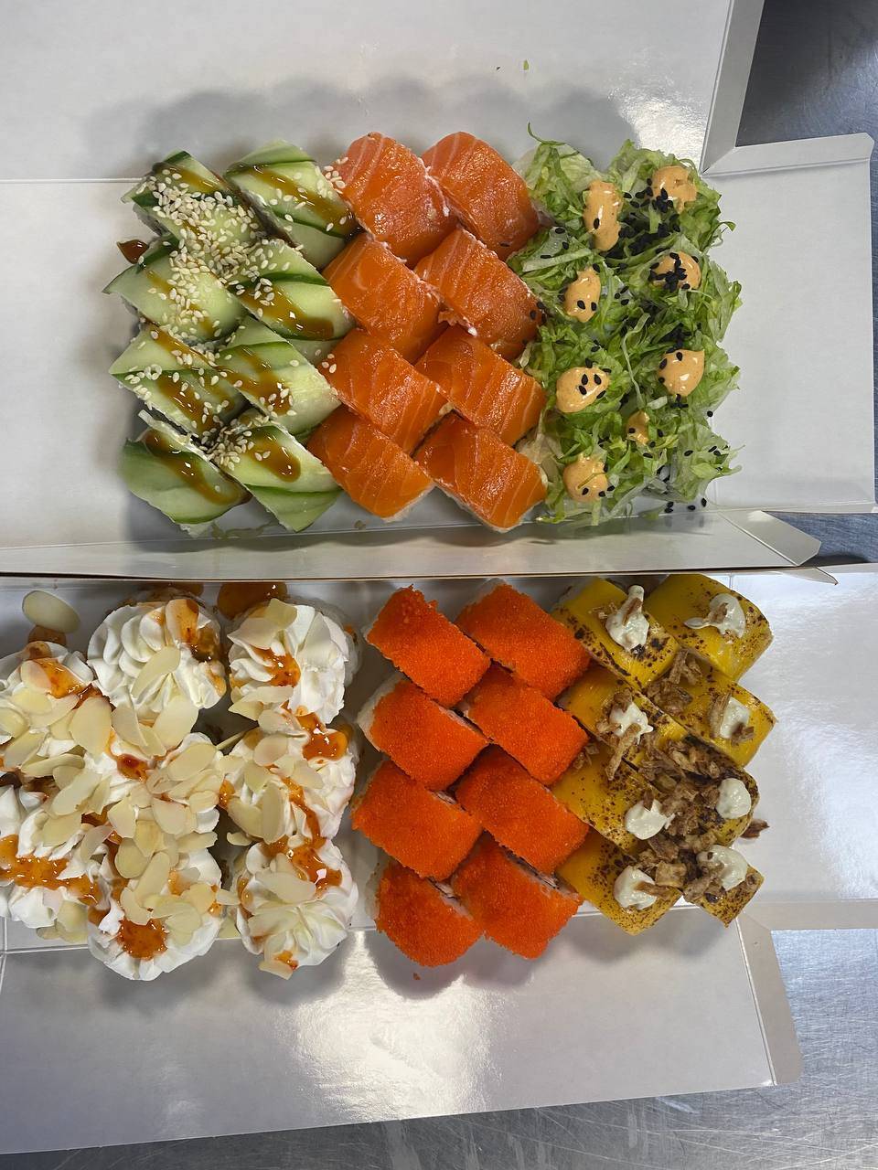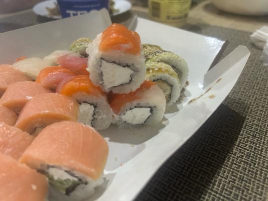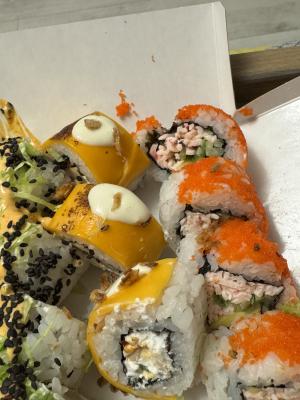 Состав: лосось, огурец, сливочный сыр, соус спайси, кунжут кимчи, соус терияки, кляр, сухари панко