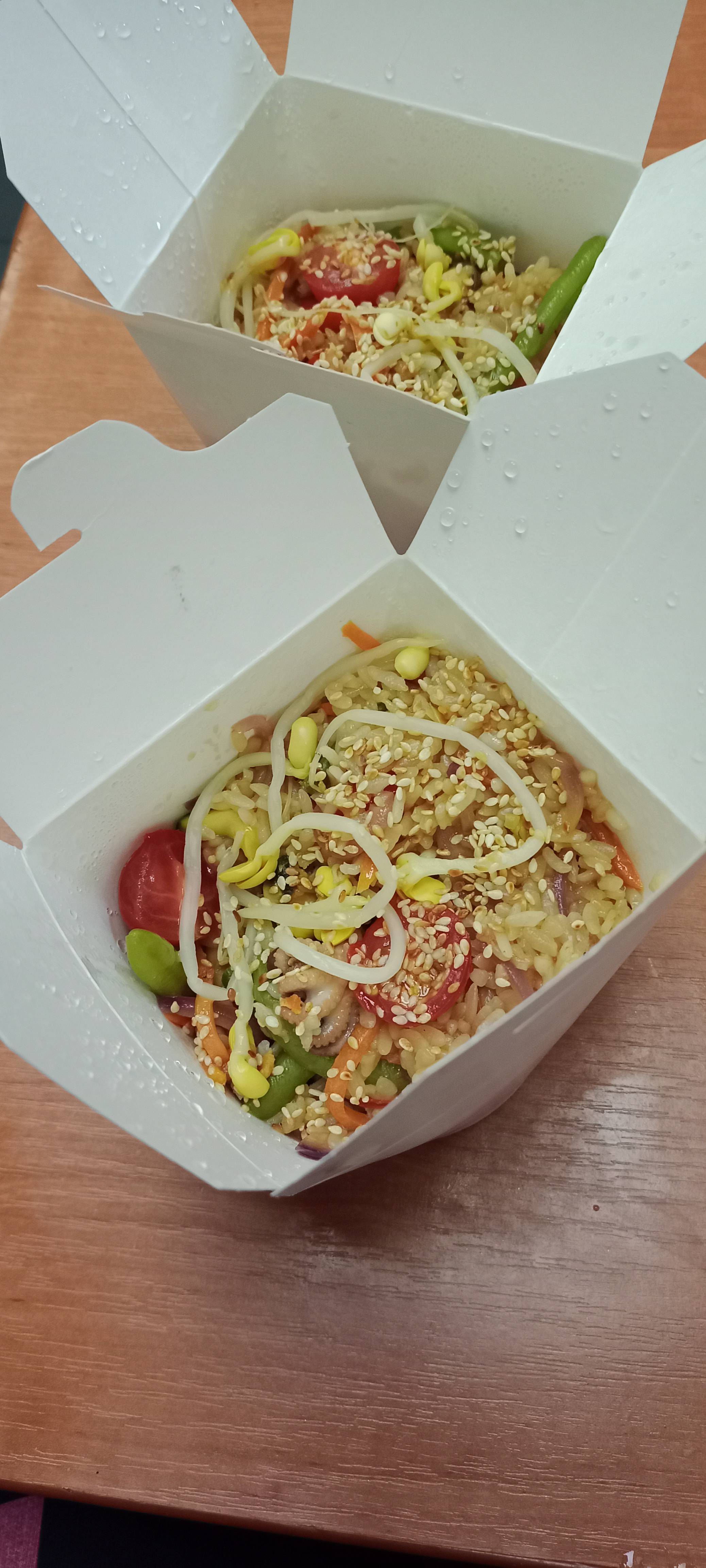 Состав: курица, цукини, лук красный, морковь, перец болгарский, масло чесночное, бобы эдомаме, рис, бульон вок, соус вок, соевые ростки, кунжут