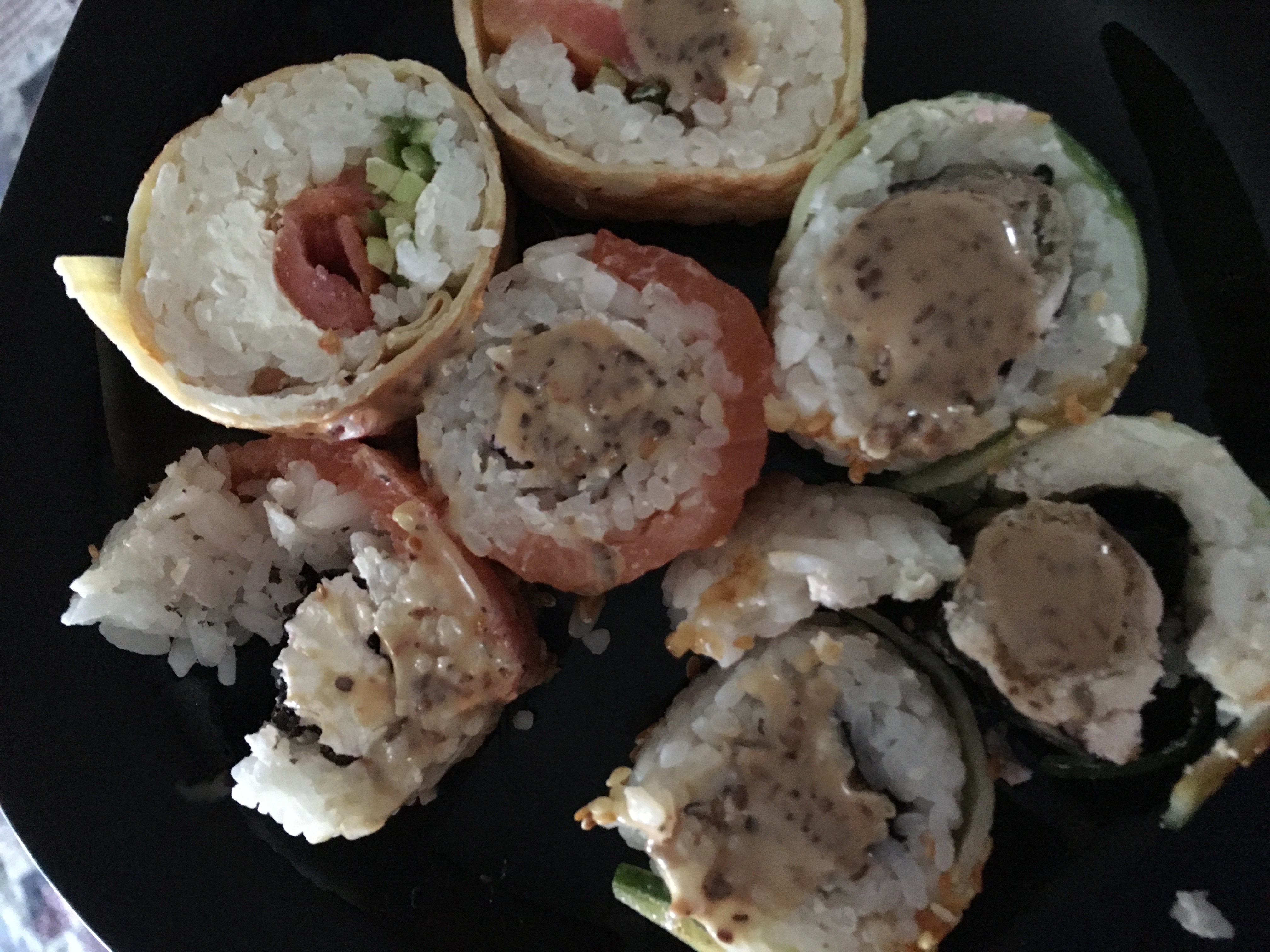 Состав: лосось, огурец, сливочный сыр, соус спайси, кунжут кимчи, соус терияки, кляр, сухари панко