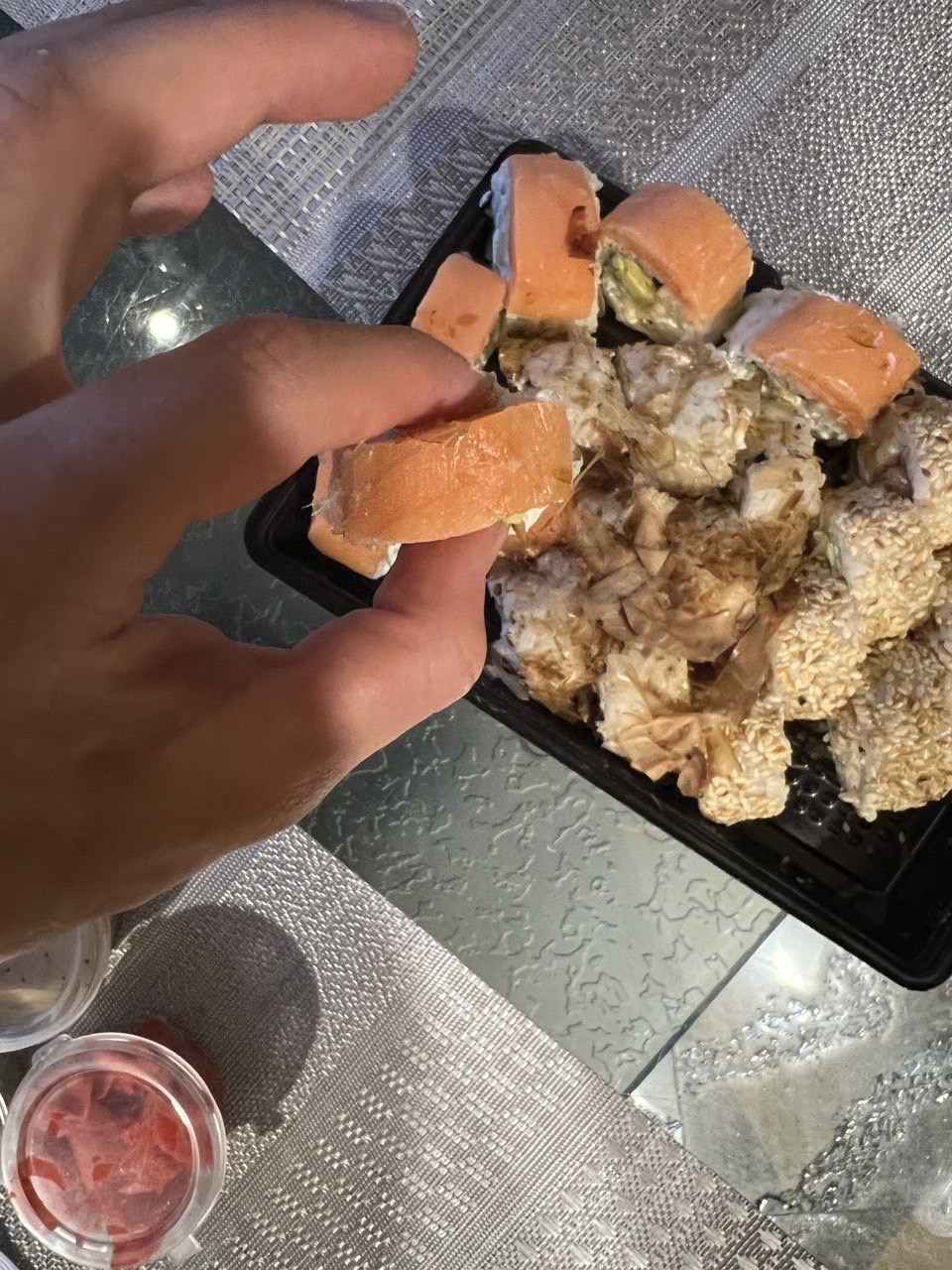 Состав: лосось, огурец, сливочный сыр, соус спайси, кунжут кимчи, соус терияки, кляр, сухари панко