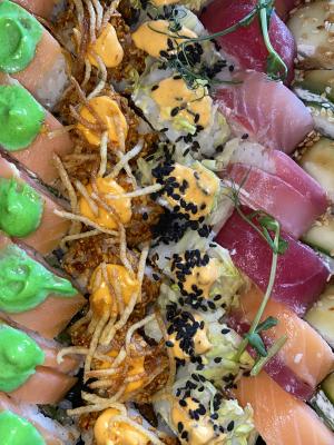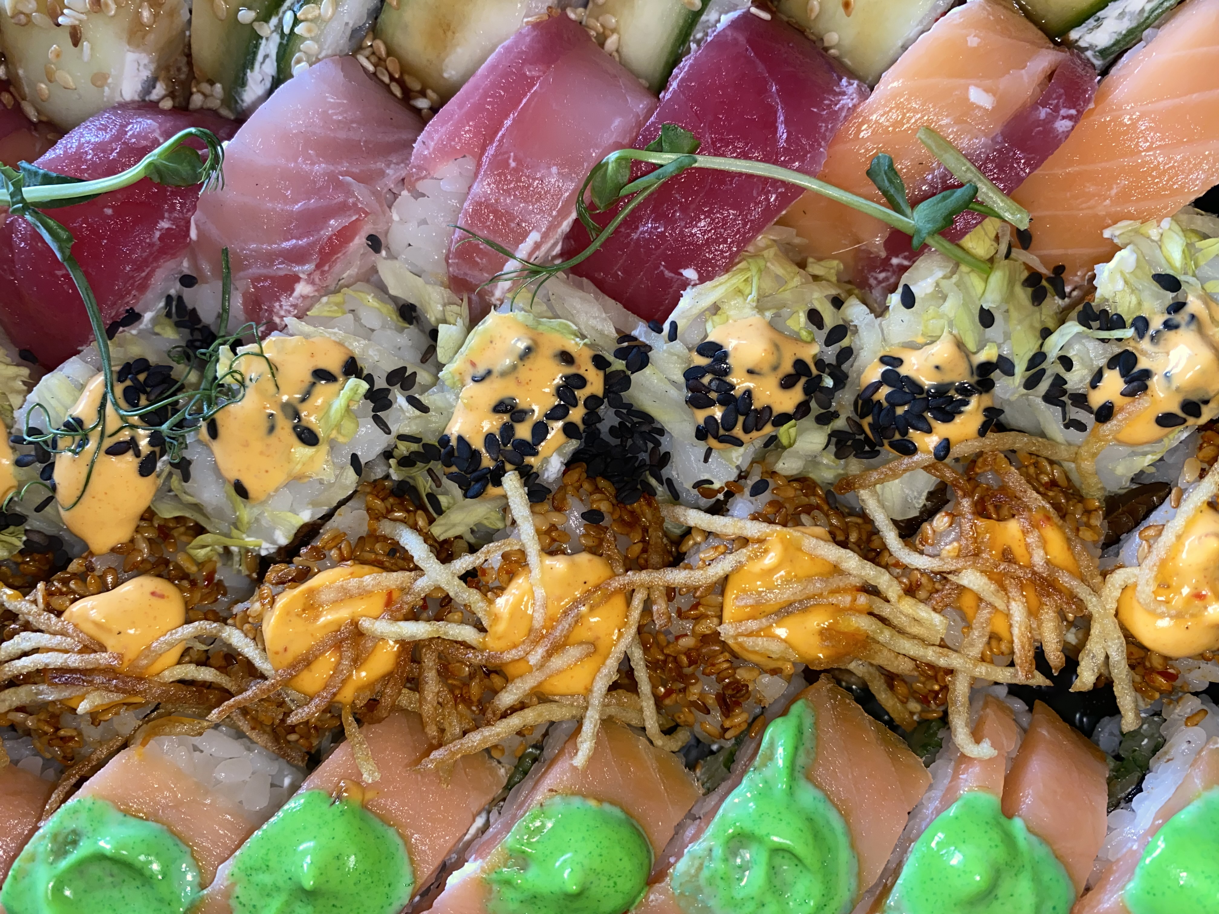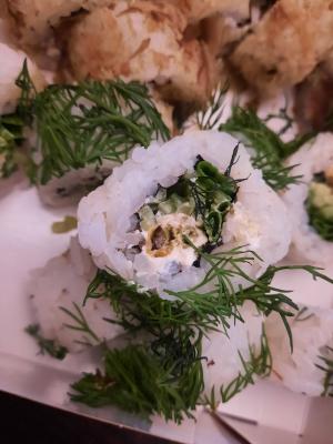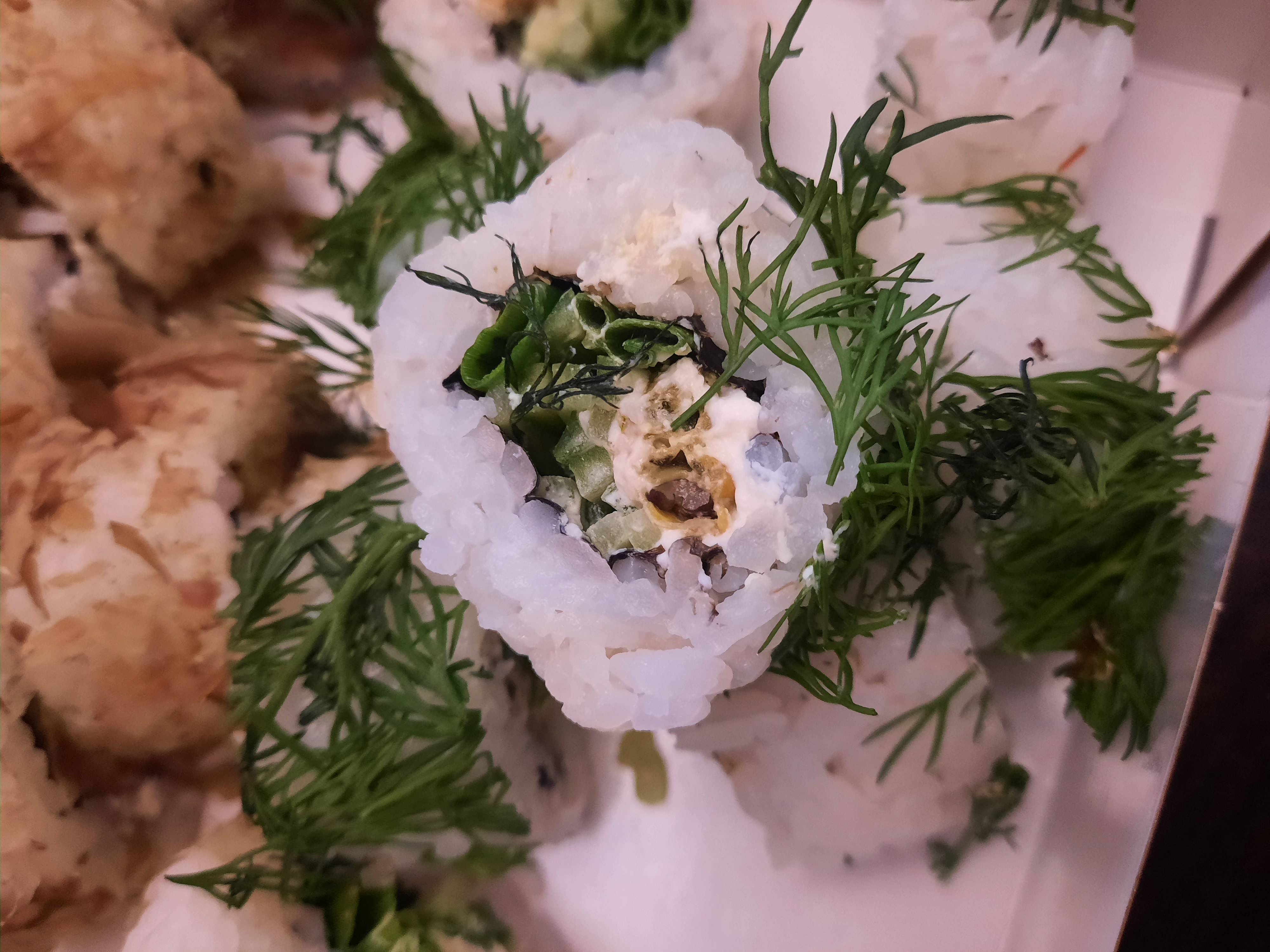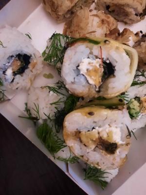 Состав: лосось, огурец, сливочный сыр, соус спайси, кунжут кимчи, соус терияки, кляр, сухари панко