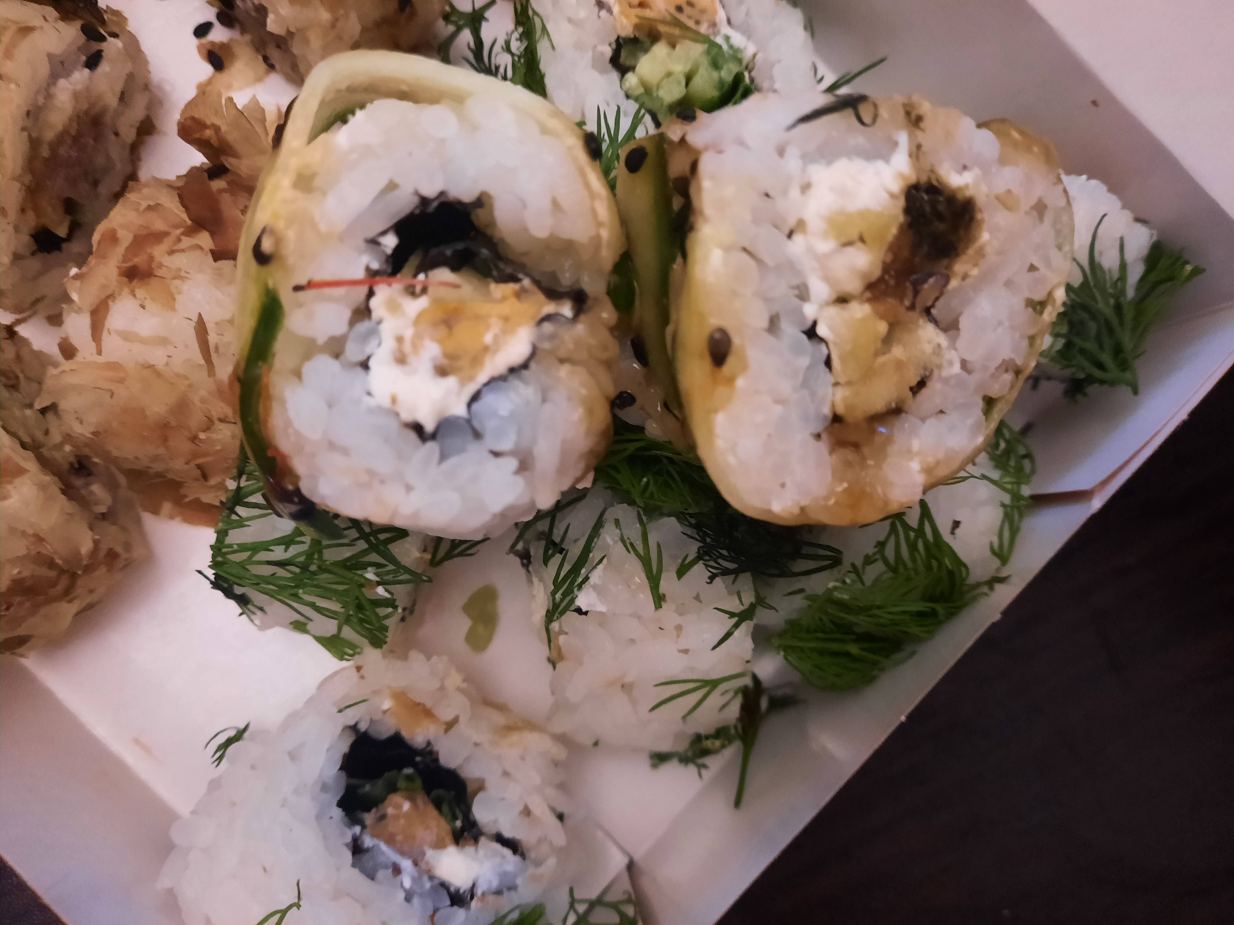 Состав: сунец, авокадо, сливочный сыр, кунжутное масло, картофель пай, соус терияки, кляр, сухари панко
