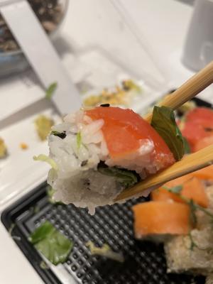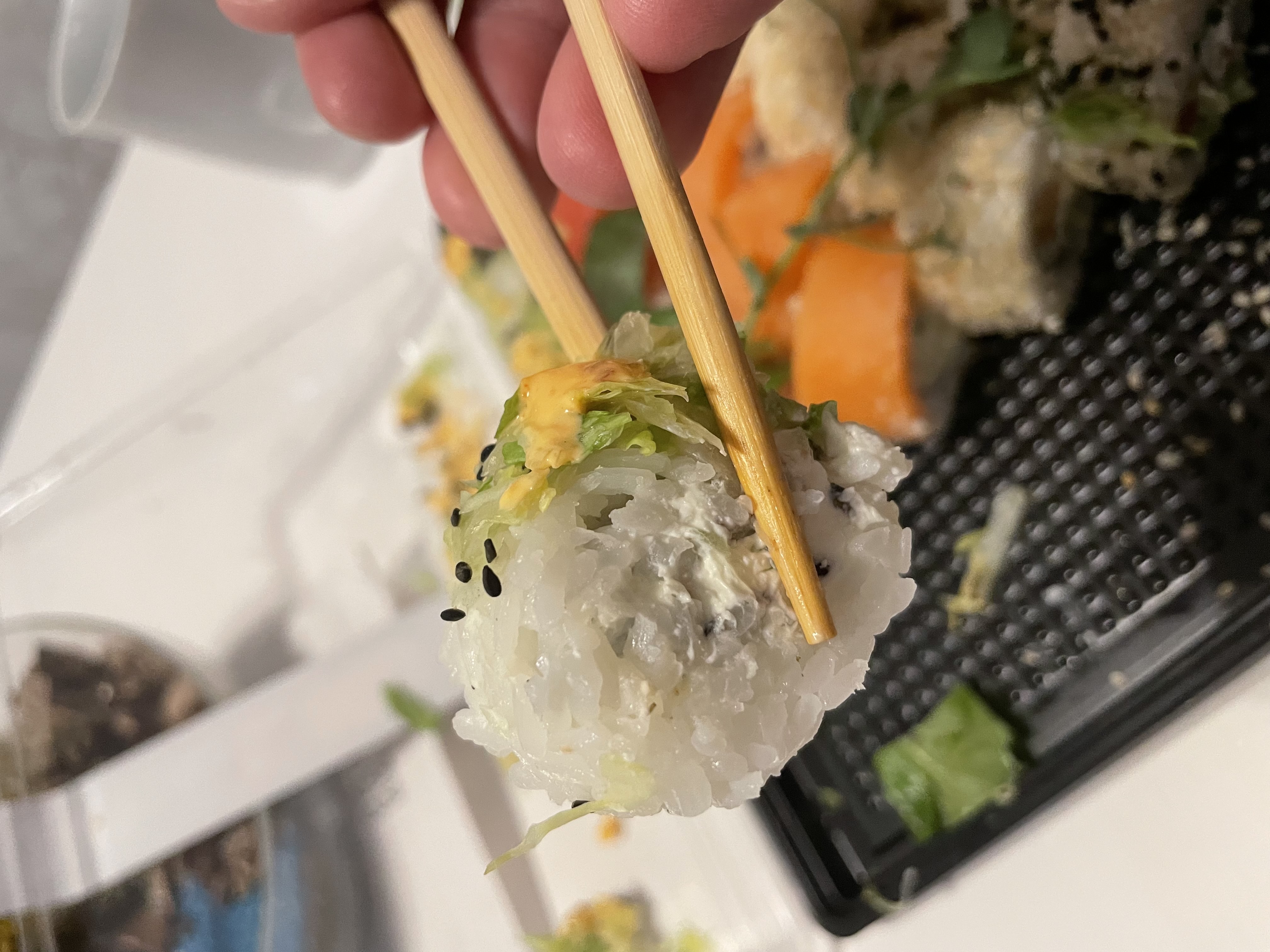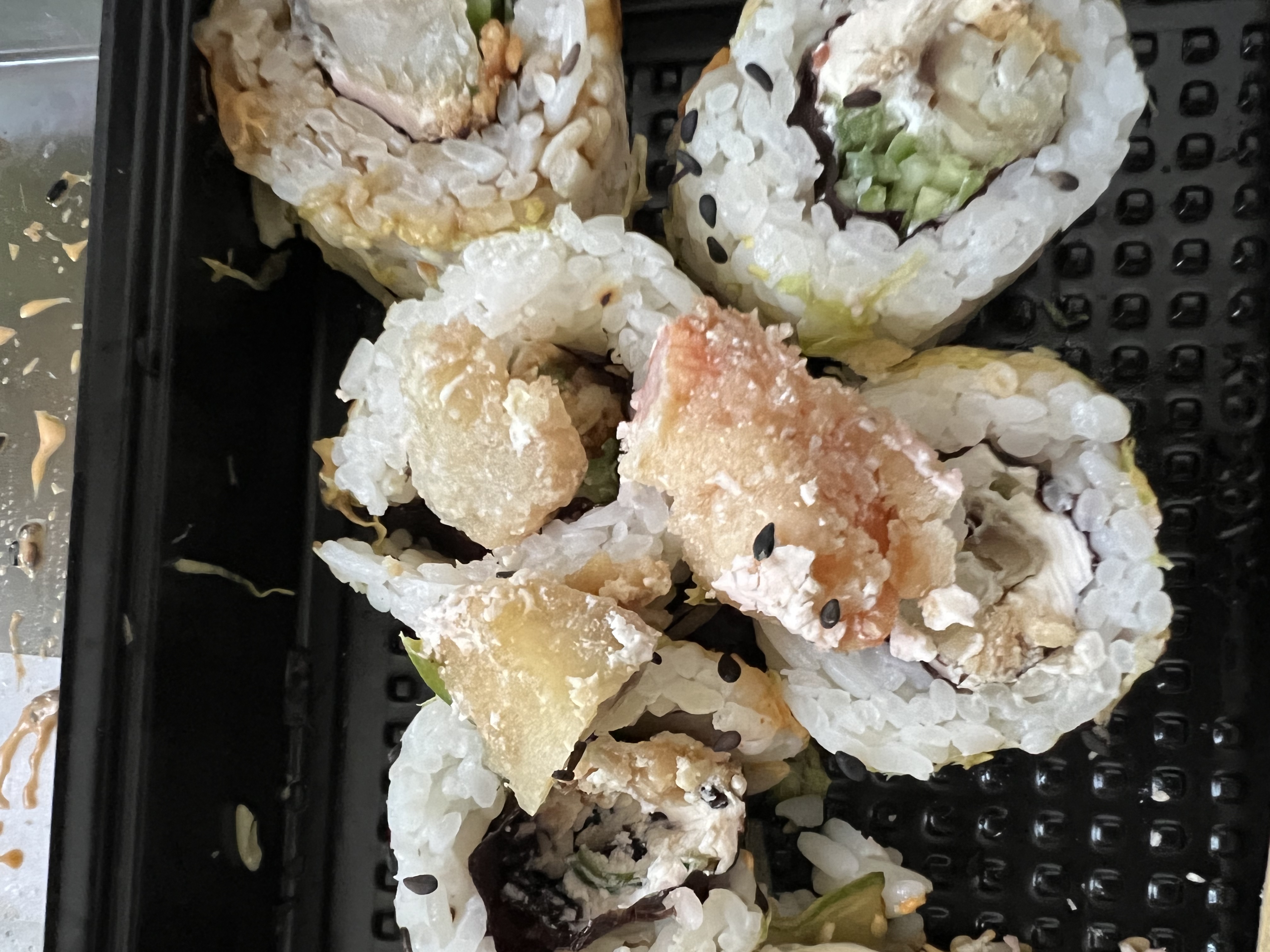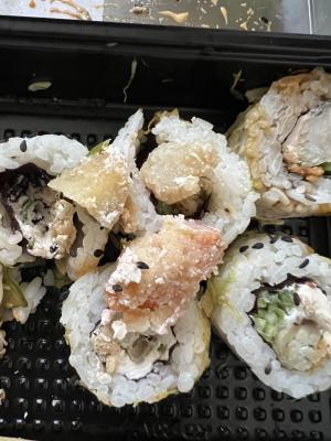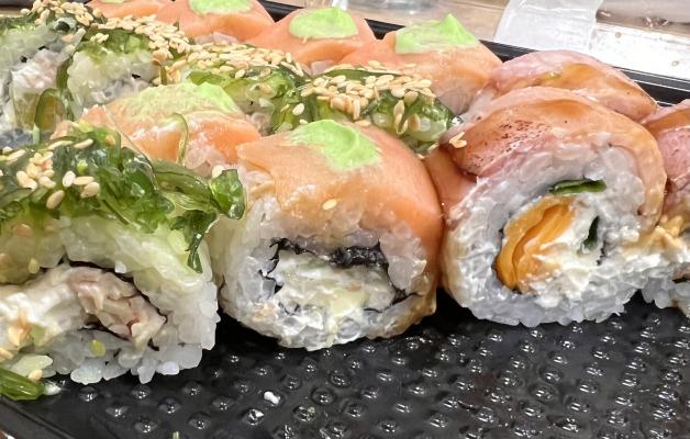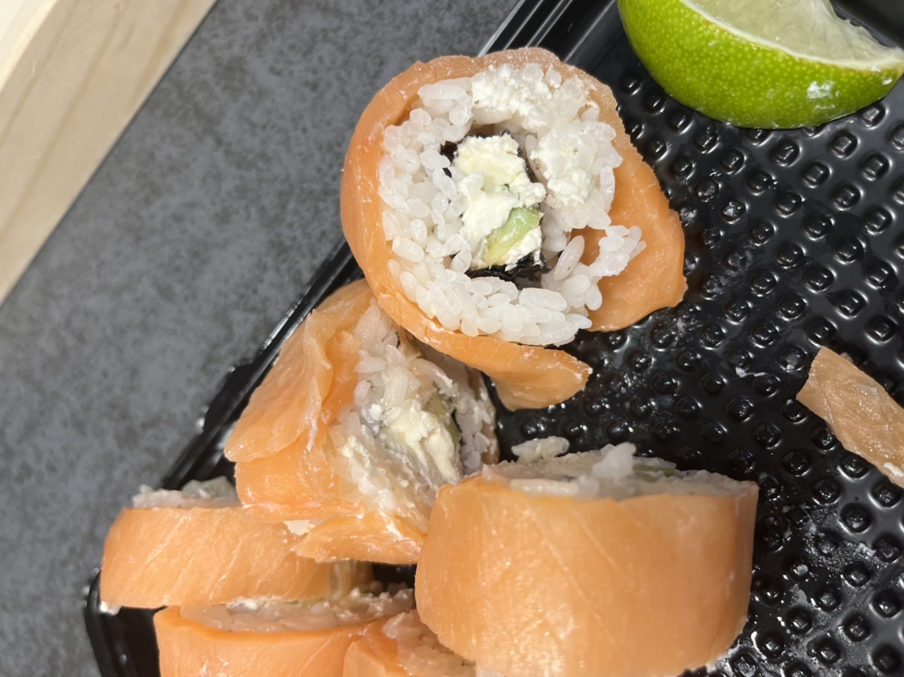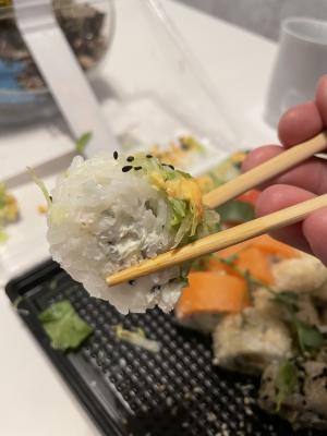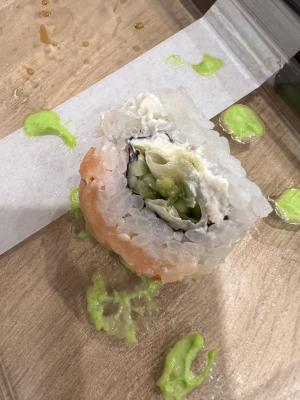 Состав: лосось, огурец, сливочный сыр, соус спайси, кунжут кимчи, соус терияки, кляр, сухари панко