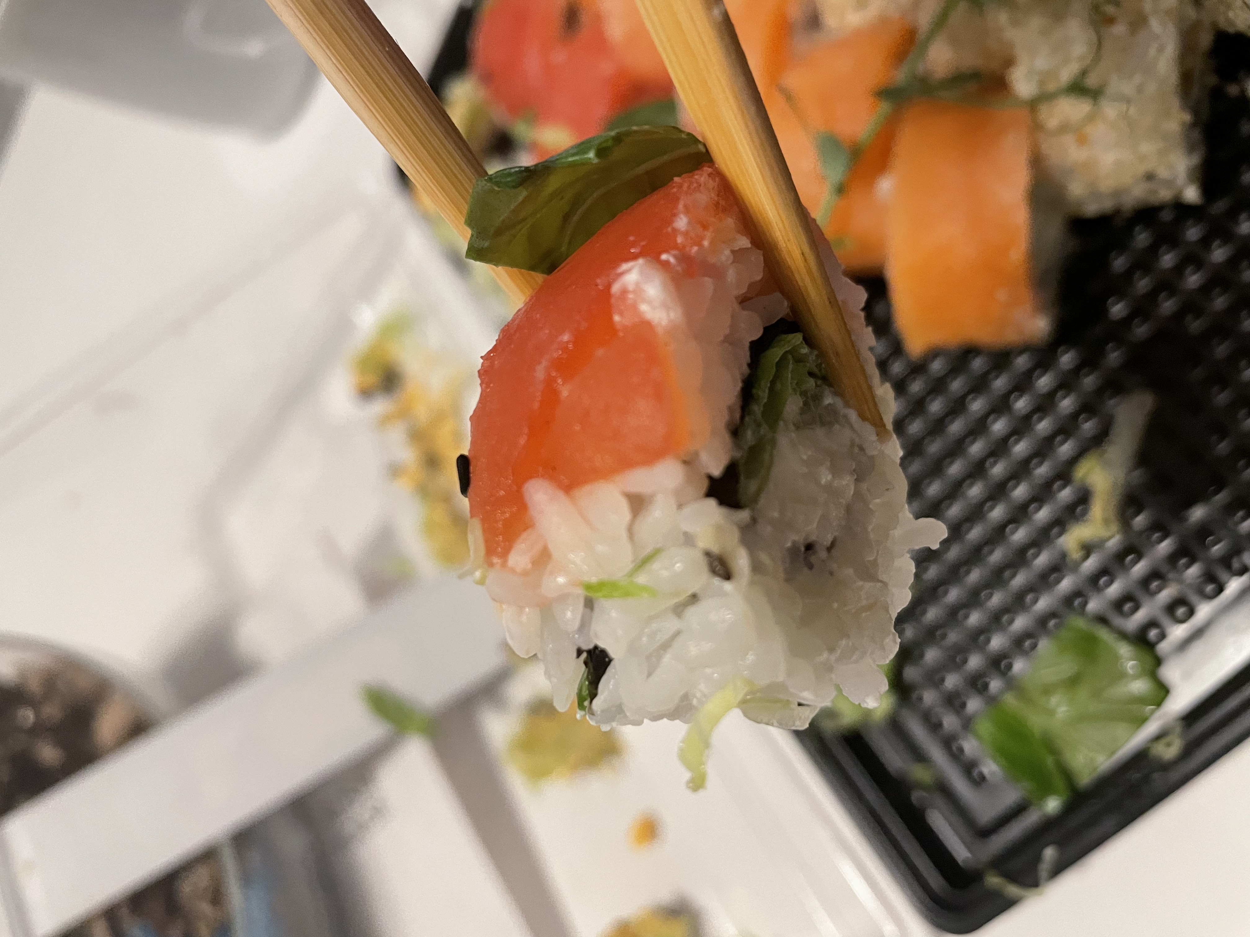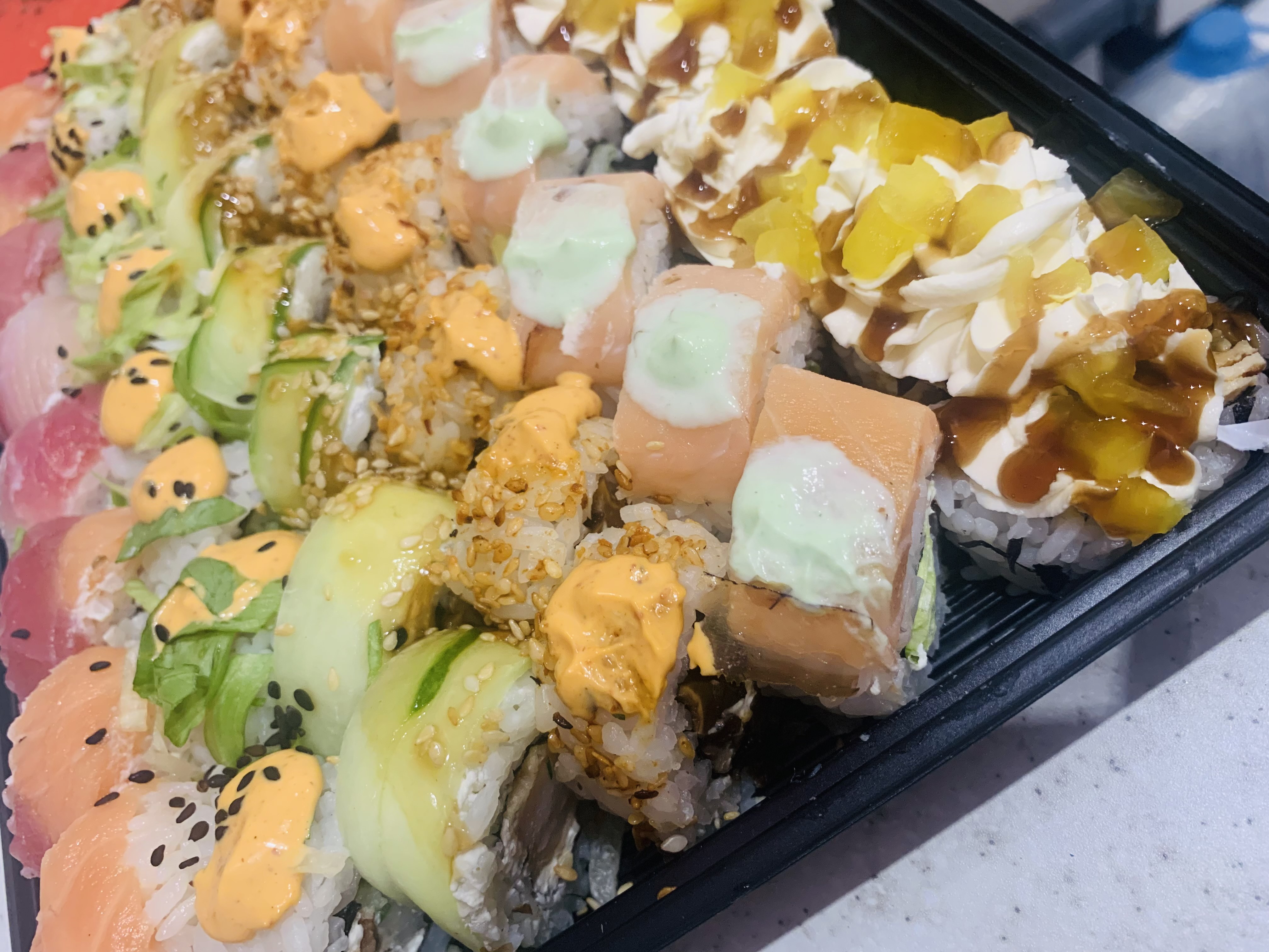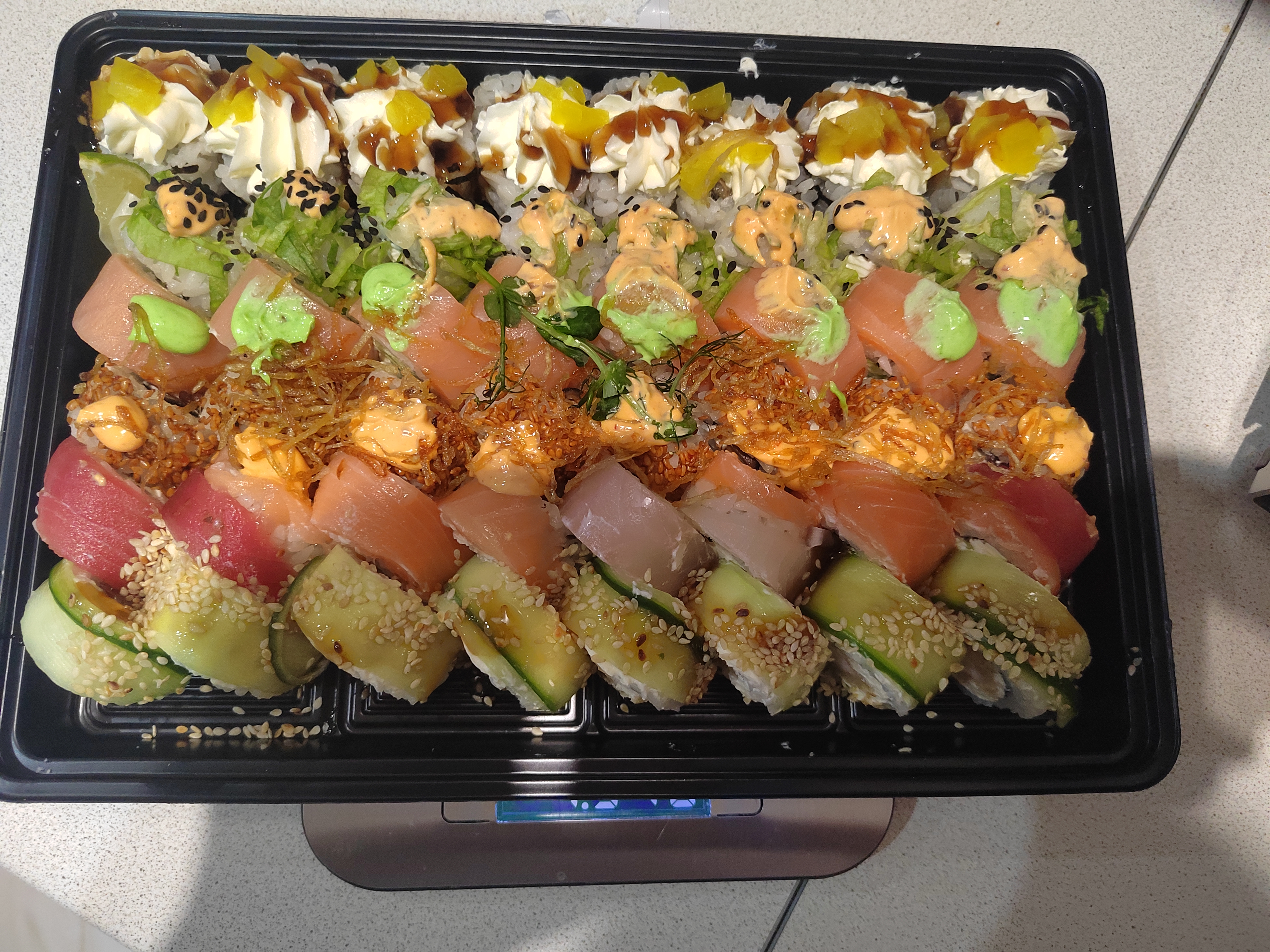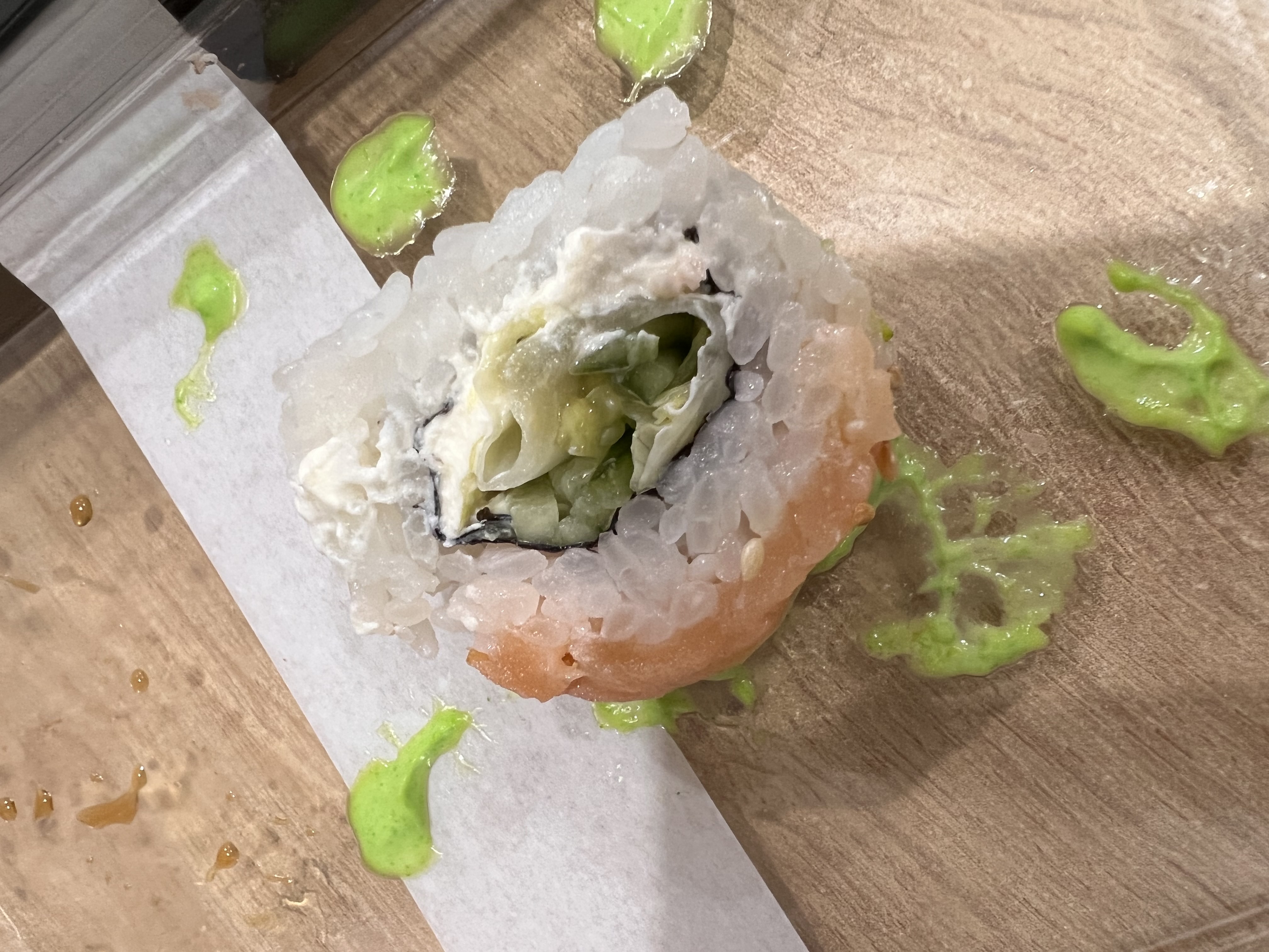 Состав: лосось, огурец, сливочный сыр, соус спайси, кунжут кимчи, соус терияки, кляр, сухари панко