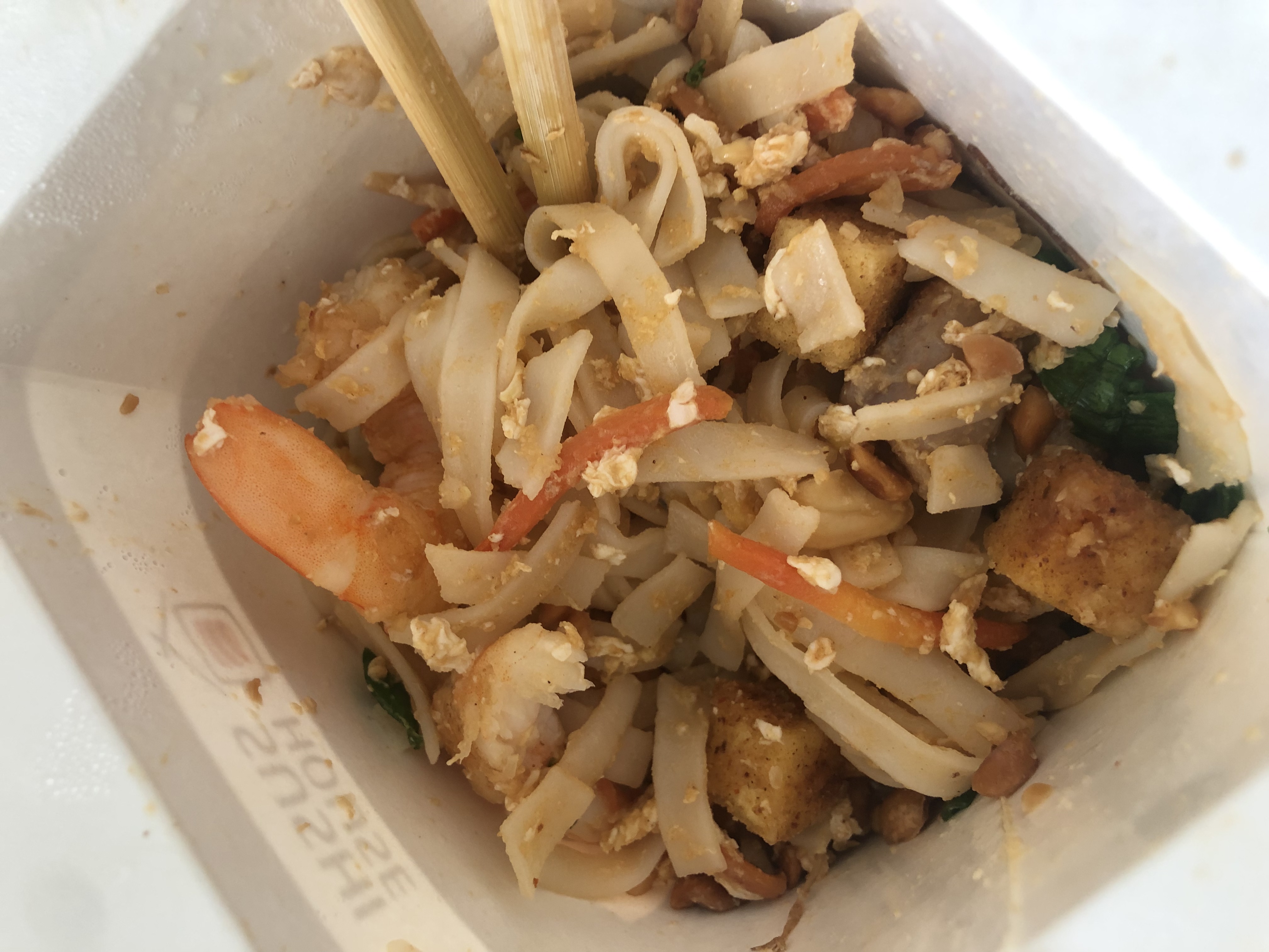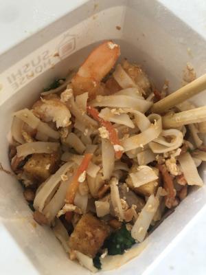 Состав: рисовая лапша, куриное бедро, креветки, яйцо, сыр тофу, морковь, соевые ростки, арахис, кунжут, лук зеленый, перец Чили, лайм, соус Пад Тай