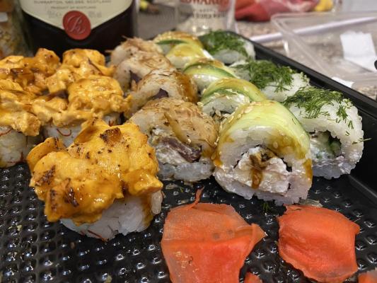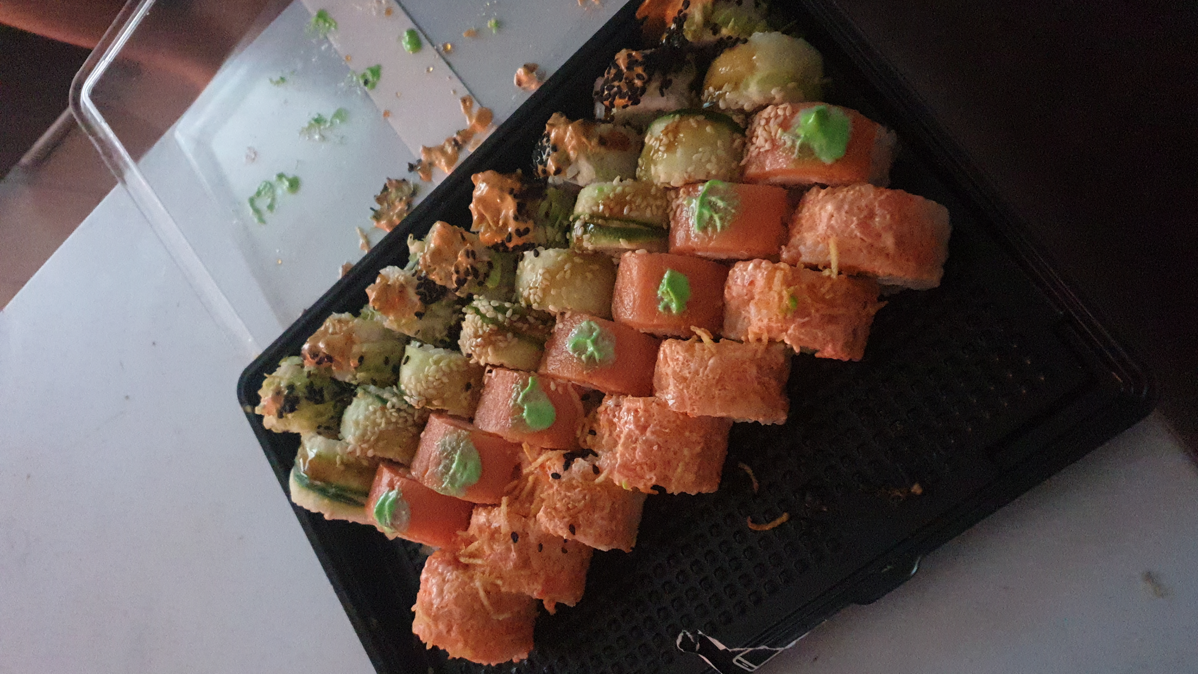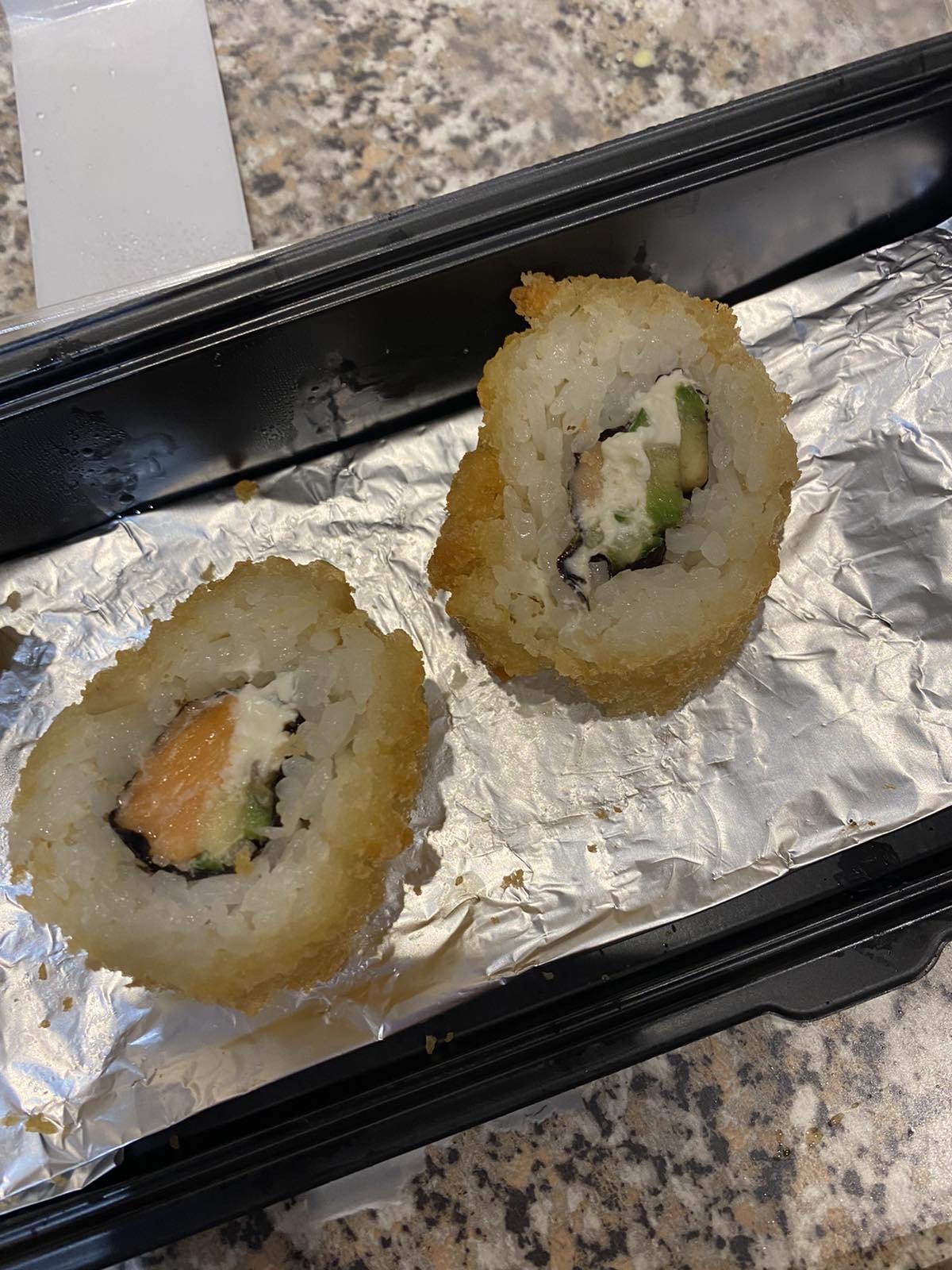 Состав: лосось, огурец, сливочный сыр, соус спайси, кунжут кимчи, соус терияки, кляр, сухари панко