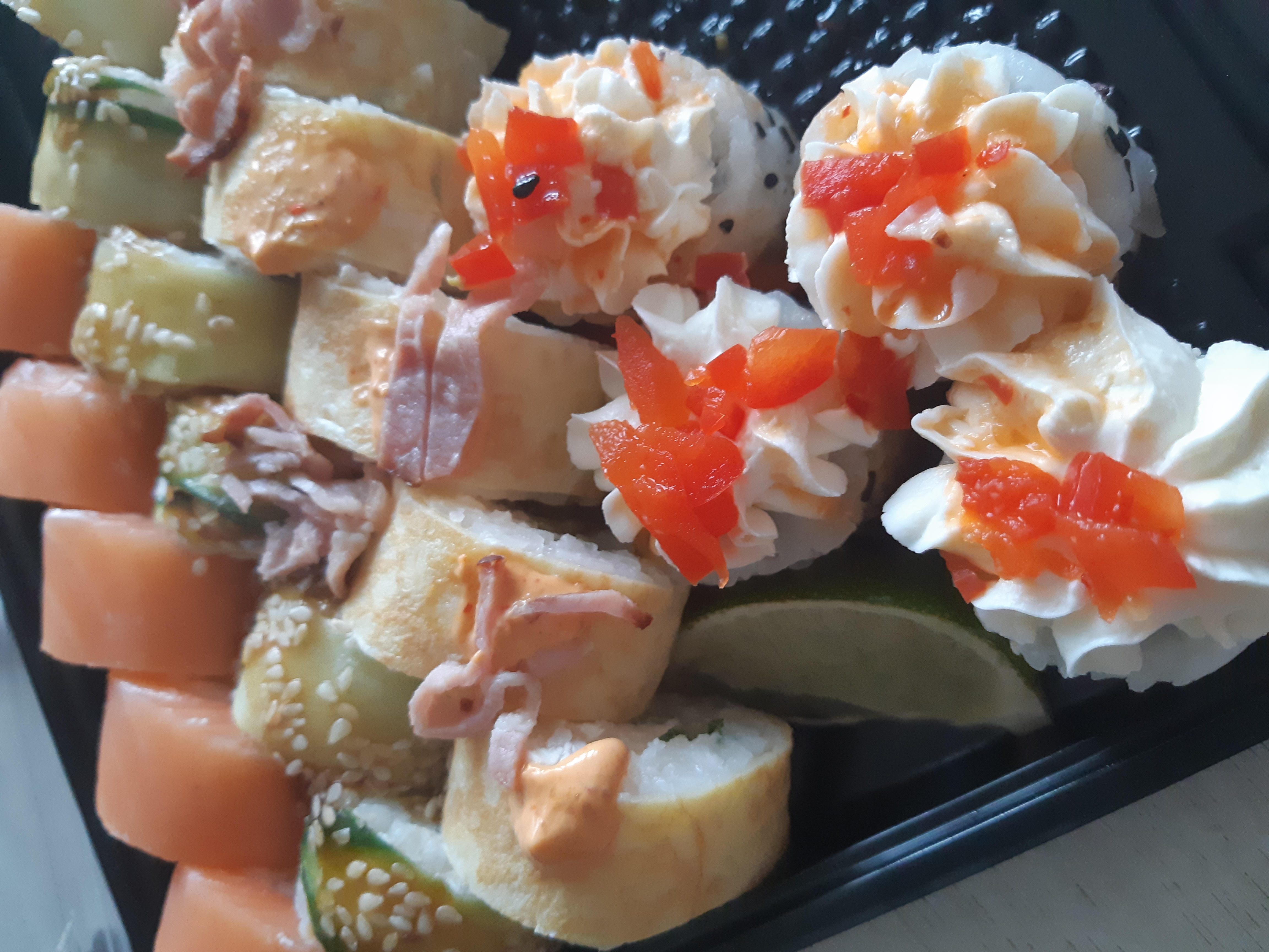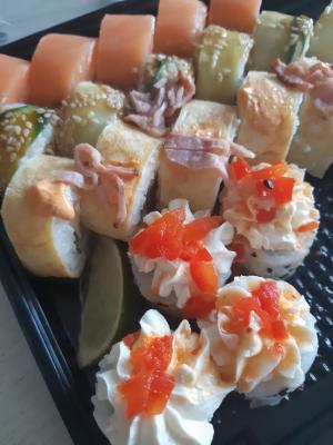 Состав: лосось, огурец, сливочный сыр, соус спайси, кунжут кимчи, соус терияки, кляр, сухари панко