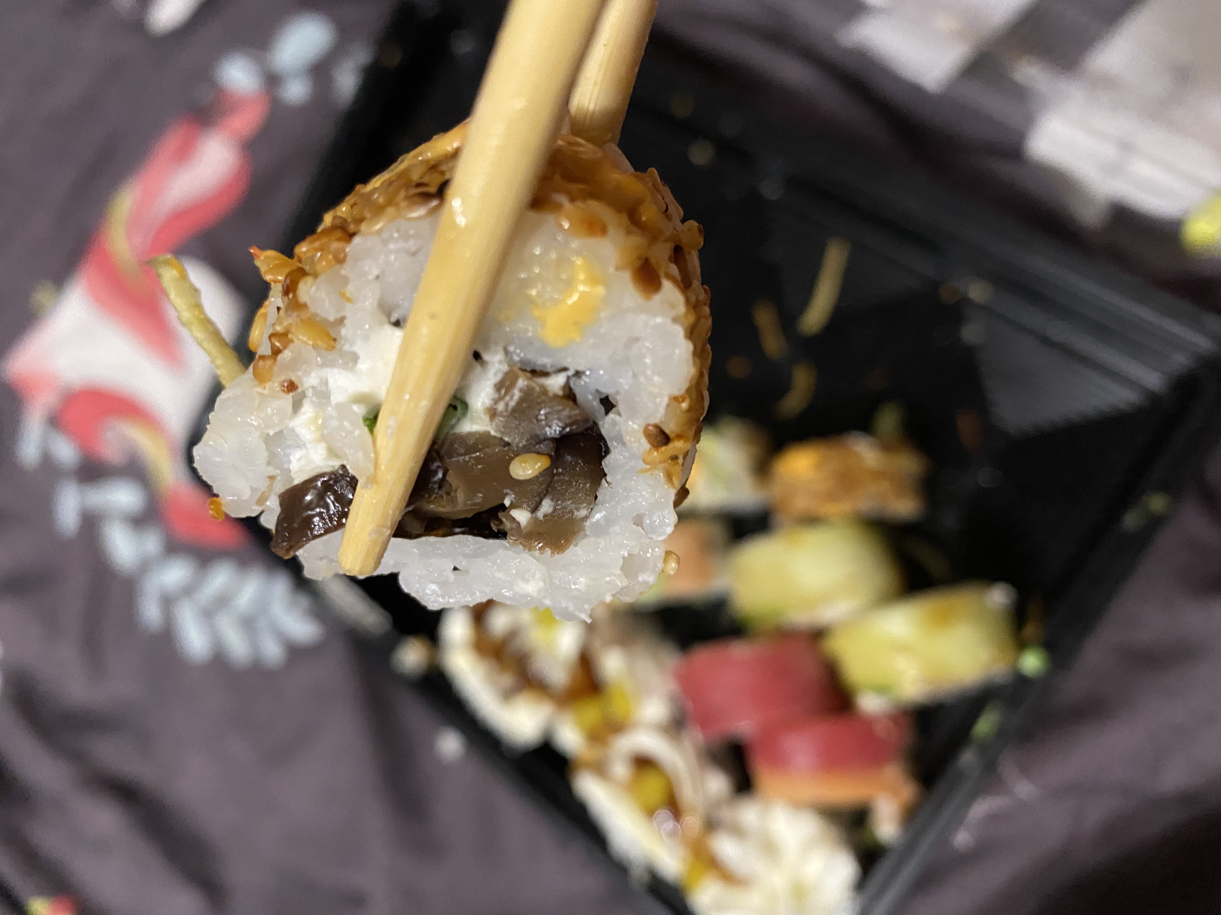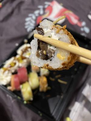 Состав: сунец, авокадо, сливочный сыр, кунжутное масло, картофель пай, соус терияки, кляр, сухари панко