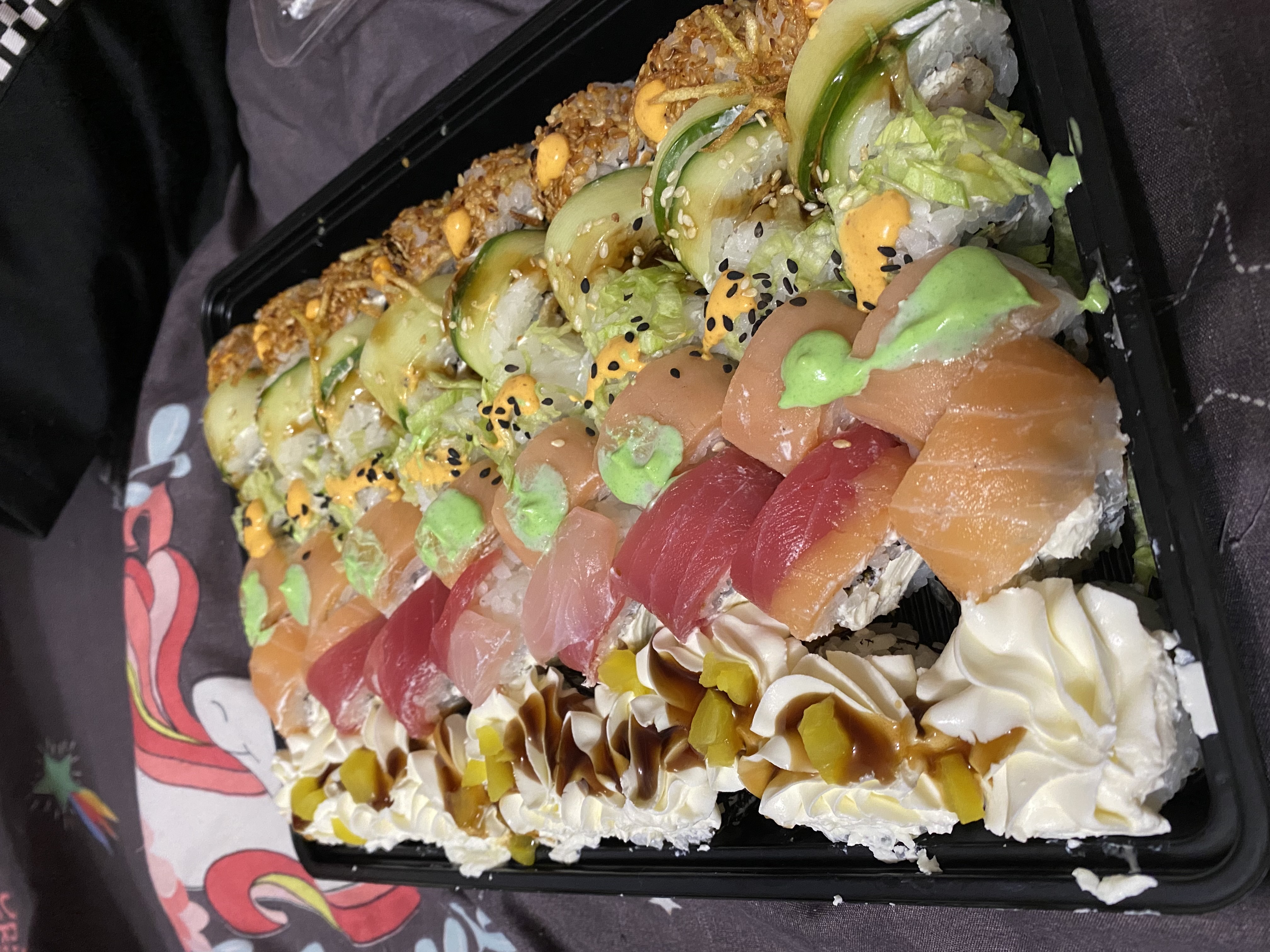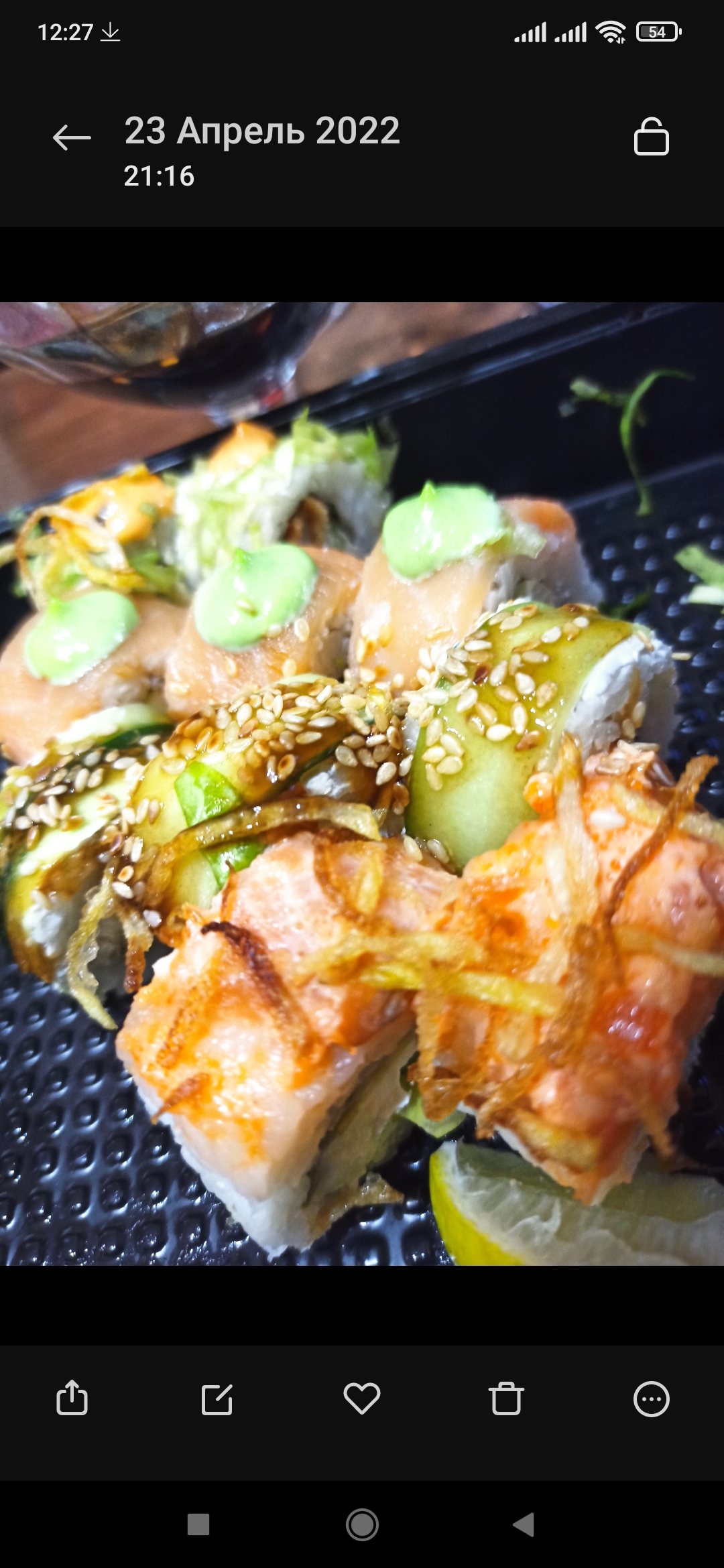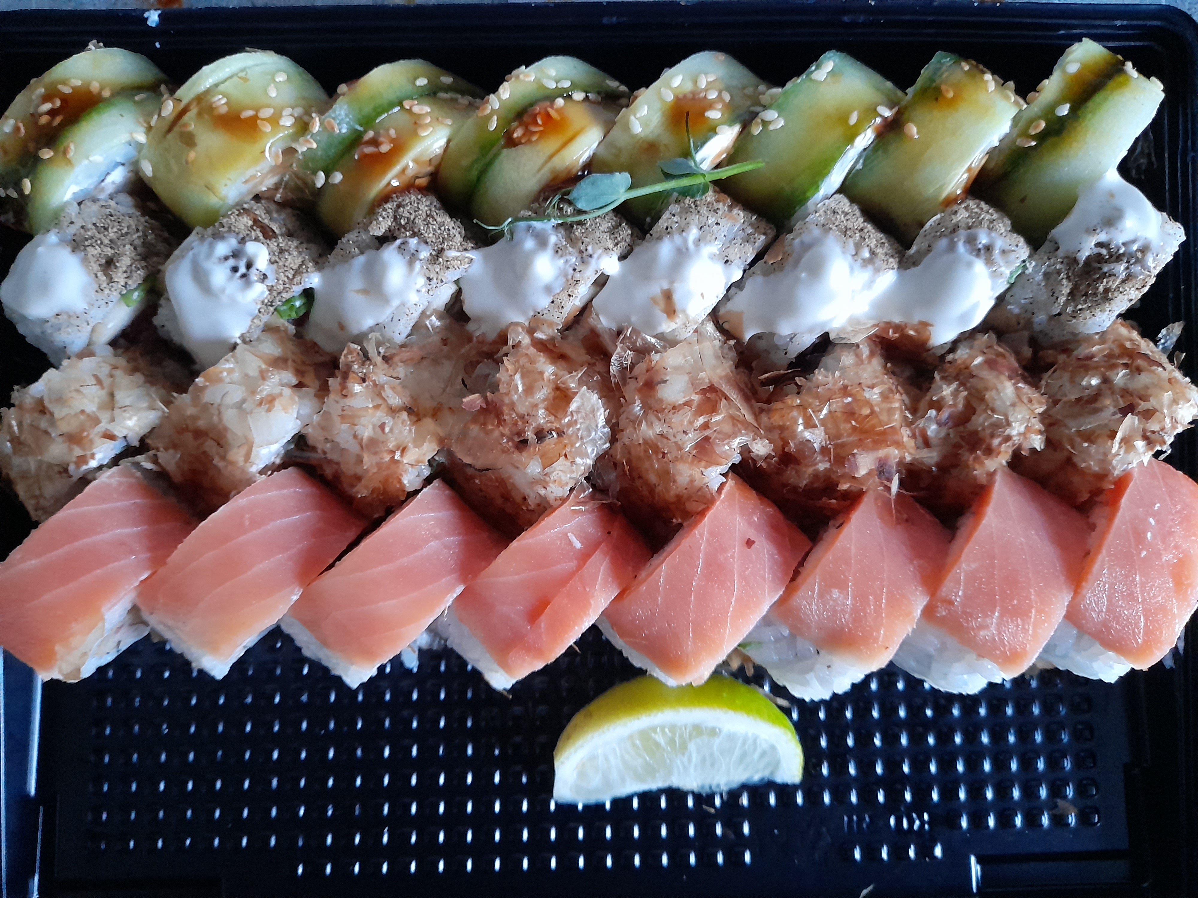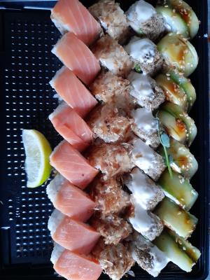 Состав: лосось, огурец, сливочный сыр, соус спайси, кунжут кимчи, соус терияки, кляр, сухари панко