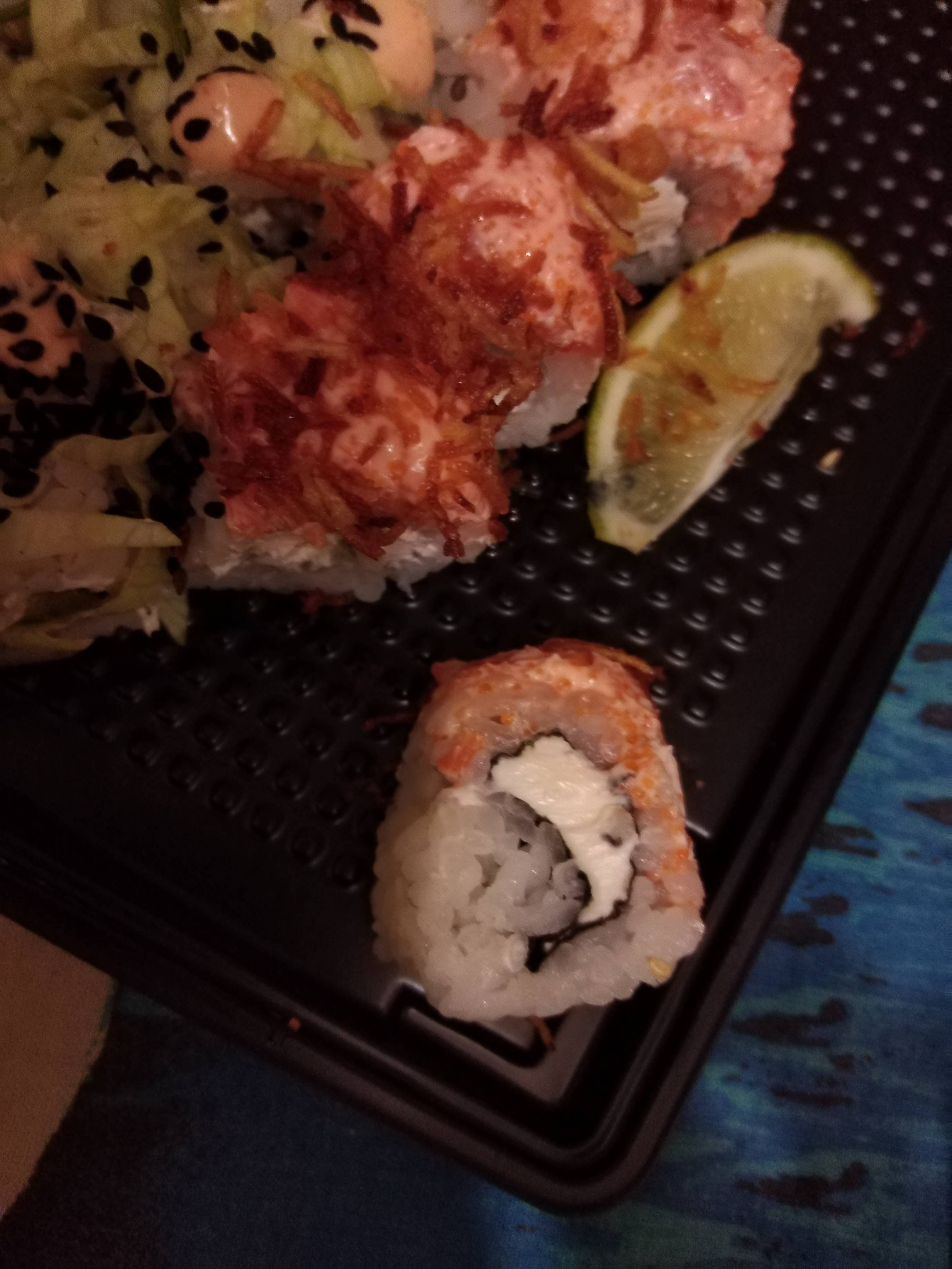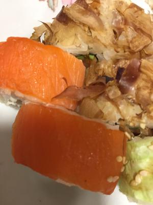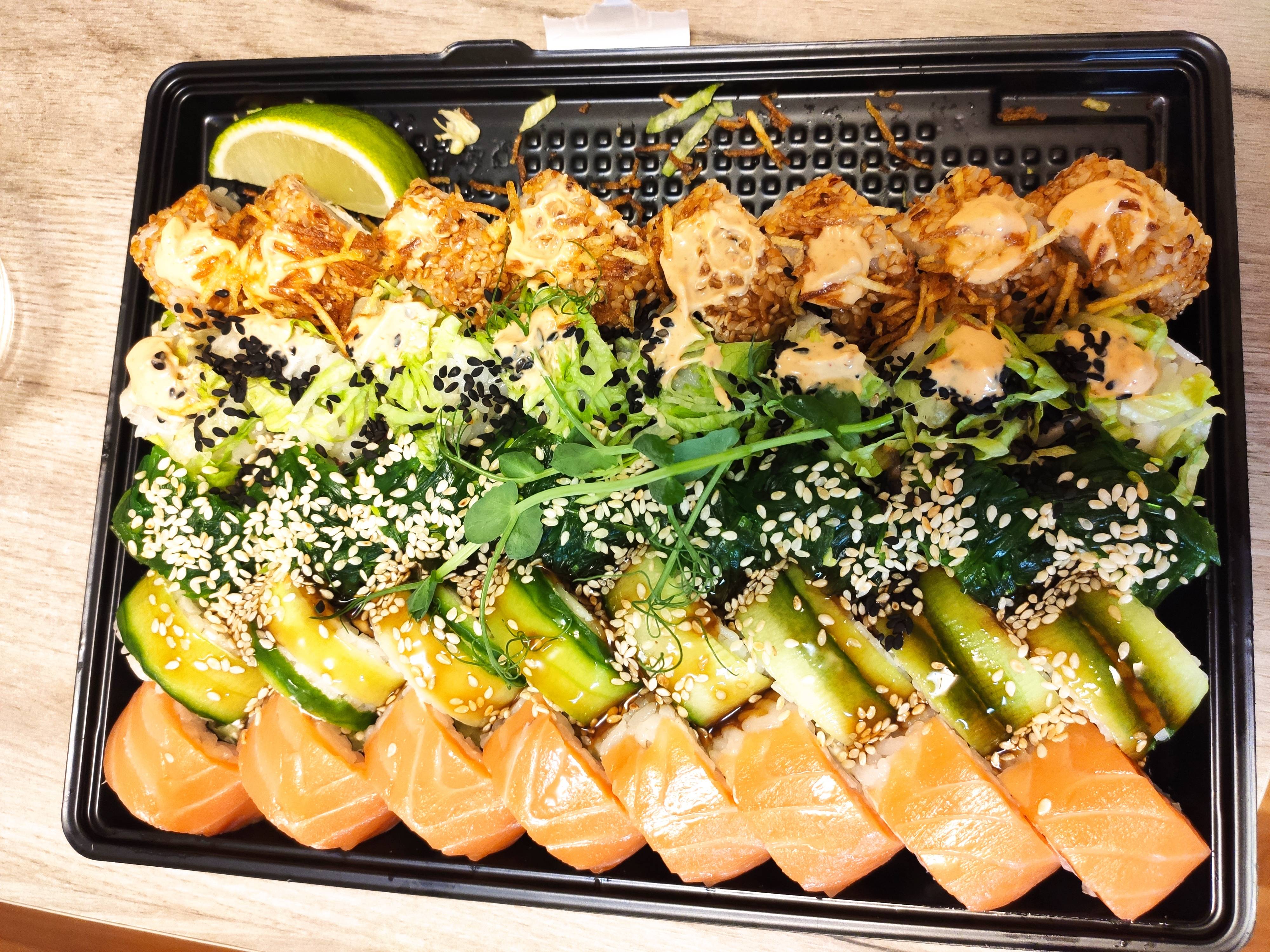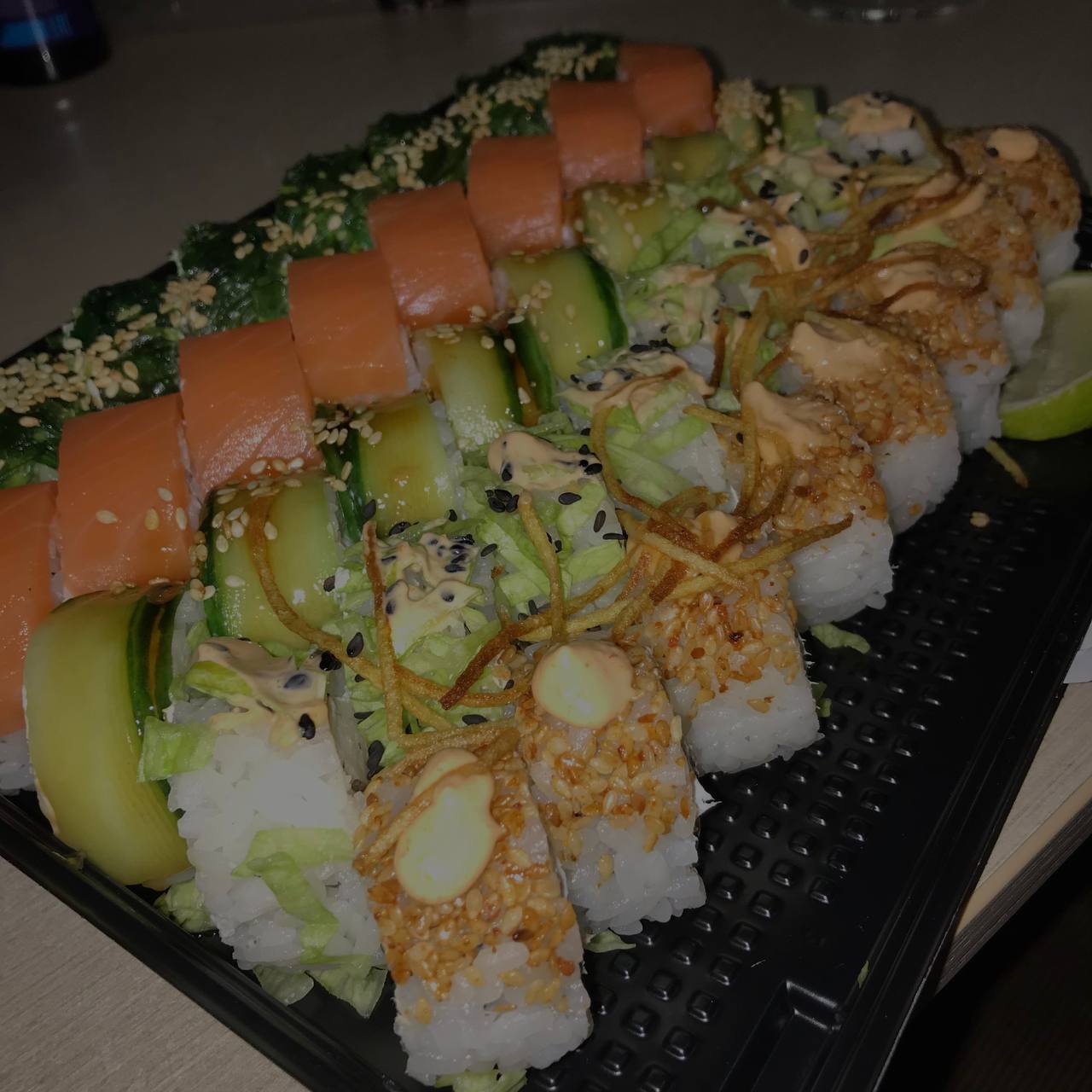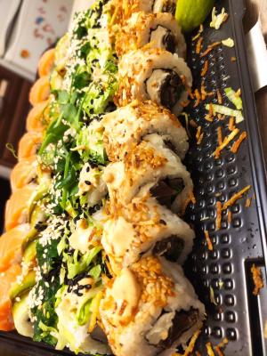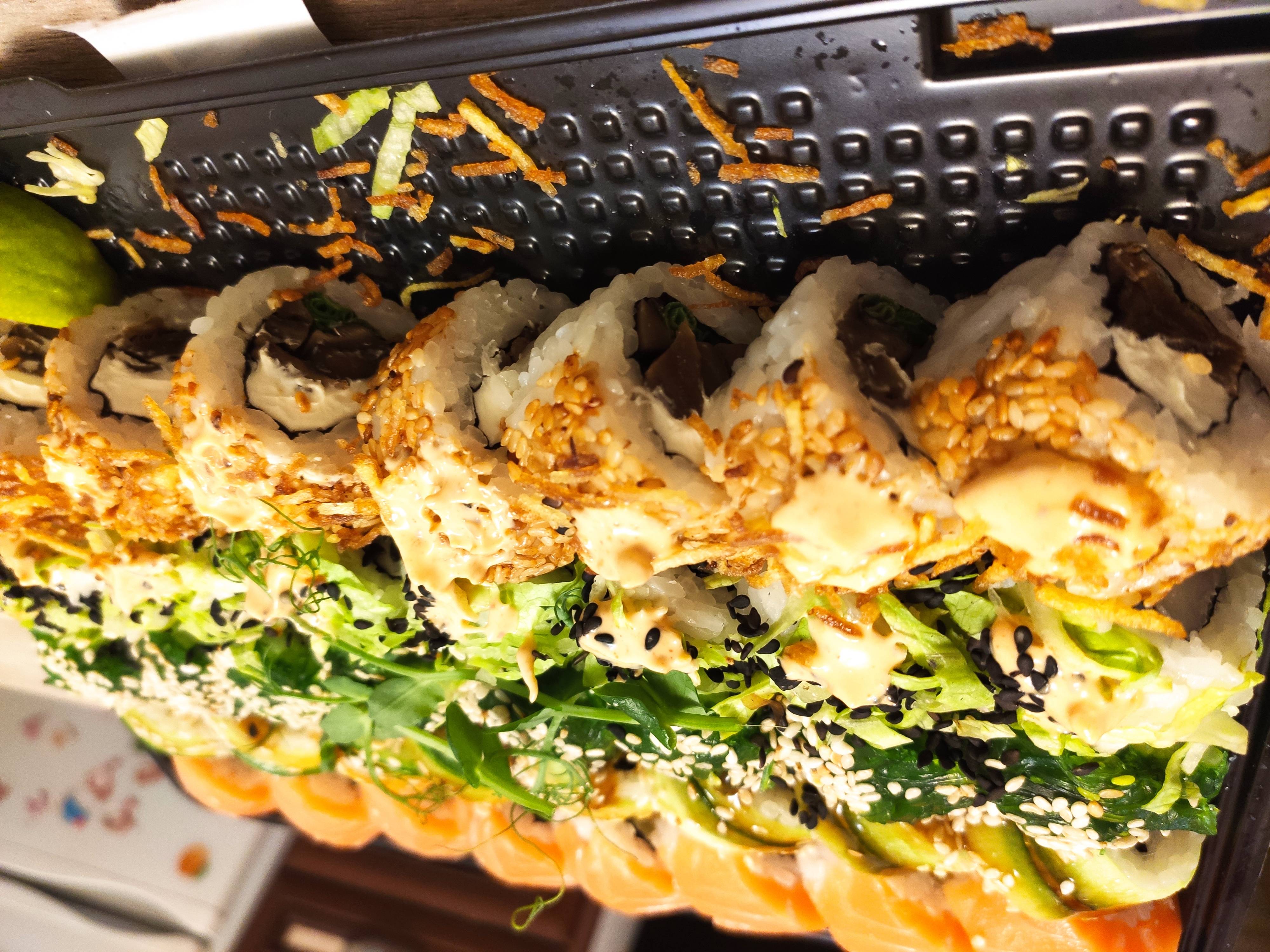 Состав: лосось, огурец, сливочный сыр, соус спайси, кунжут кимчи, соус терияки, кляр, сухари панко