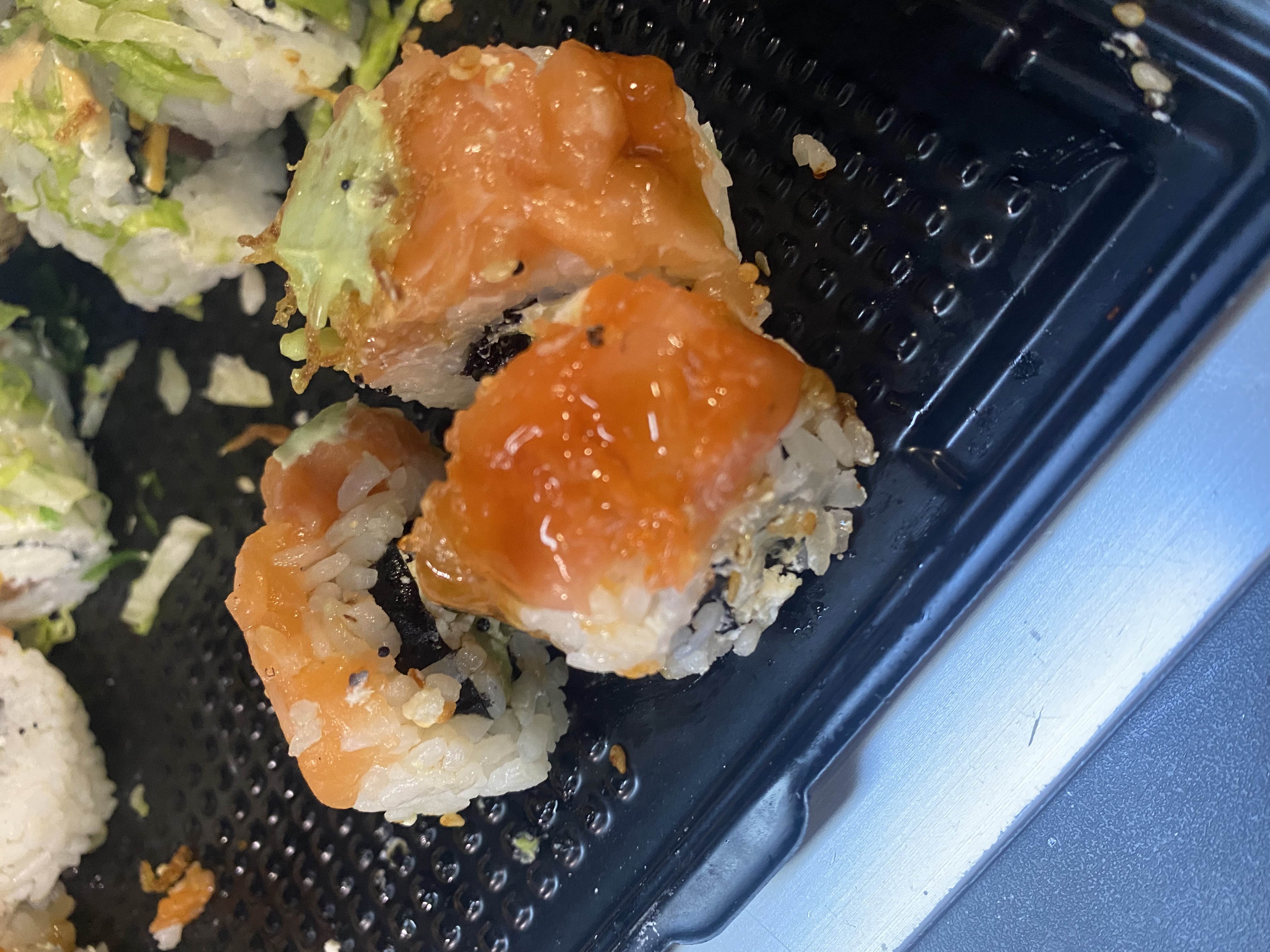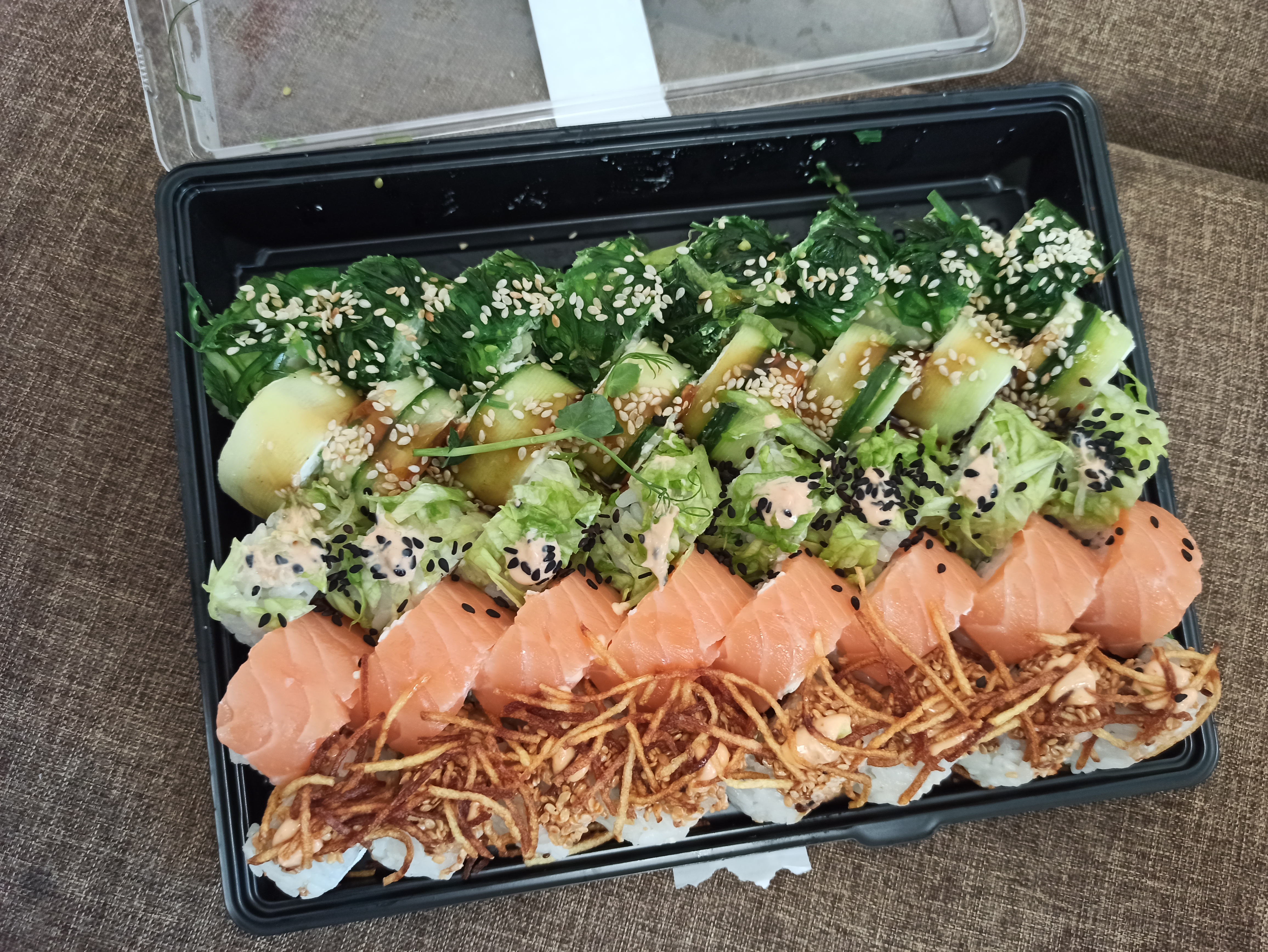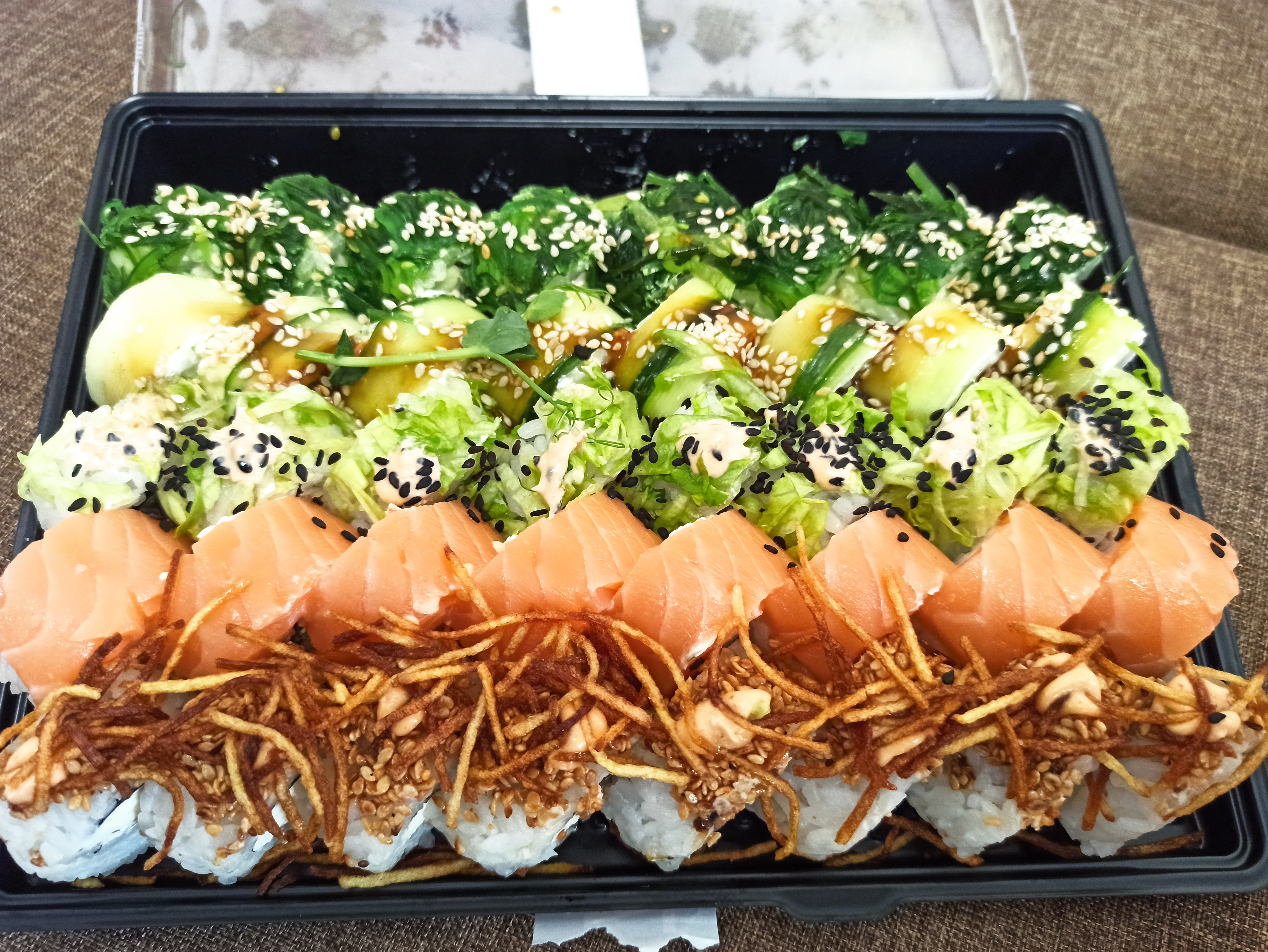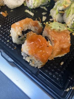 Состав: лосось, огурец, сливочный сыр, соус спайси, кунжут кимчи, соус терияки, кляр, сухари панко