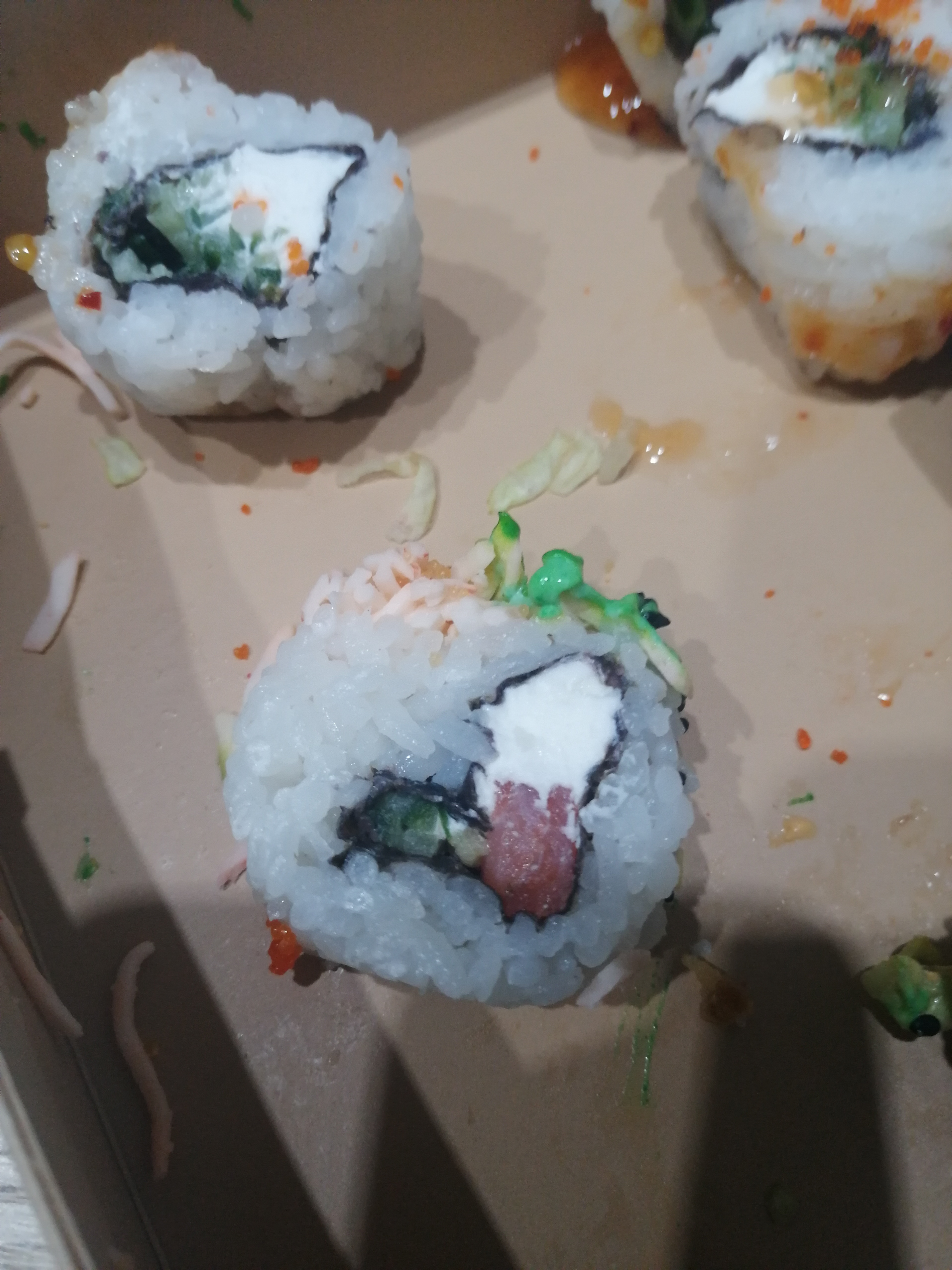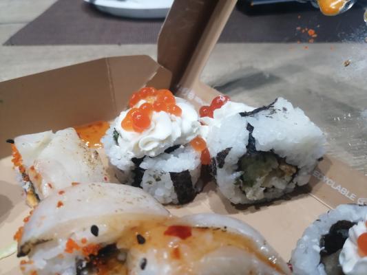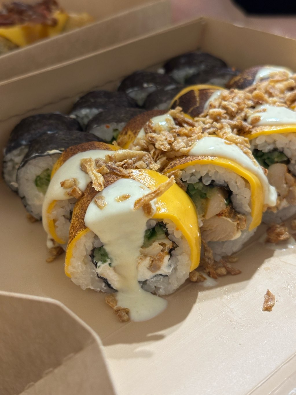 Состав: лосось, огурец, сливочный сыр, соус спайси, кунжут кимчи, соус терияки, кляр, сухари панко