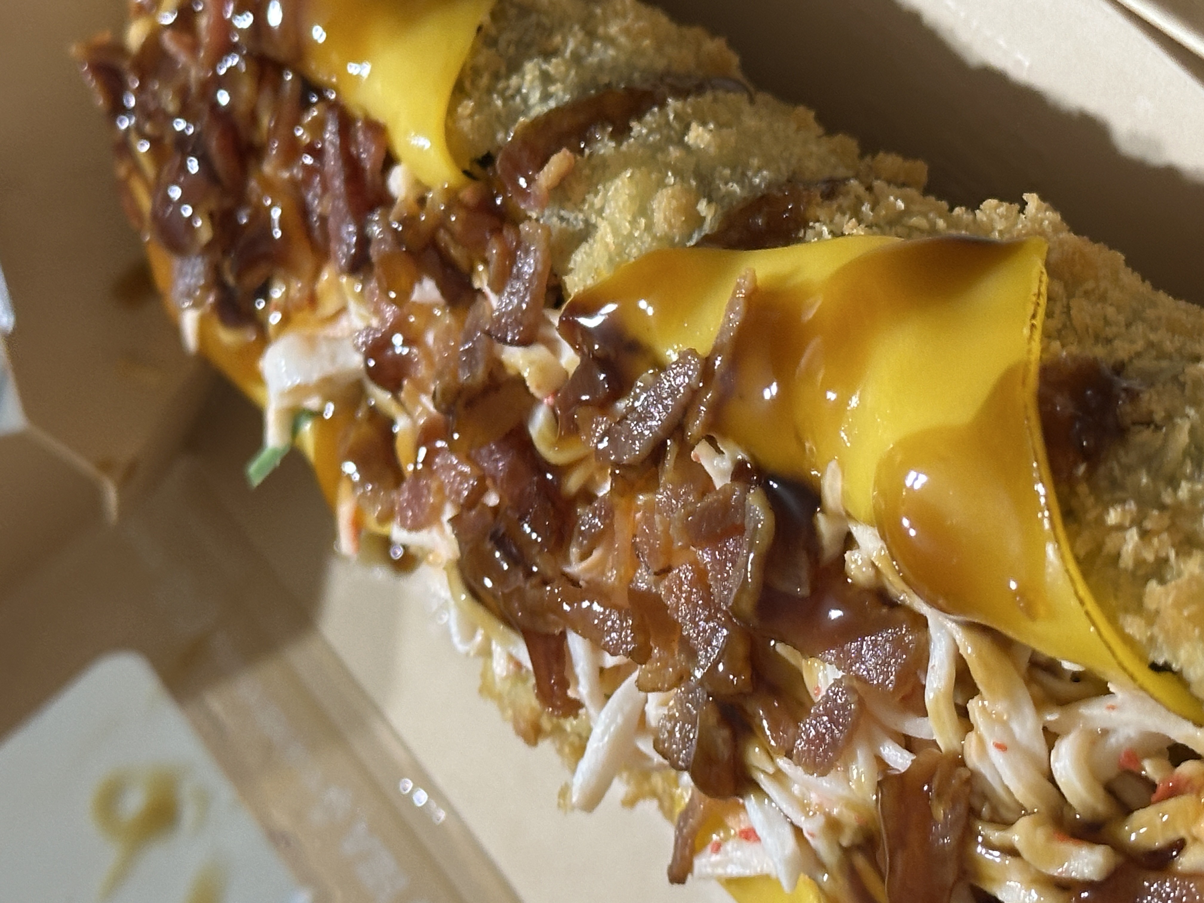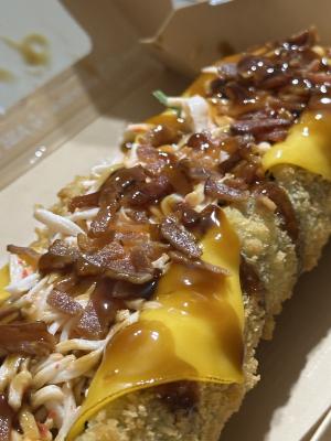 Состав: краб микс, сыр чеддер, огурец, чипс бекона, сливочный сыр, соус терияки, кляр, сухари панко