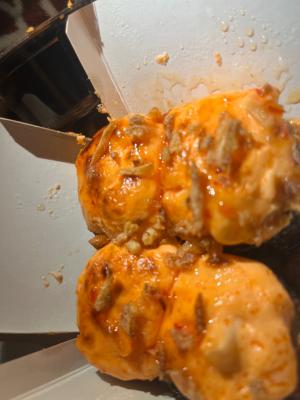 Состав: шампиньоны жаренные, сыр чеддер, кранч лук, сливочный сыр, томаты черри, соус спайси, соус терияки, кляр, сухари панко