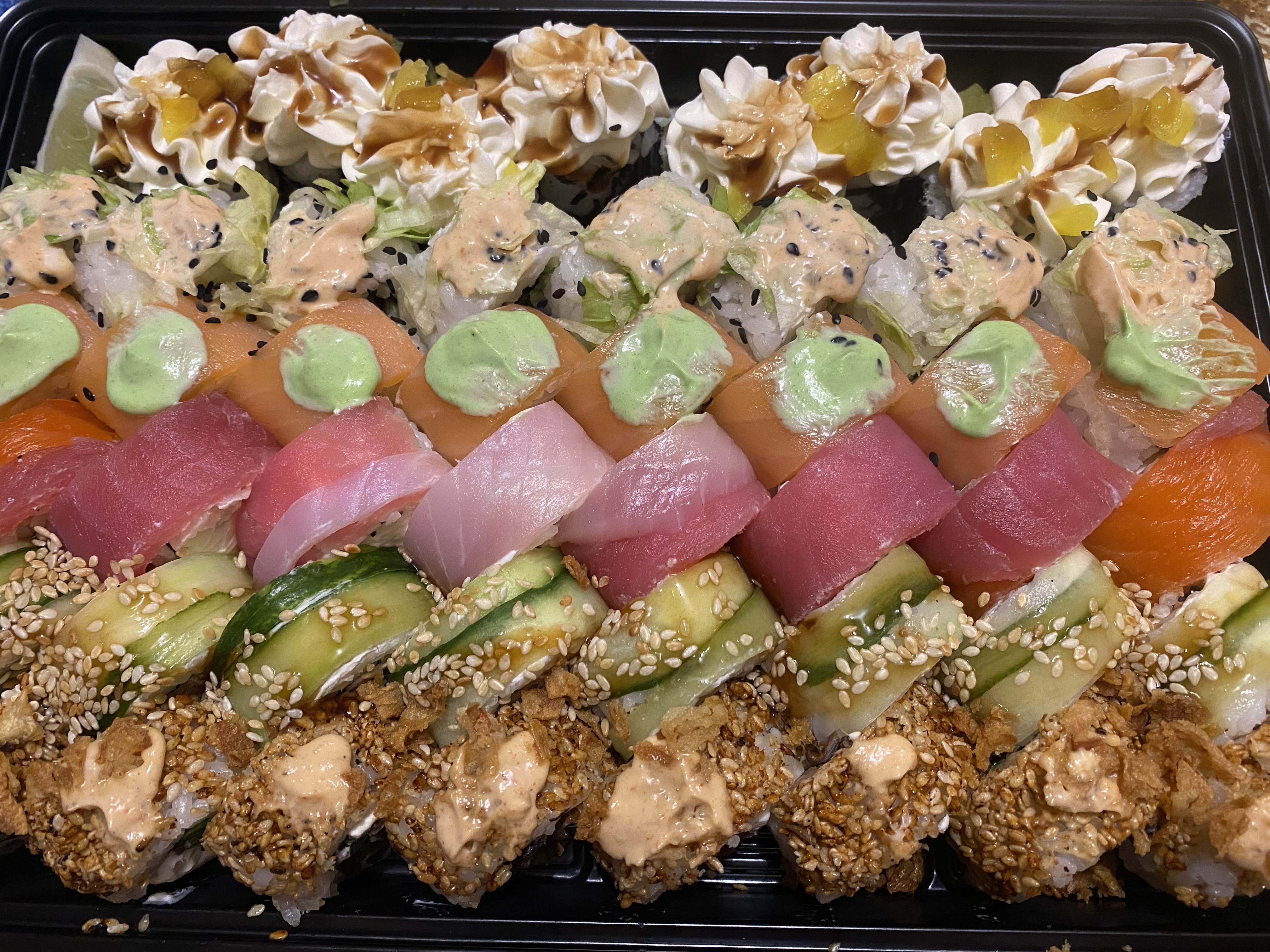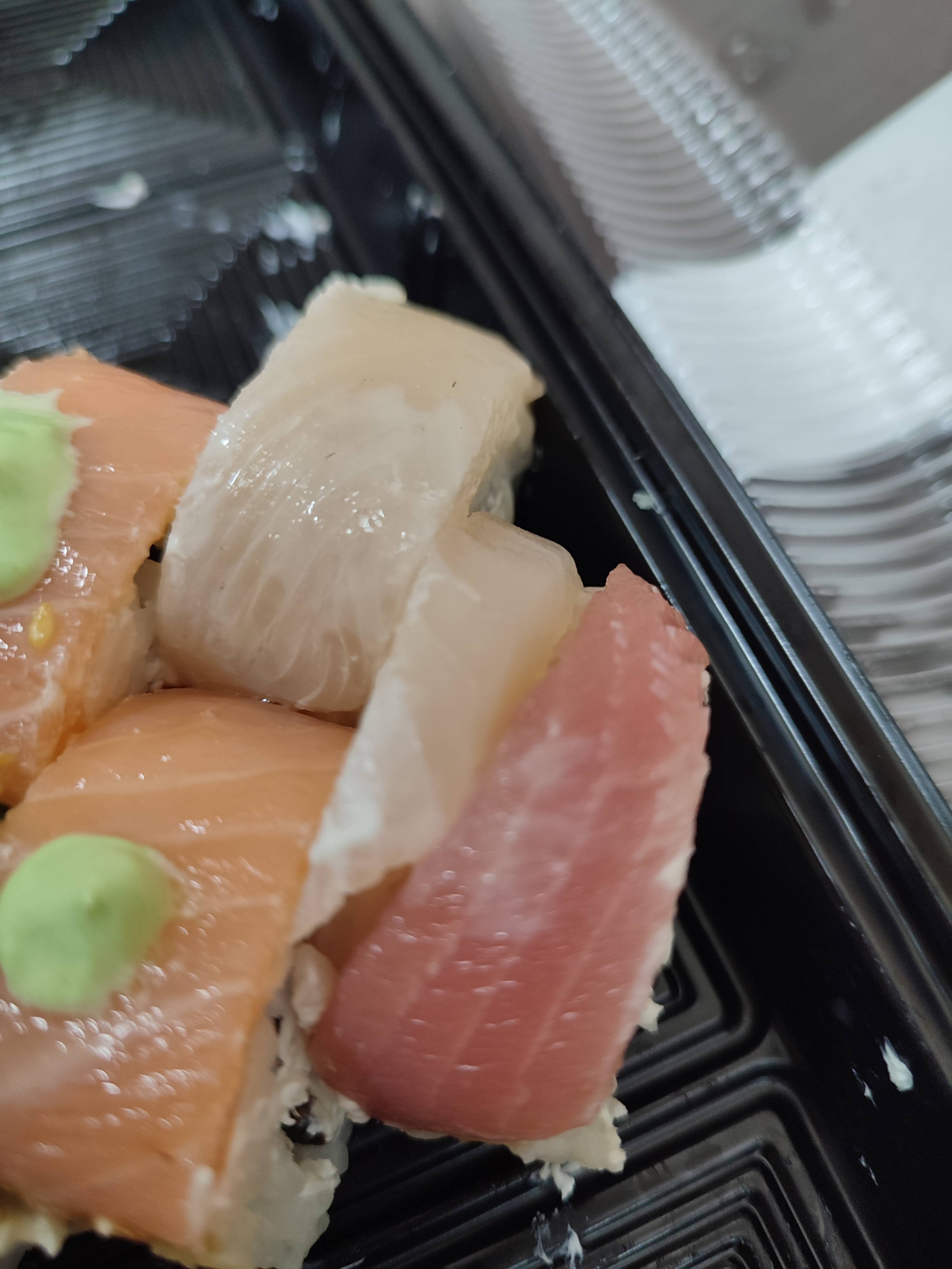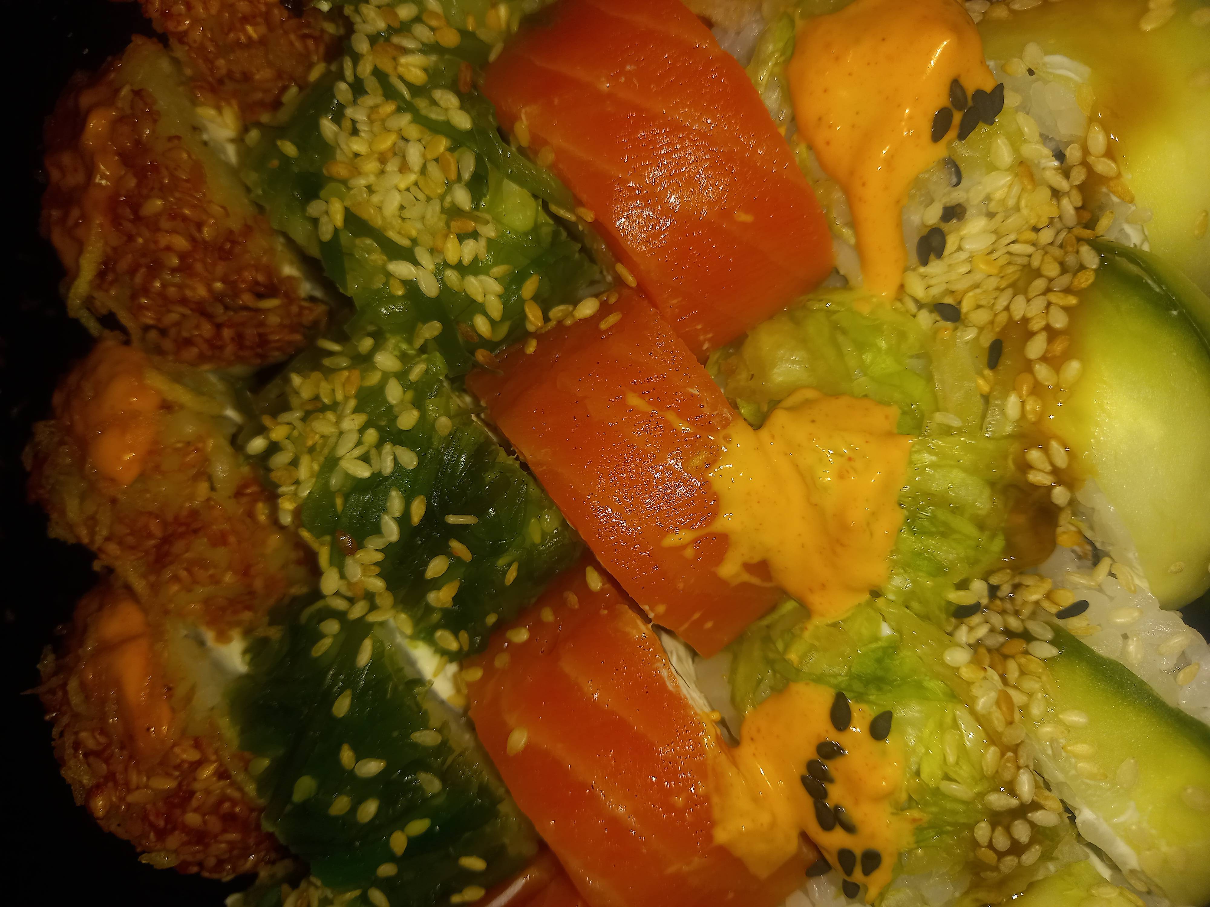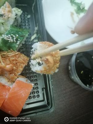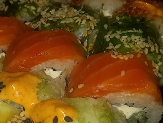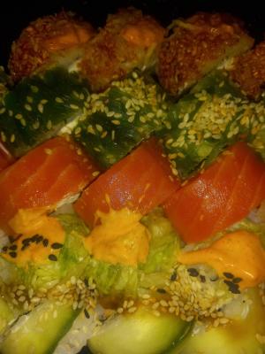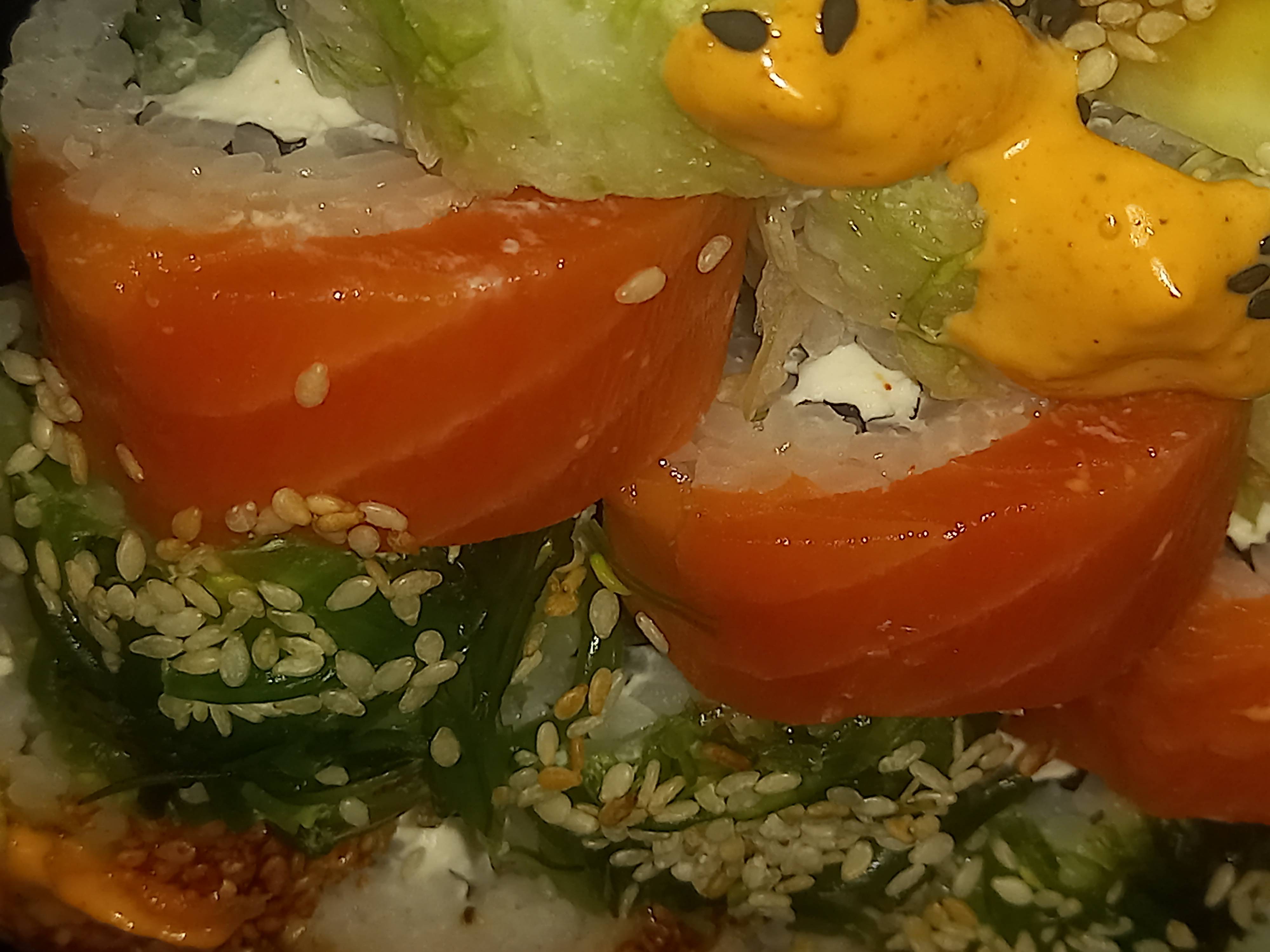 Состав: лосось, огурец, сливочный сыр, соус спайси, кунжут кимчи, соус терияки, кляр, сухари панко