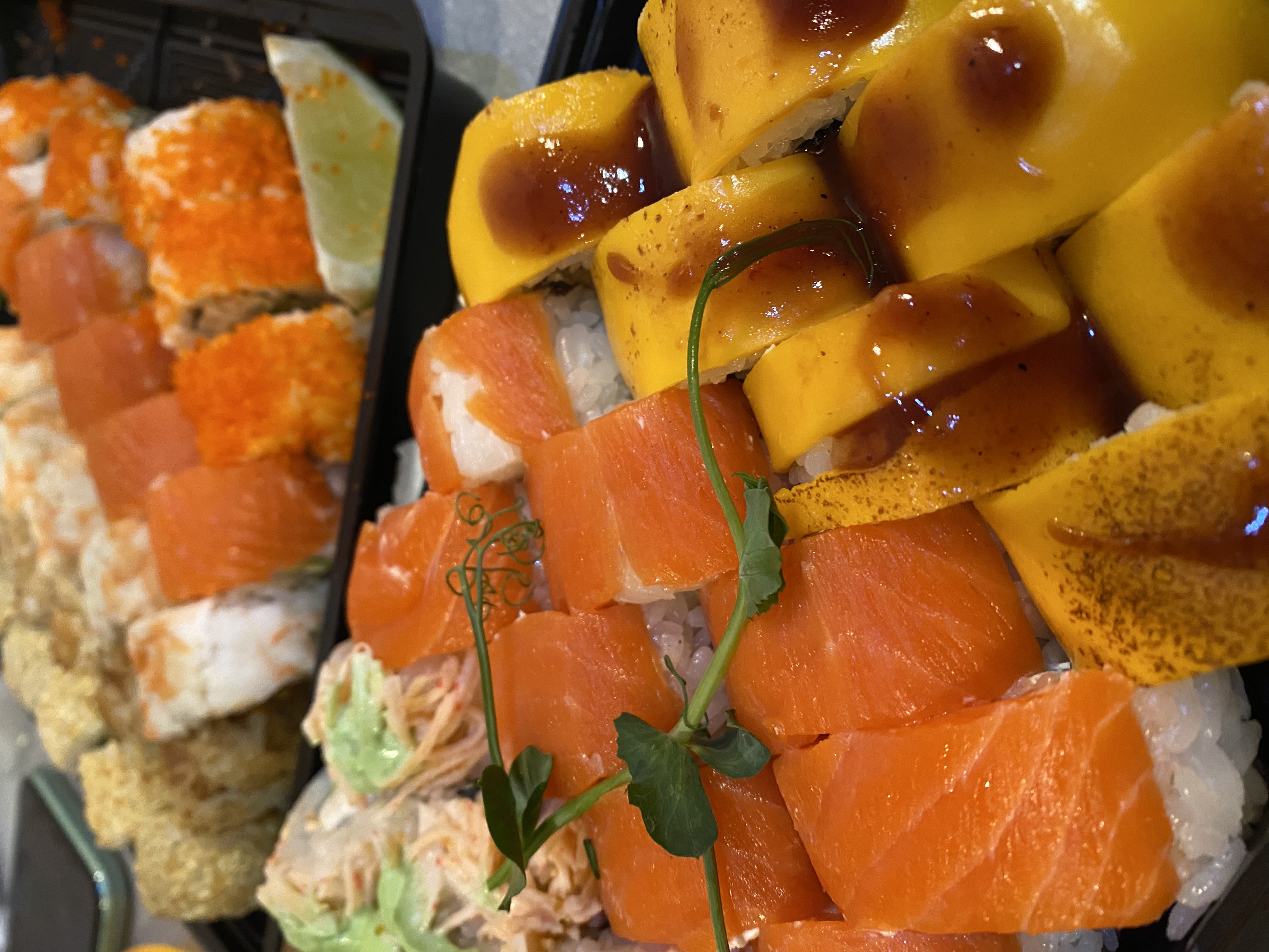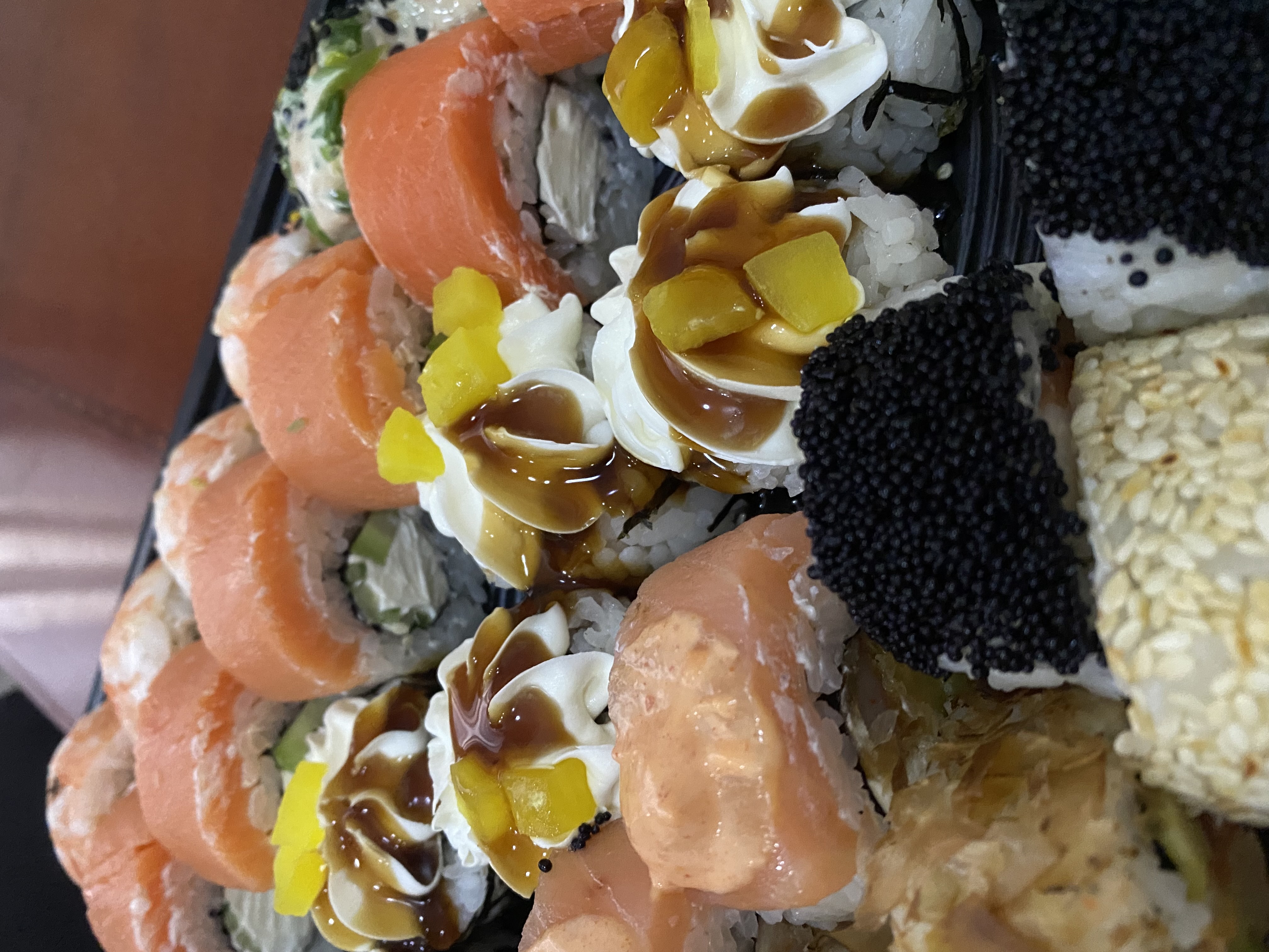 Состав: креветка, авокадо, манго, сливочный сыр, соус уорчестор, кунжутное масло, кунжут, сус кунжутный, петрушка
