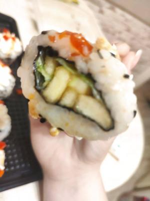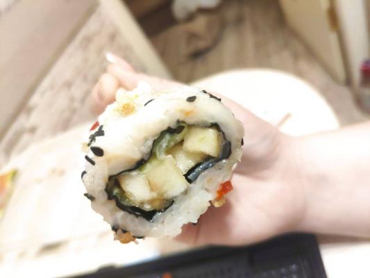 Состав: лосось, огурец, сливочный сыр, соус спайси, кунжут кимчи, соус терияки, кляр, сухари панко