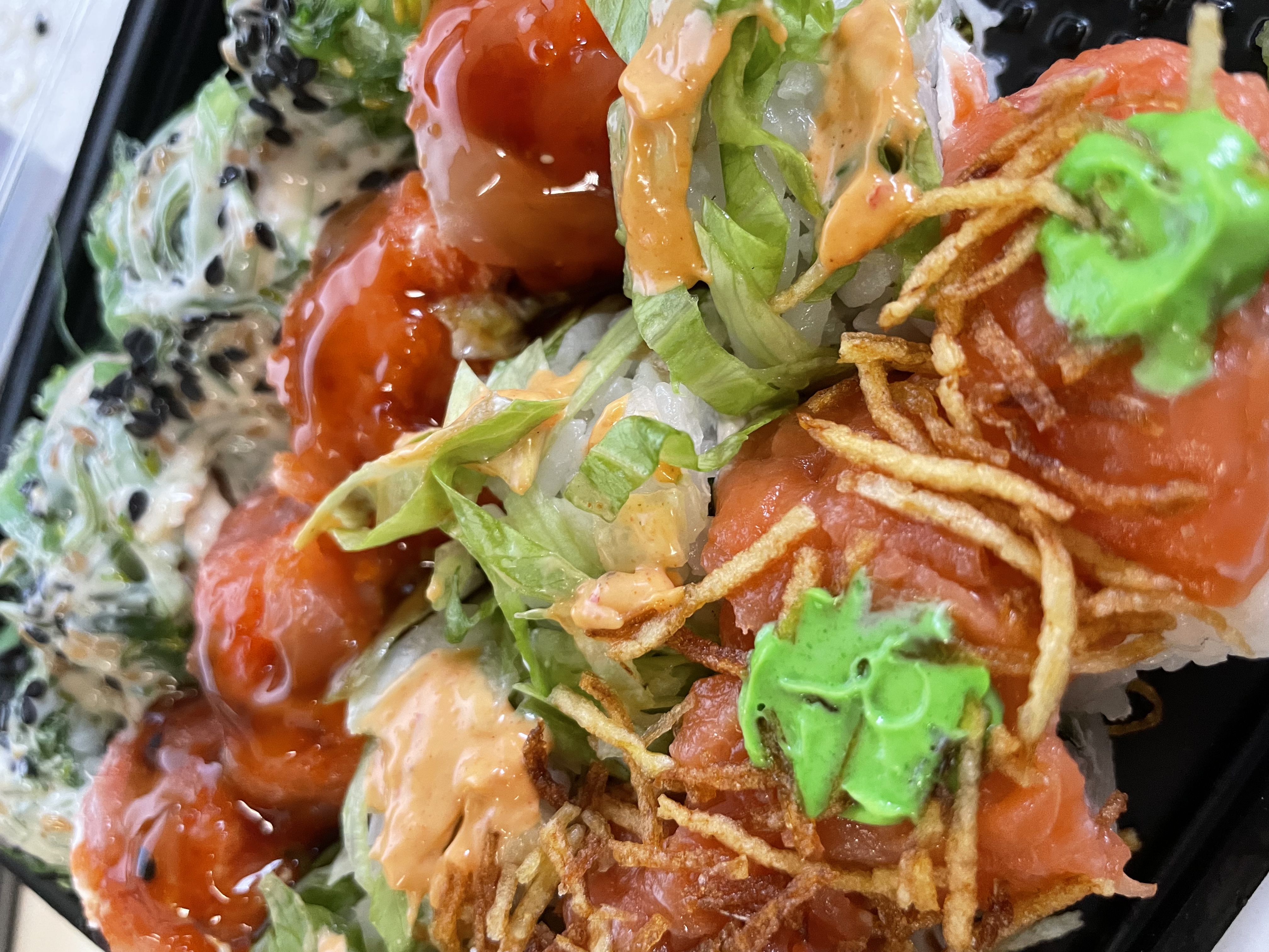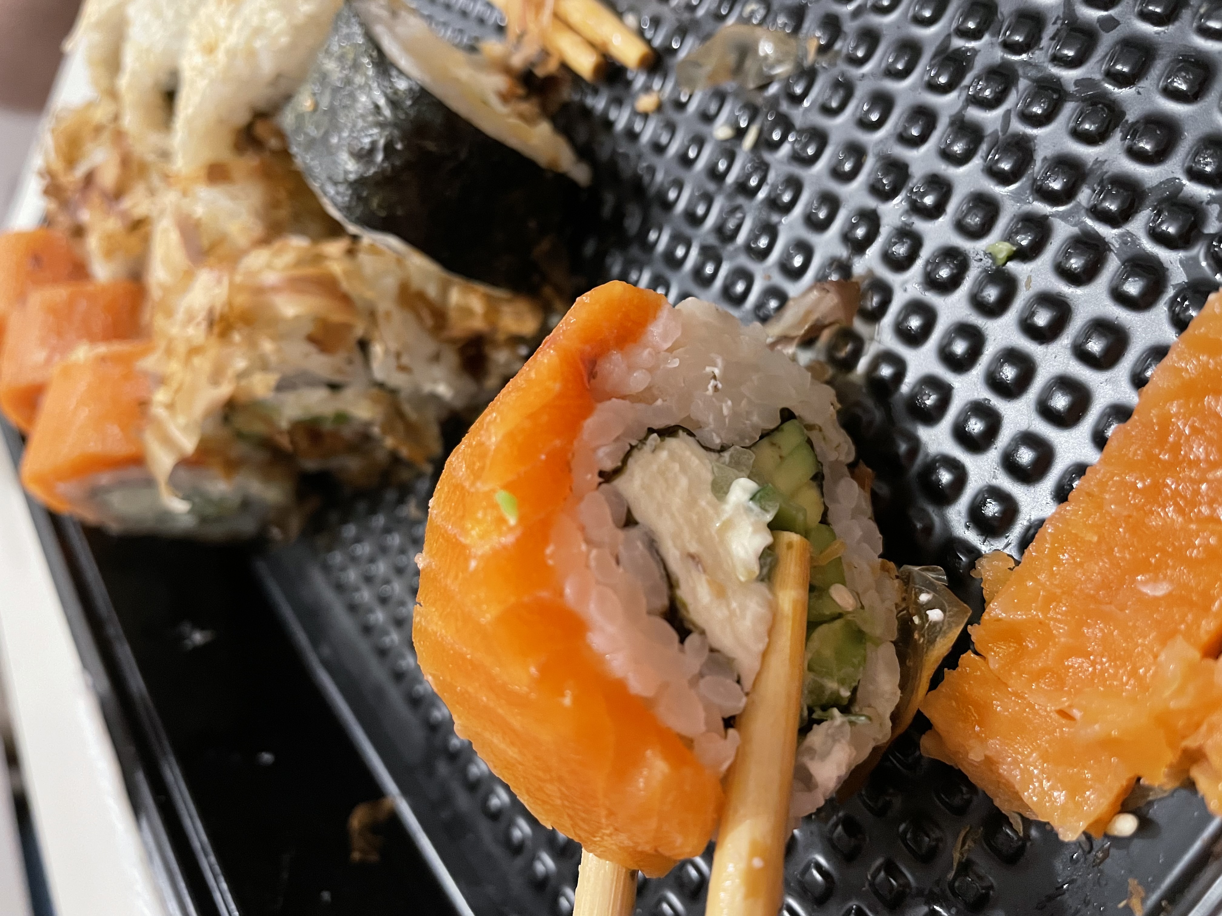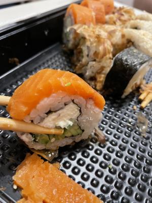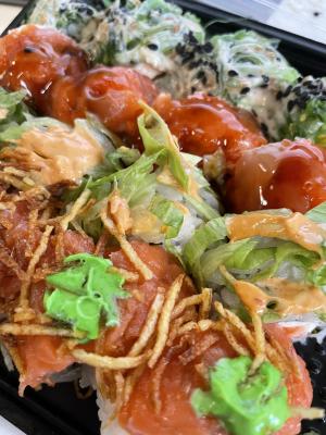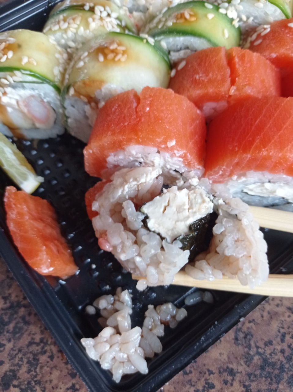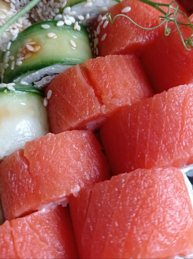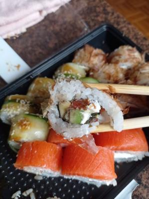 Состав: лосось, огурец, сливочный сыр, соус спайси, кунжут кимчи, соус терияки, кляр, сухари панко