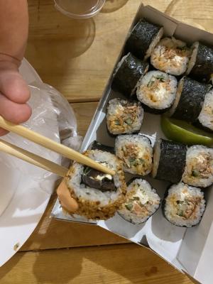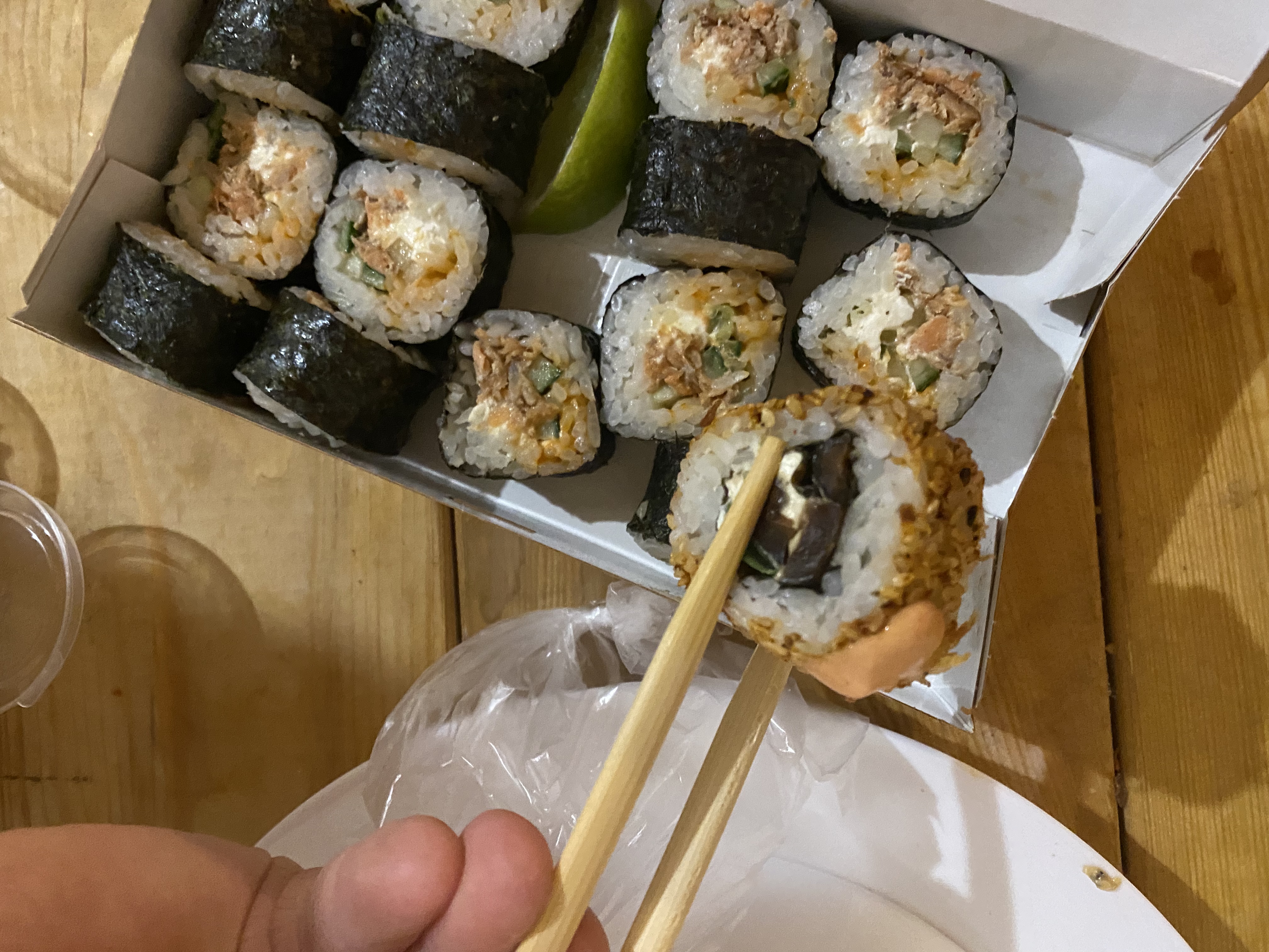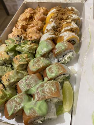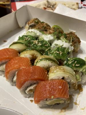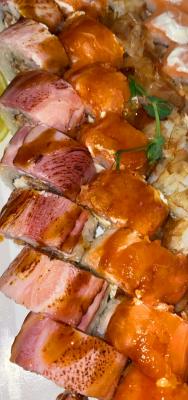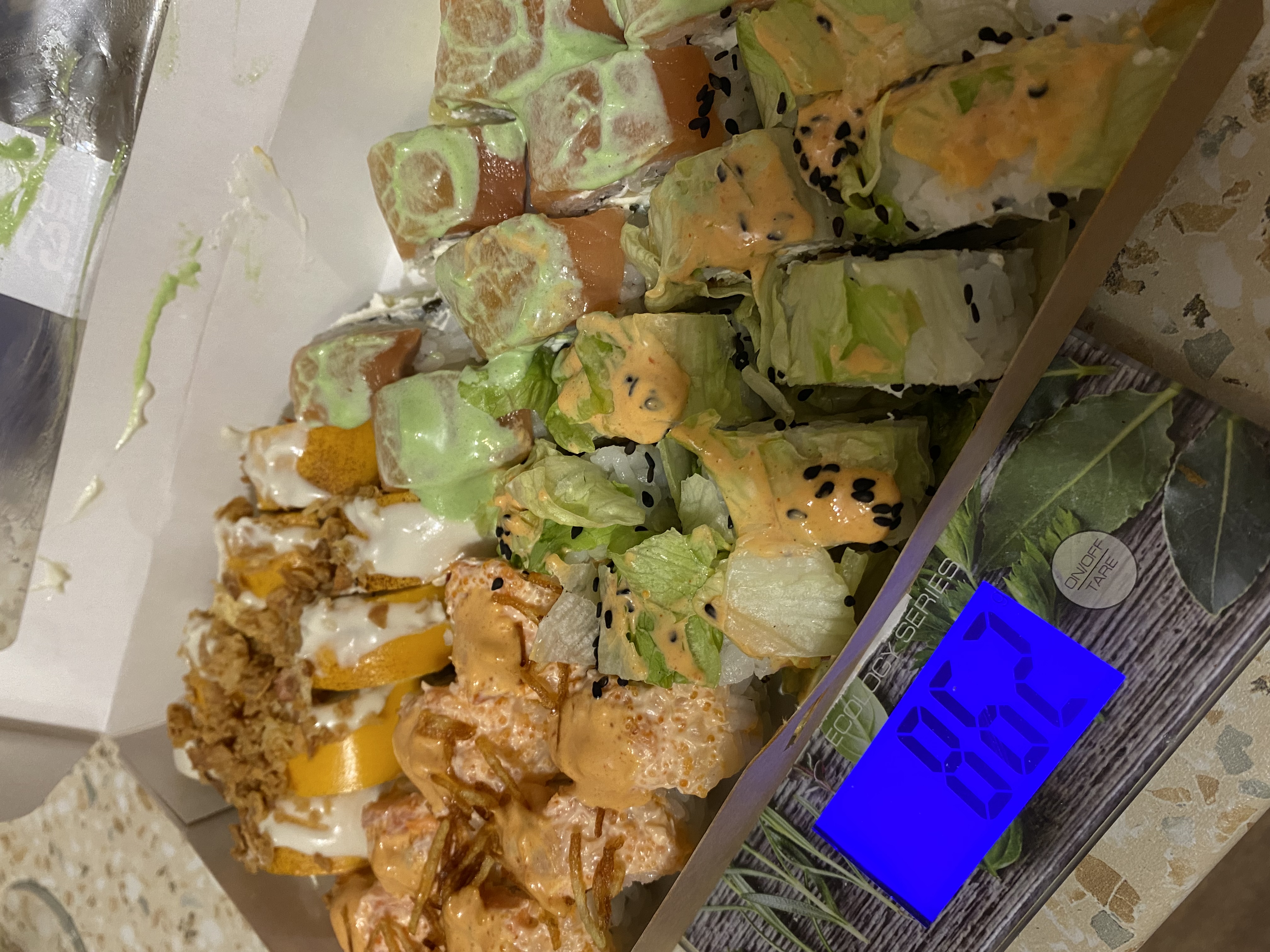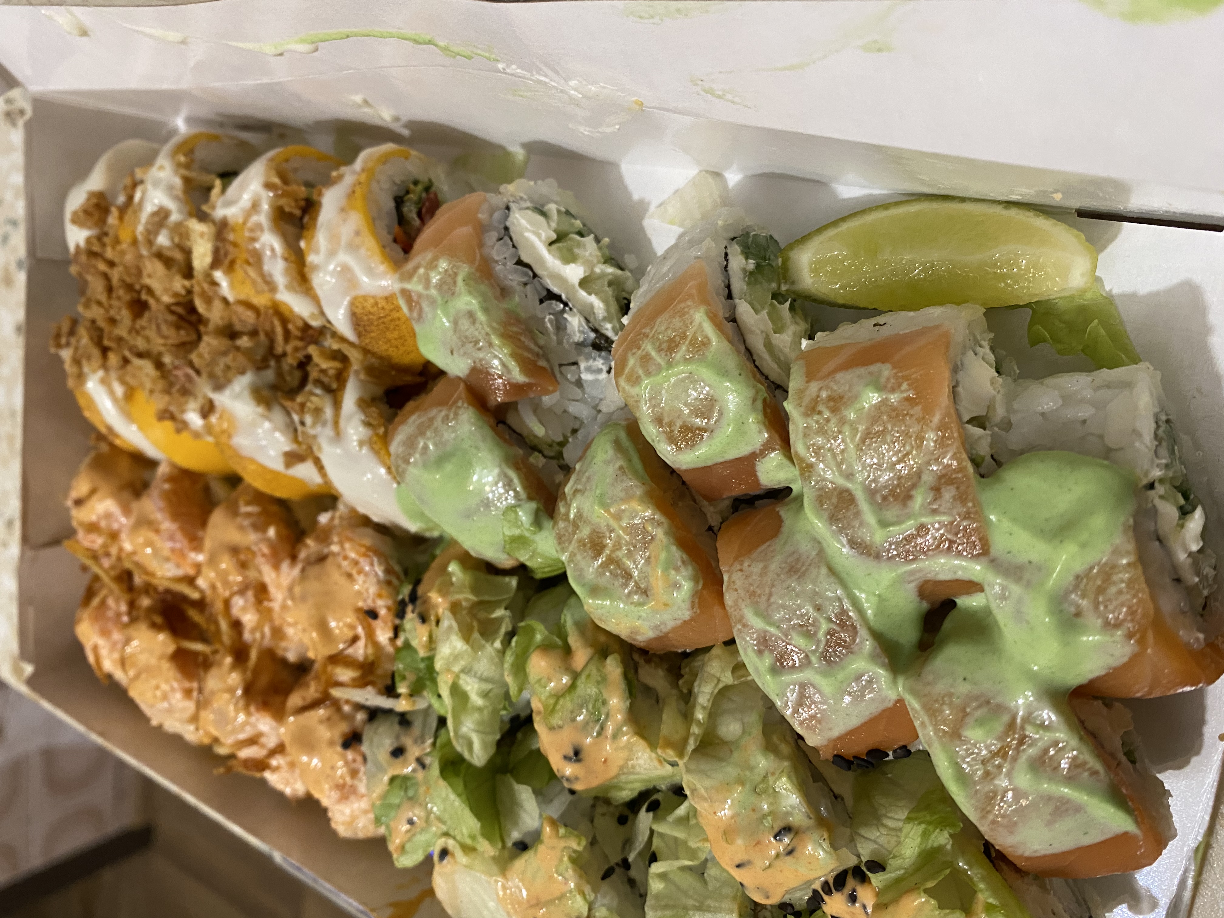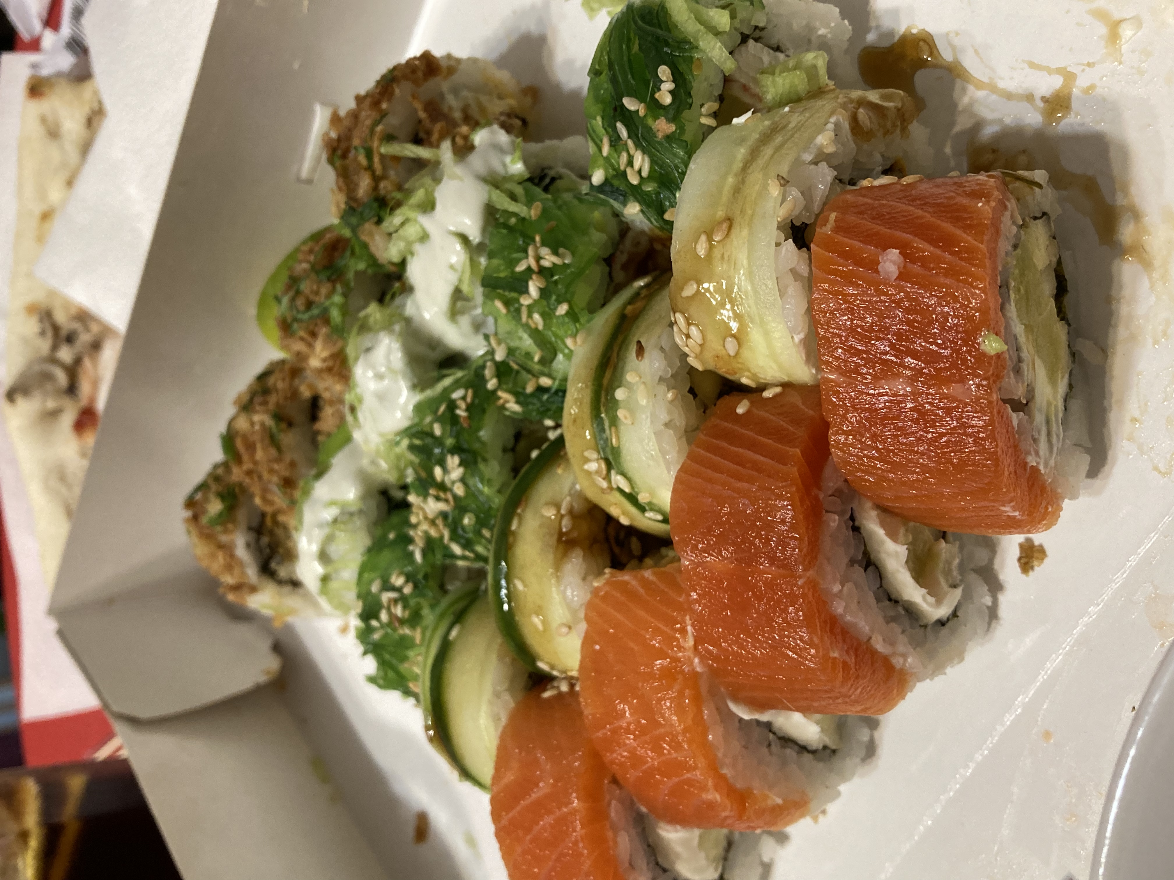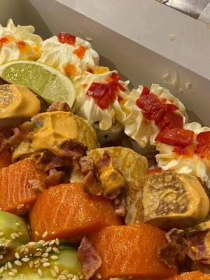 Состав: лосось, огурец, сливочный сыр, соус спайси, кунжут кимчи, соус терияки, кляр, сухари панко