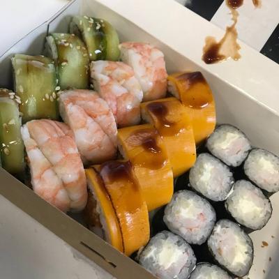 Состав: креветка, авокадо, манго, сливочный сыр, соус уорчестор, кунжутное масло, кунжут, сус кунжутный, петрушка