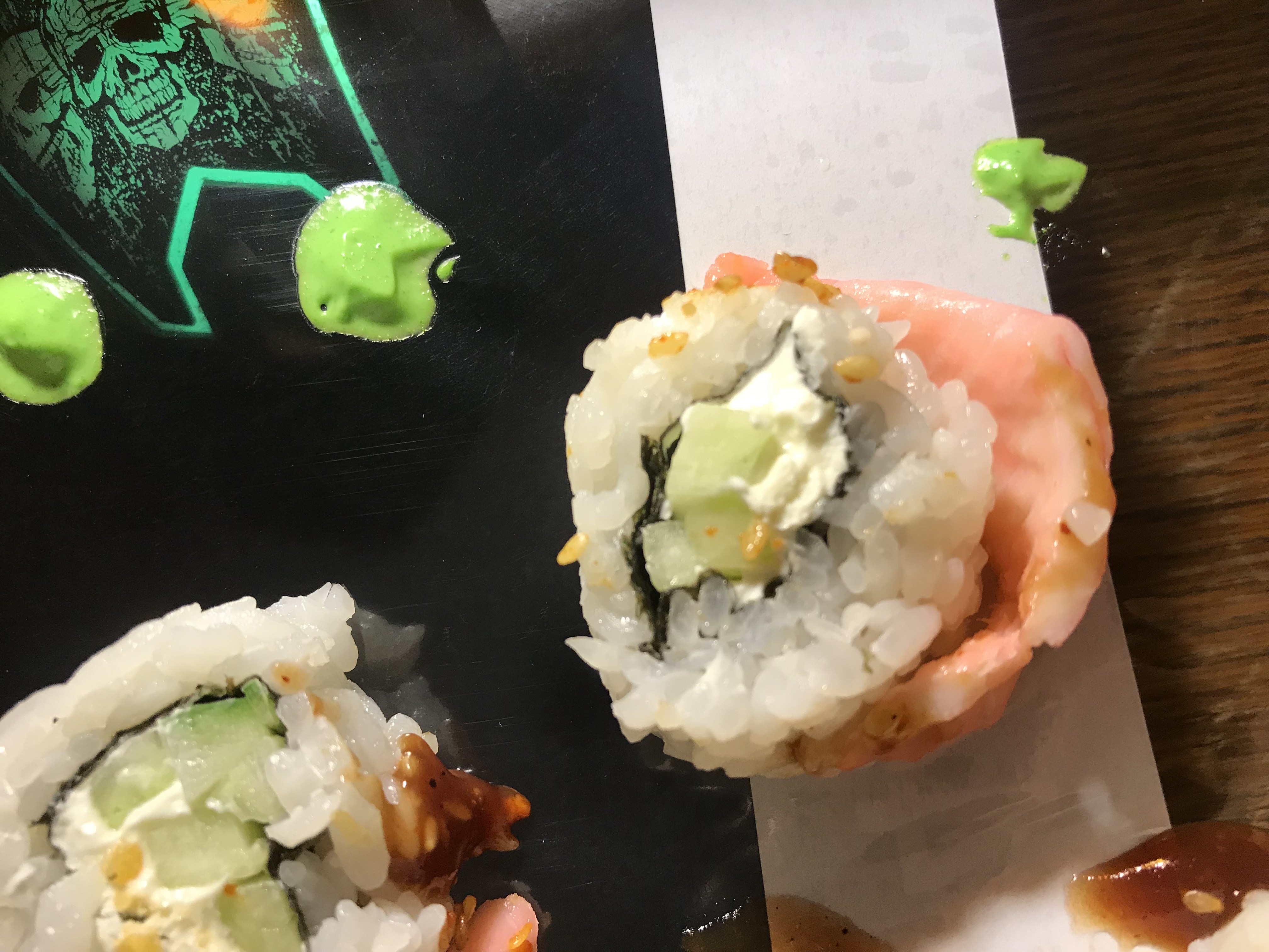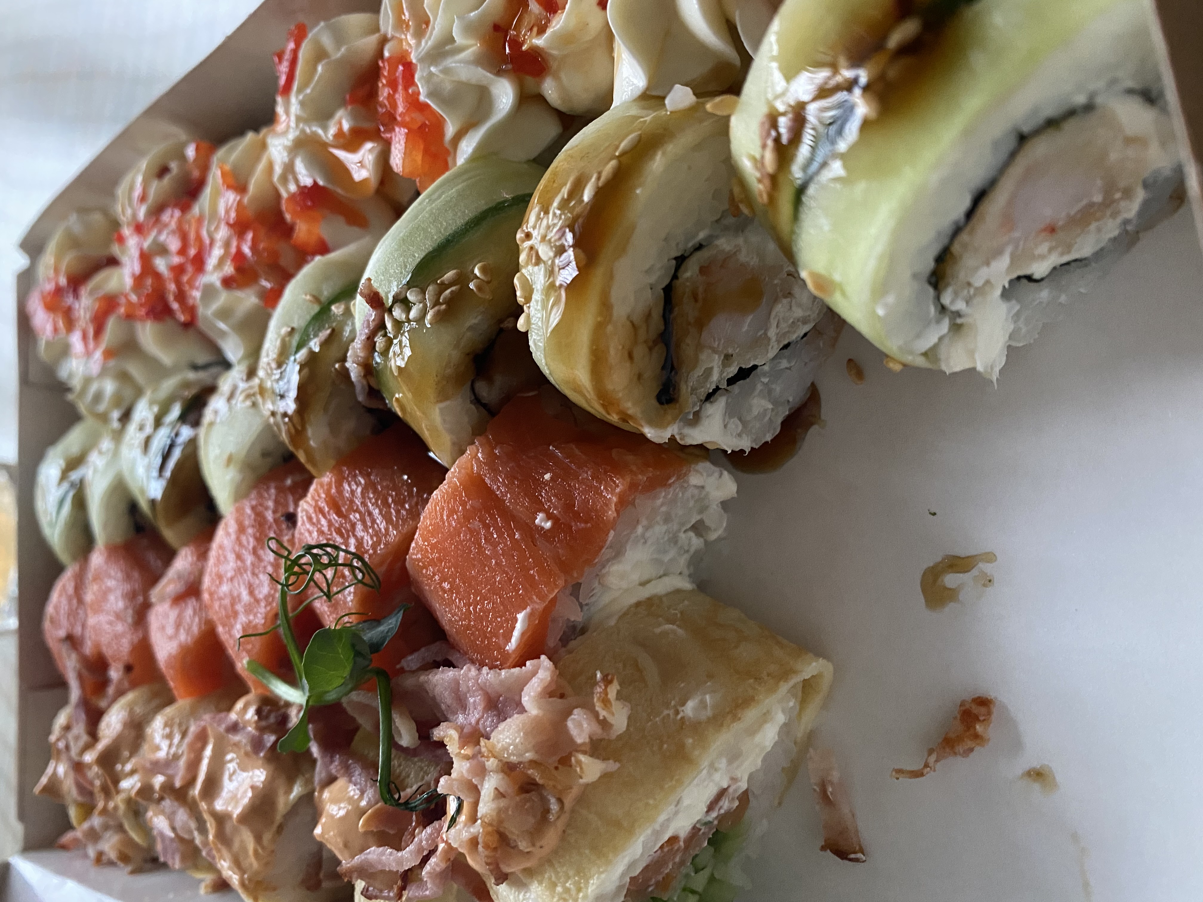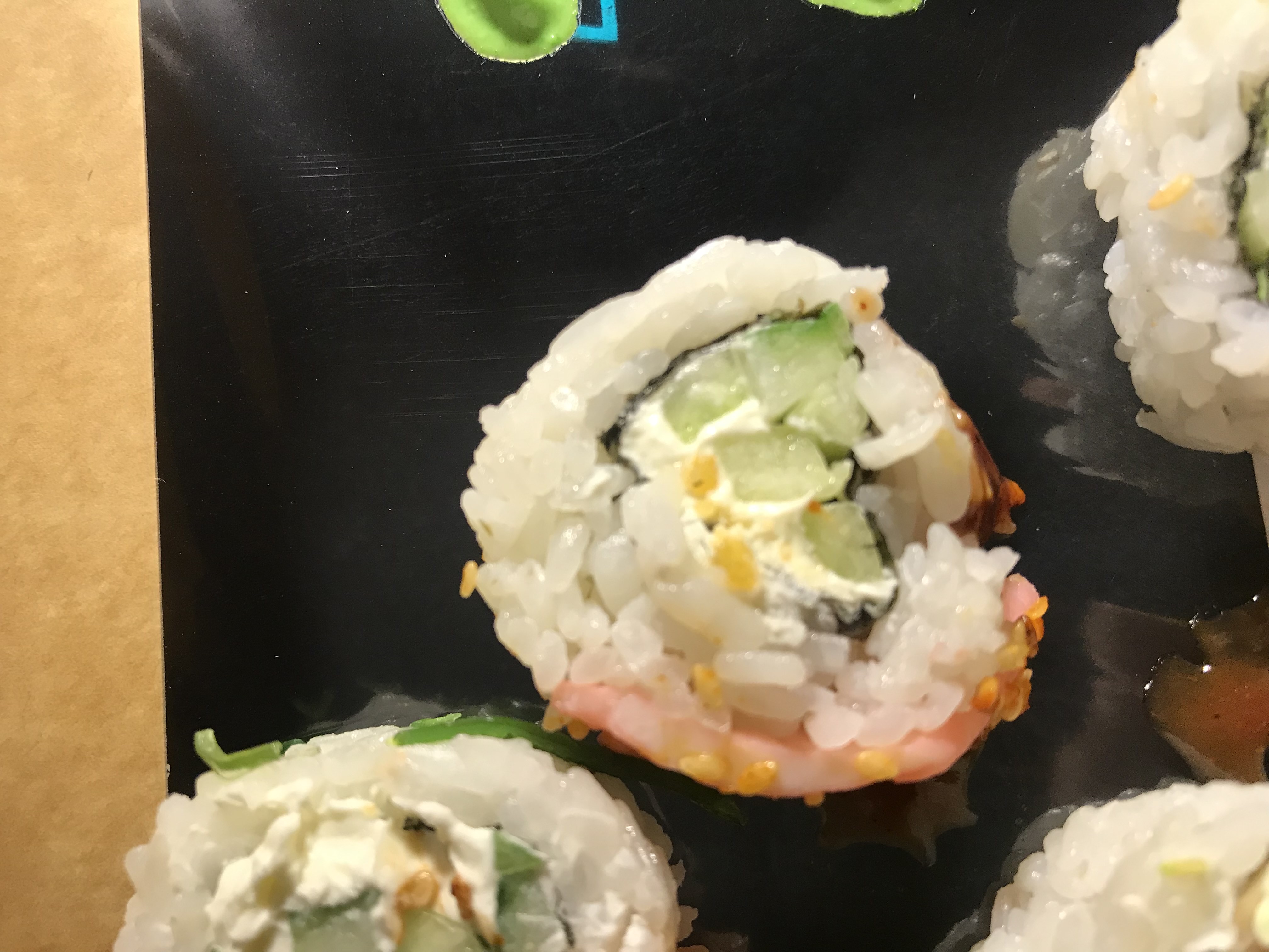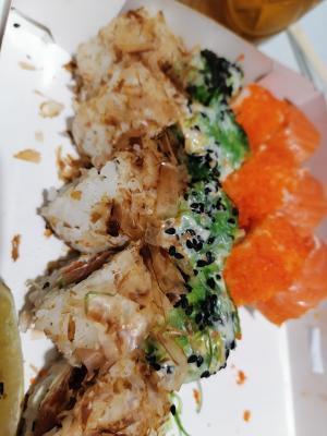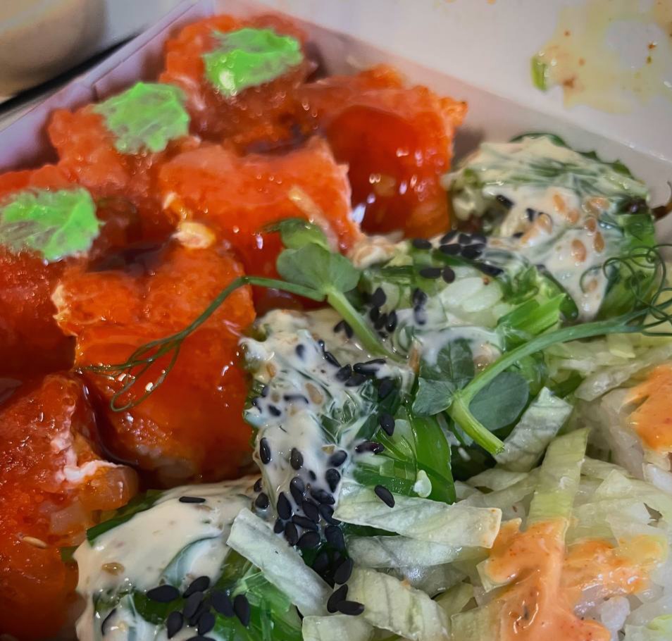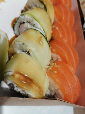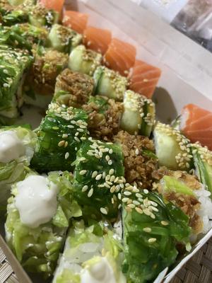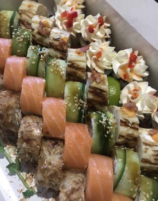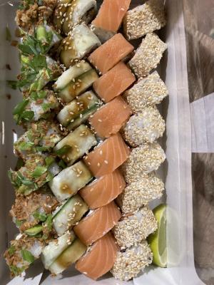 Состав: лосось, огурец, сливочный сыр, соус спайси, кунжут кимчи, соус терияки, кляр, сухари панко