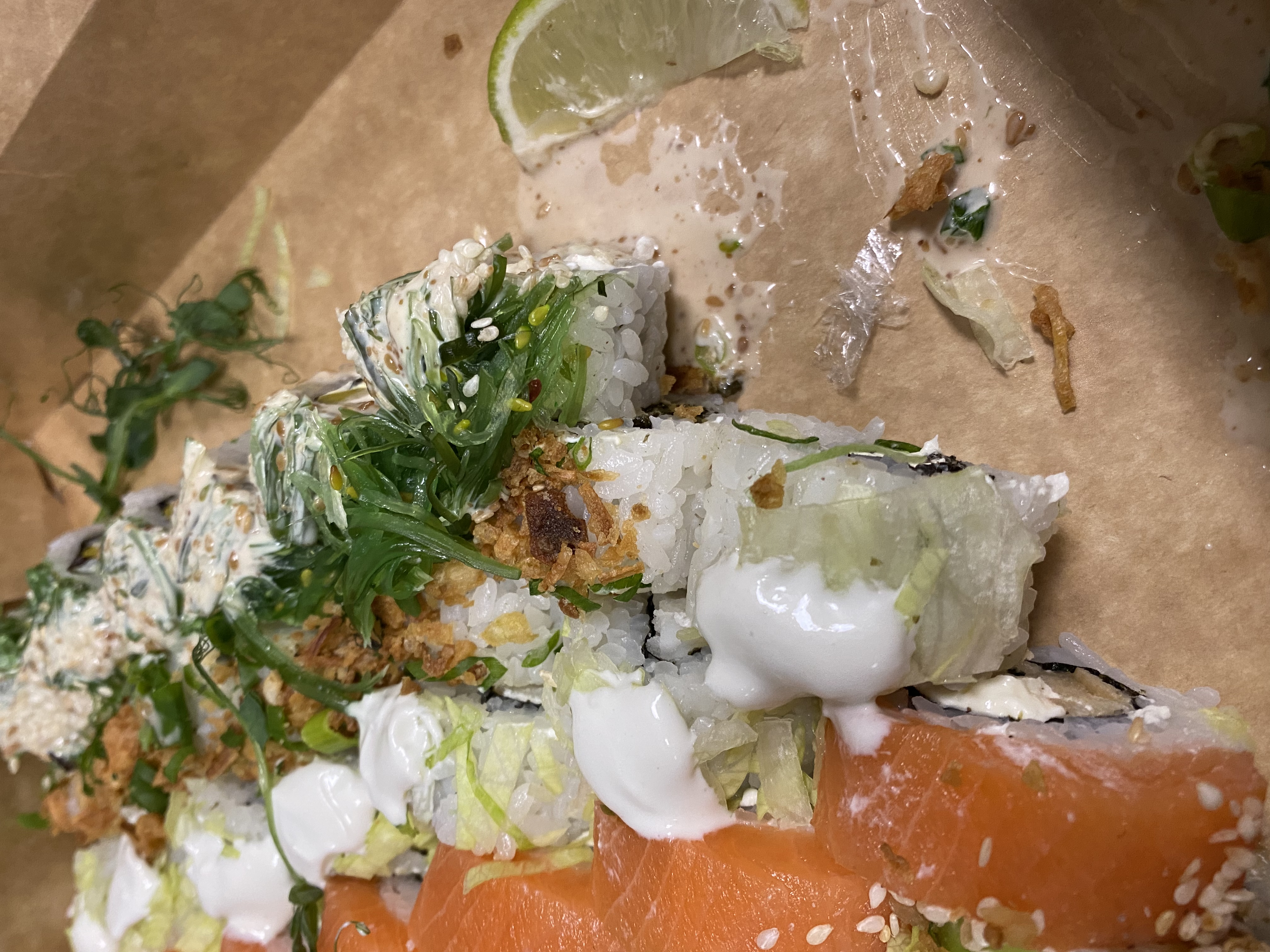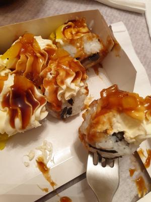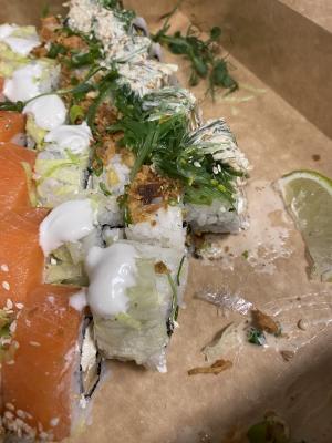 Состав: лосось, огурец, сливочный сыр, соус спайси, кунжут кимчи, соус терияки, кляр, сухари панко