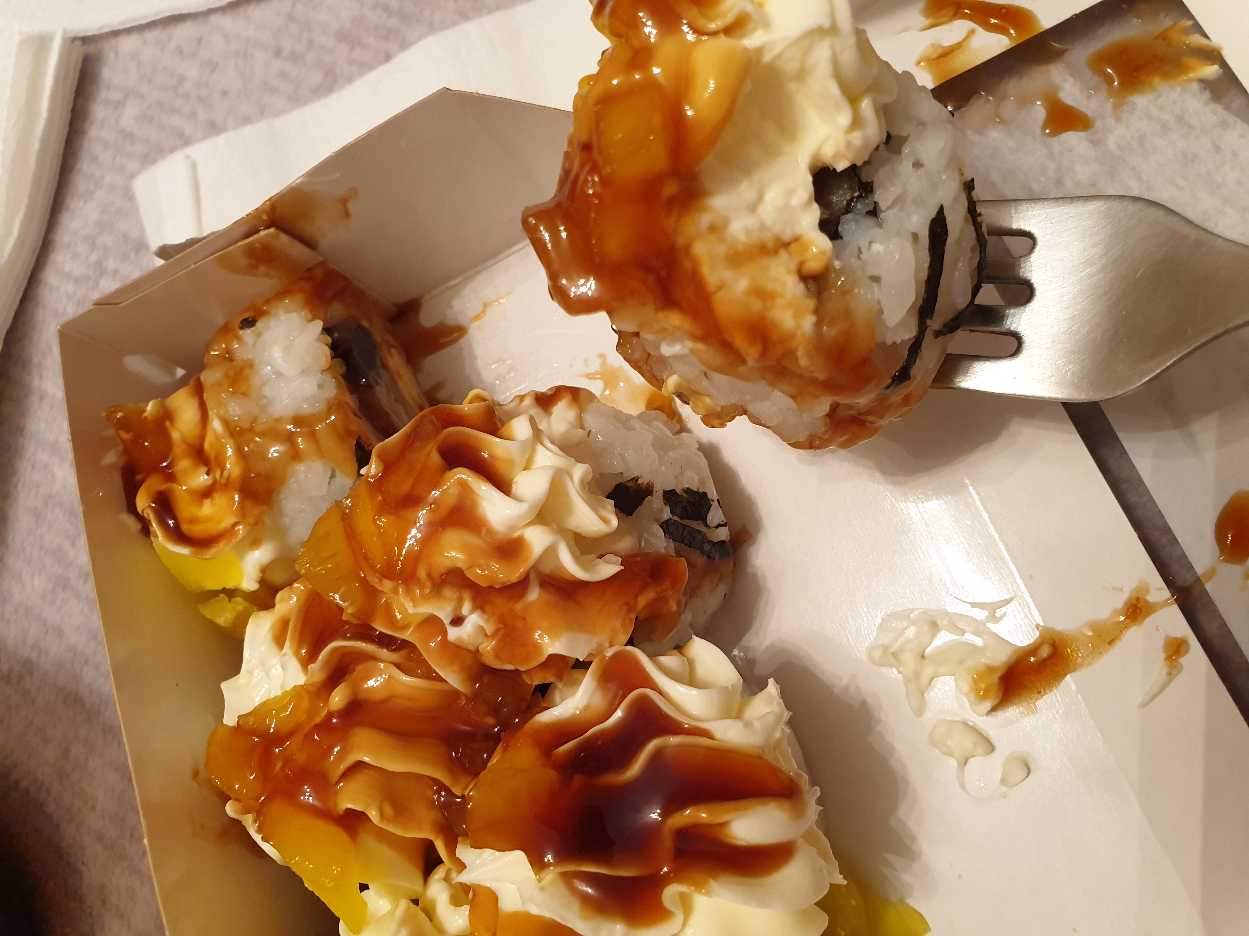 Состав: сунец, авокадо, сливочный сыр, кунжутное масло, картофель пай, соус терияки, кляр, сухари панко