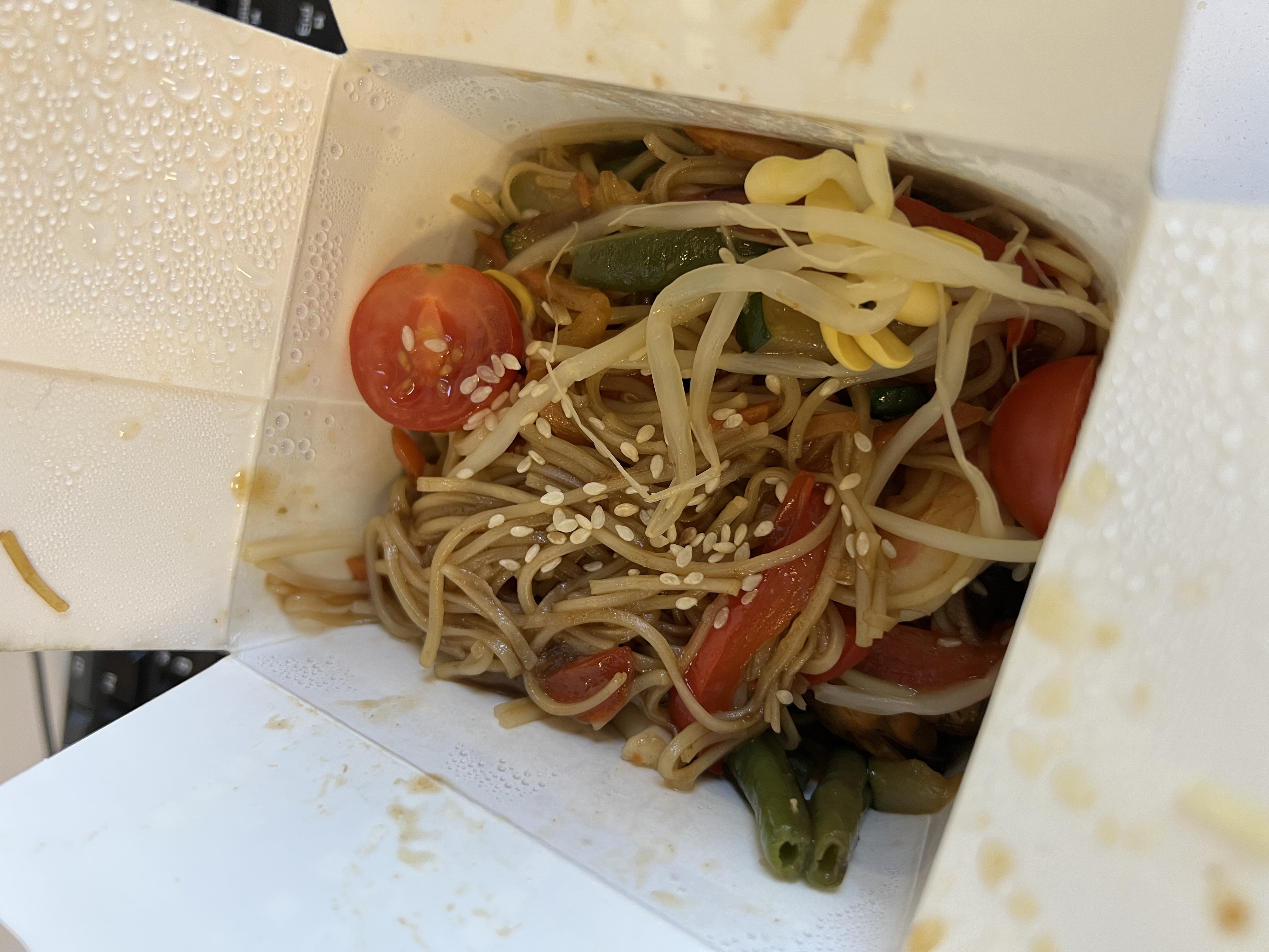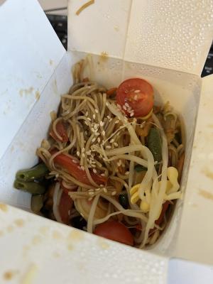 Состав: вырезка говяжья, цукини, лук красный, морковь, перец болгарский, масло чесночное, лапша гречневая, бульон вок, соус вок, кунжут белый, ростки соевые