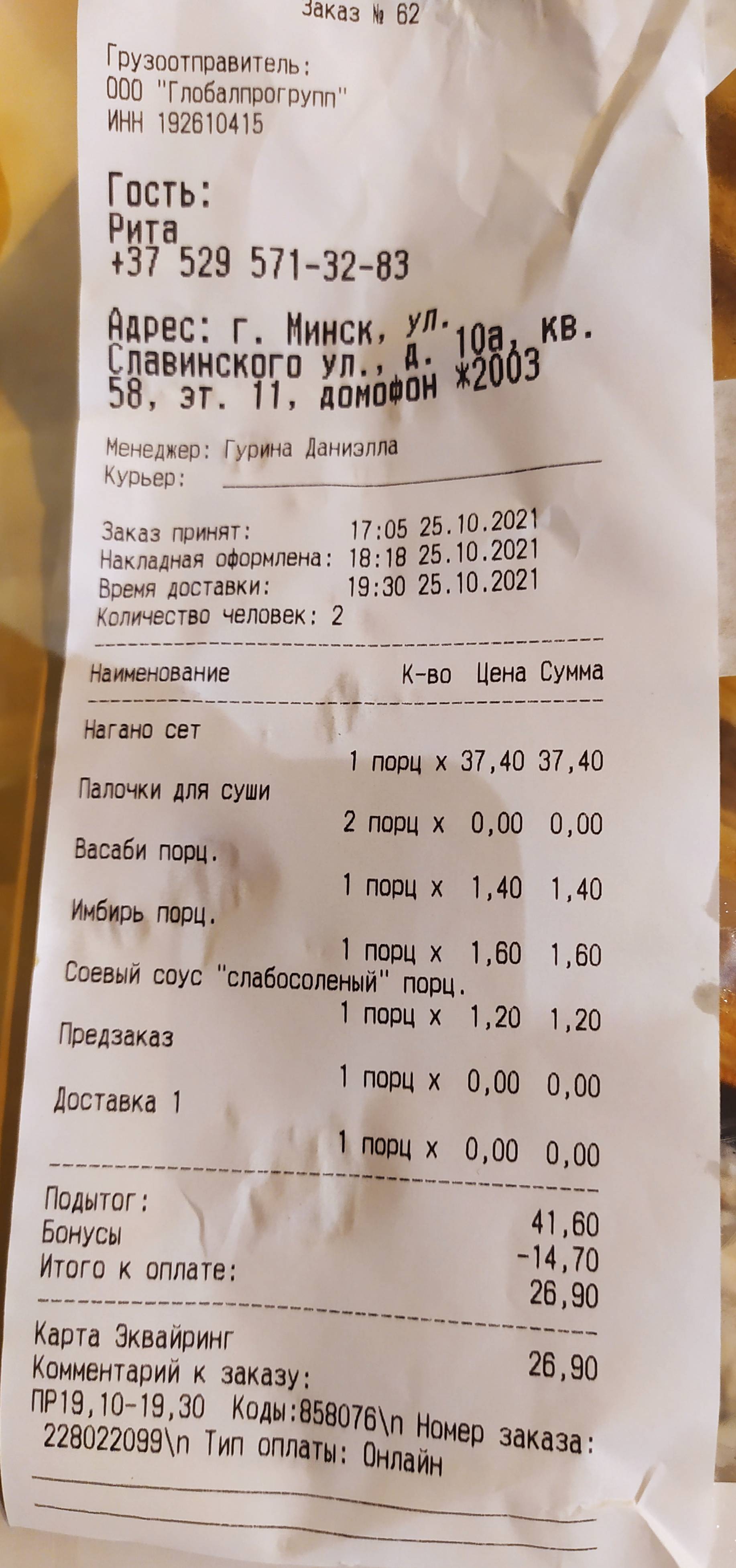 - время доставки: от 60 мин