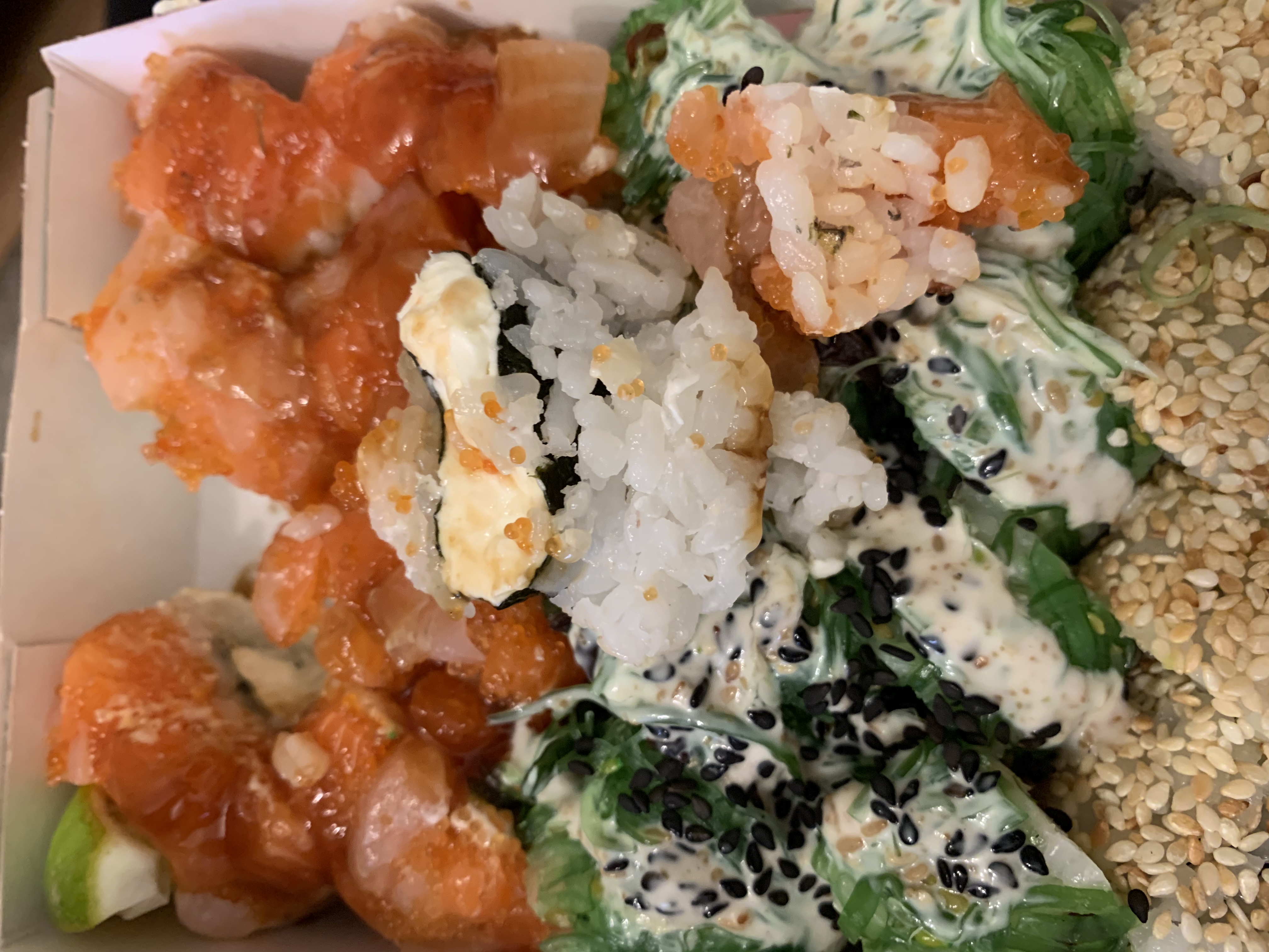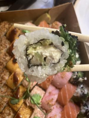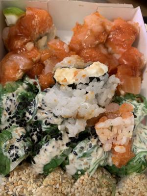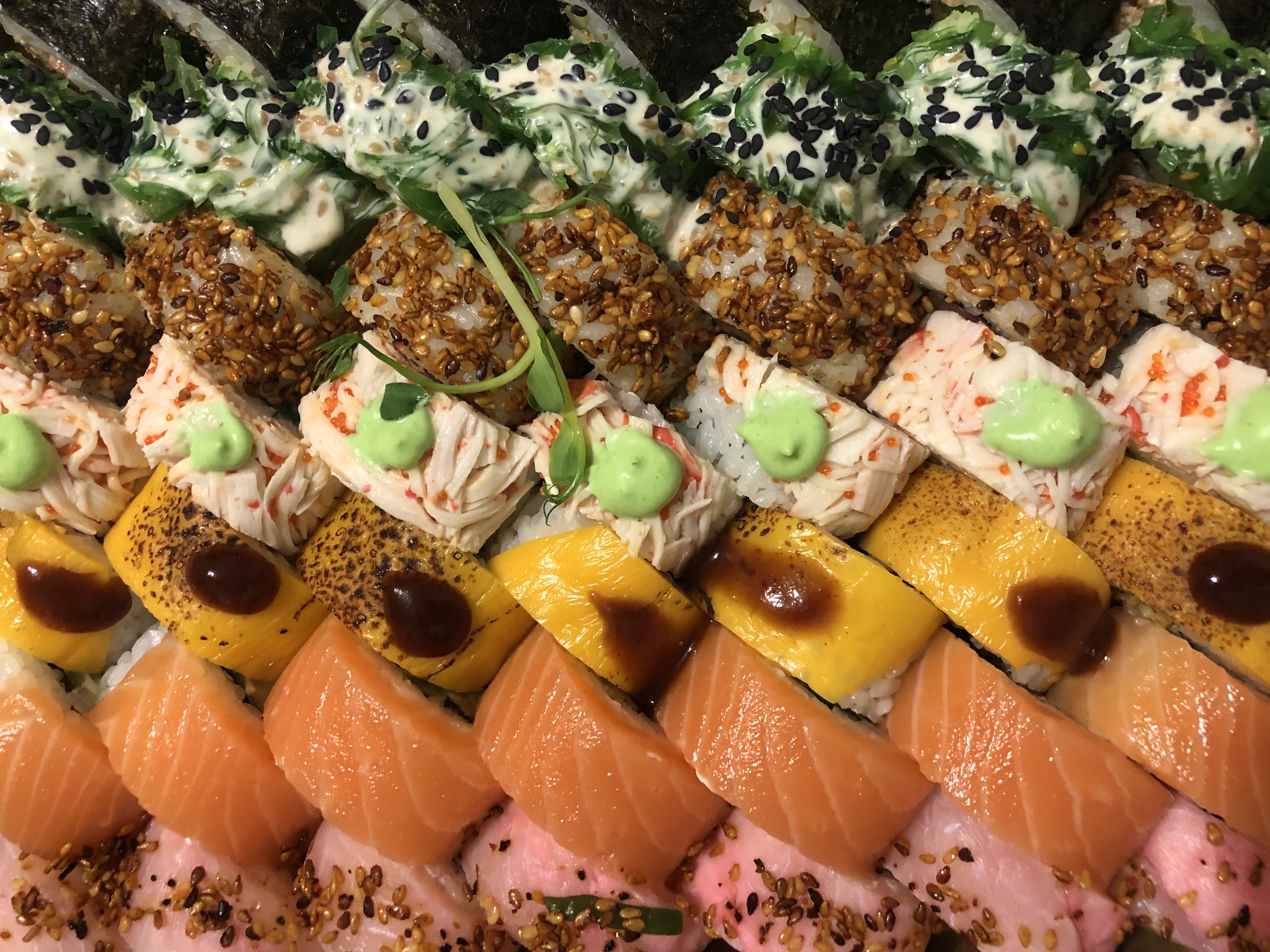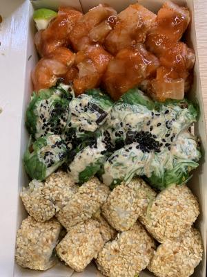 Состав: лосось, огурец, сливочный сыр, соус спайси, кунжут кимчи, соус терияки, кляр, сухари панко