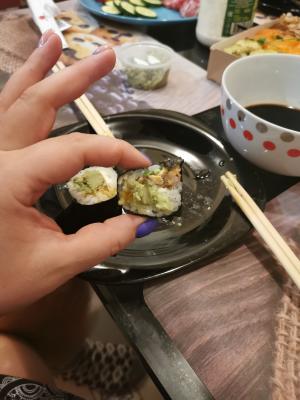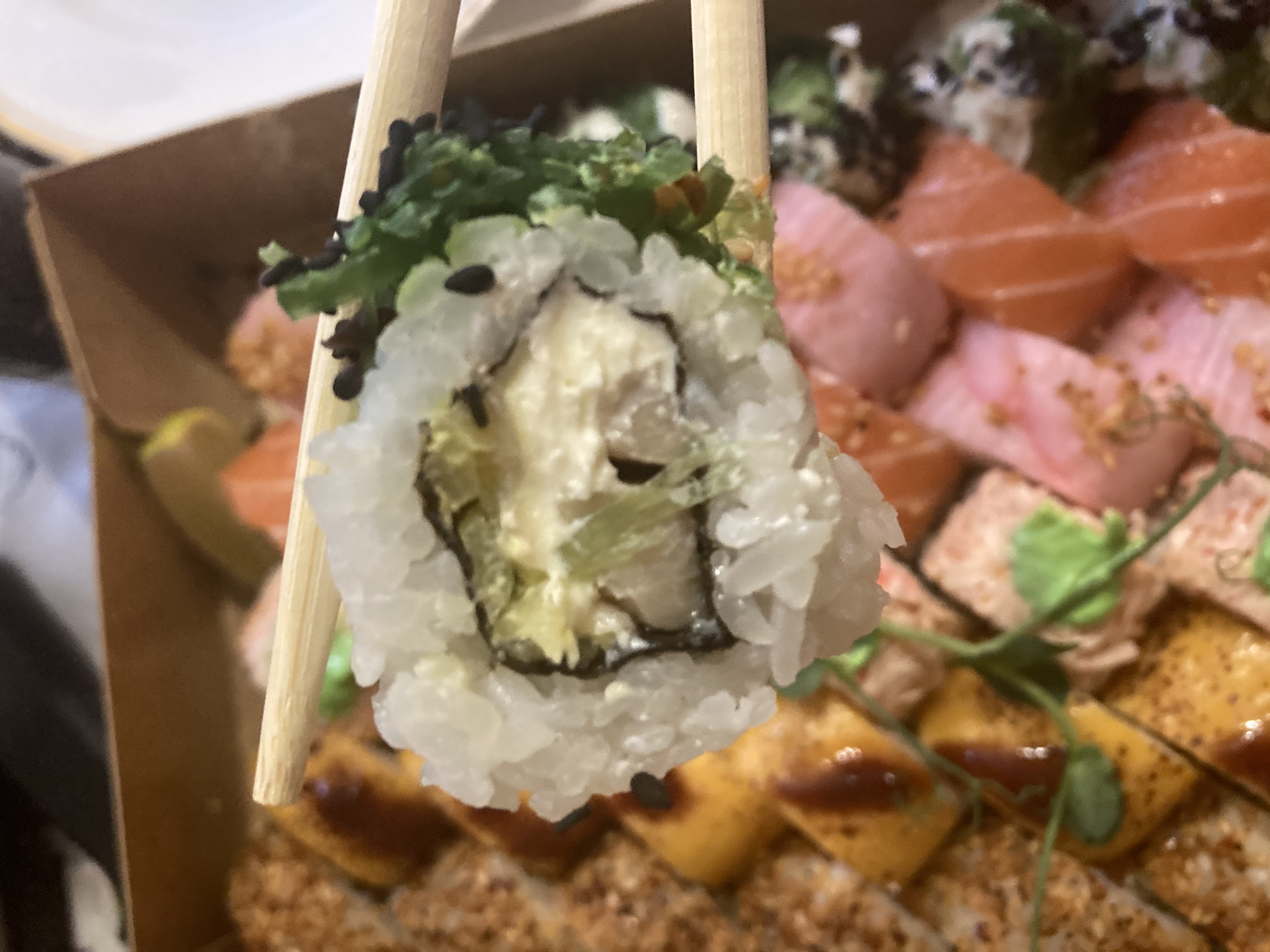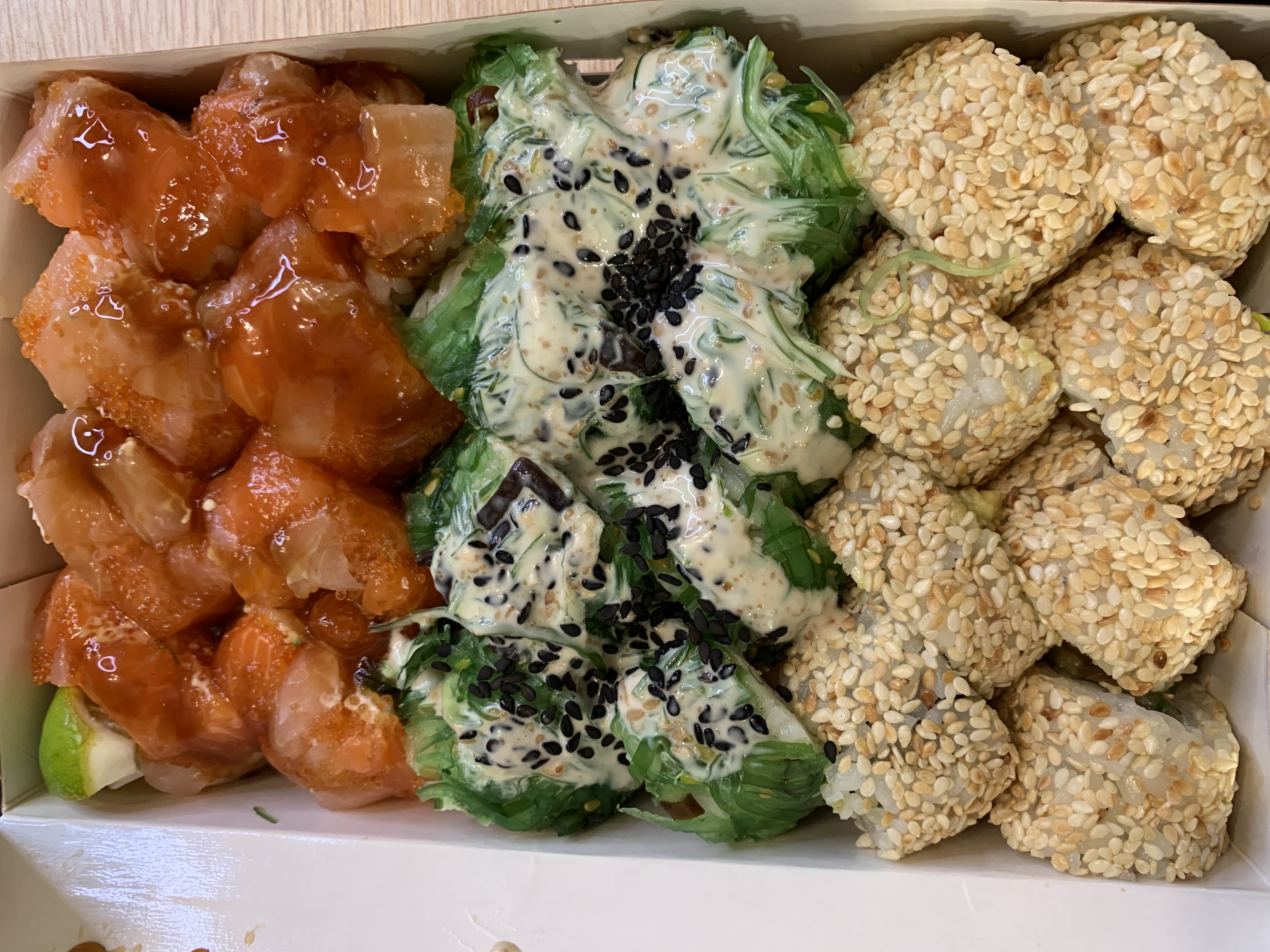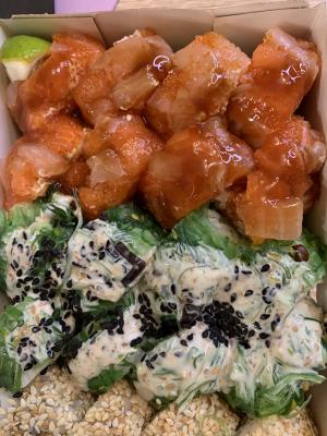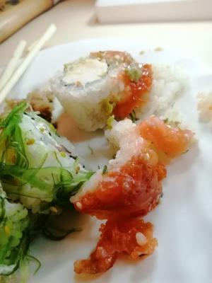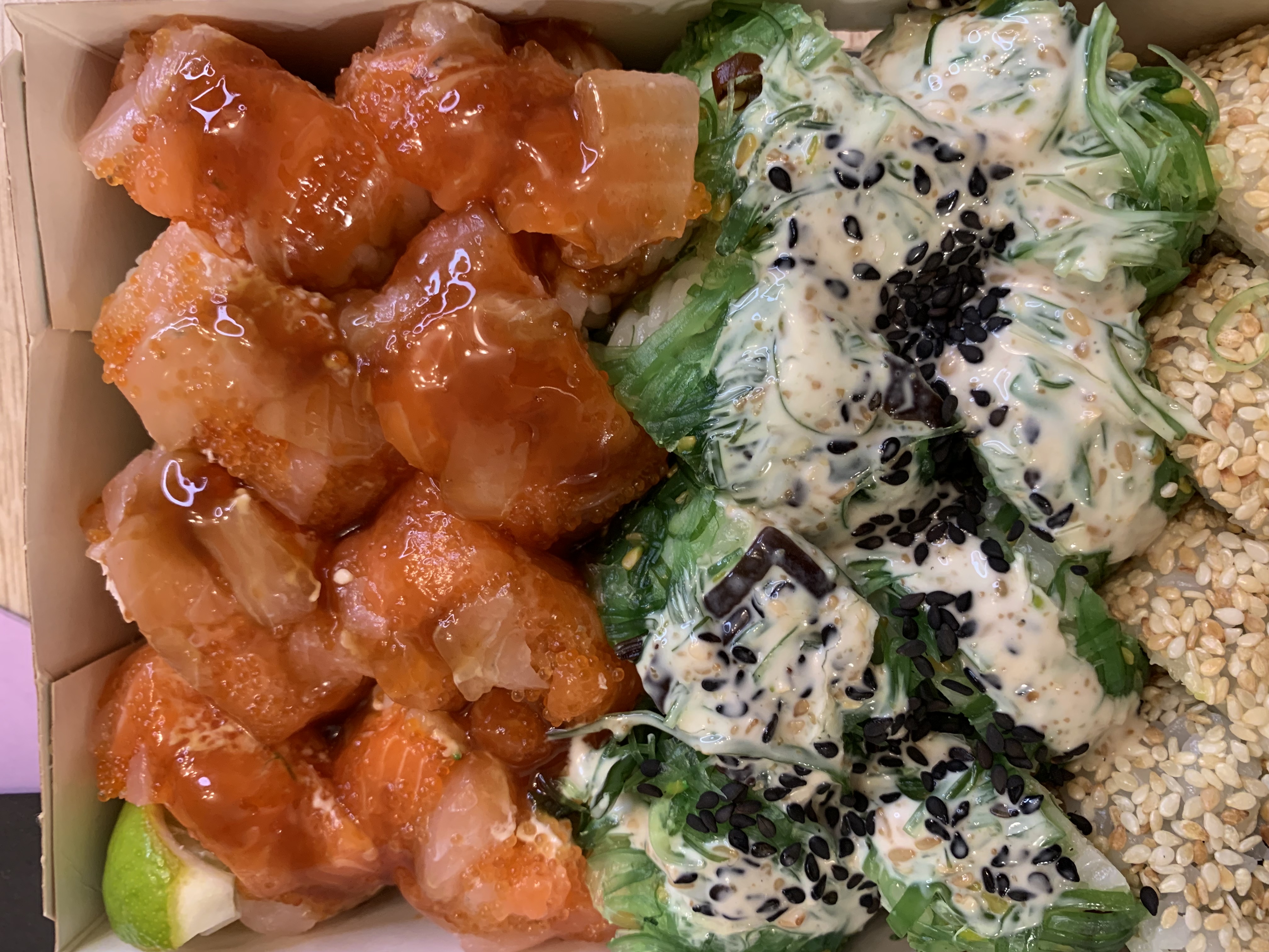 Состав: лосось, огурец, сливочный сыр, соус спайси, кунжут кимчи, соус терияки, кляр, сухари панко