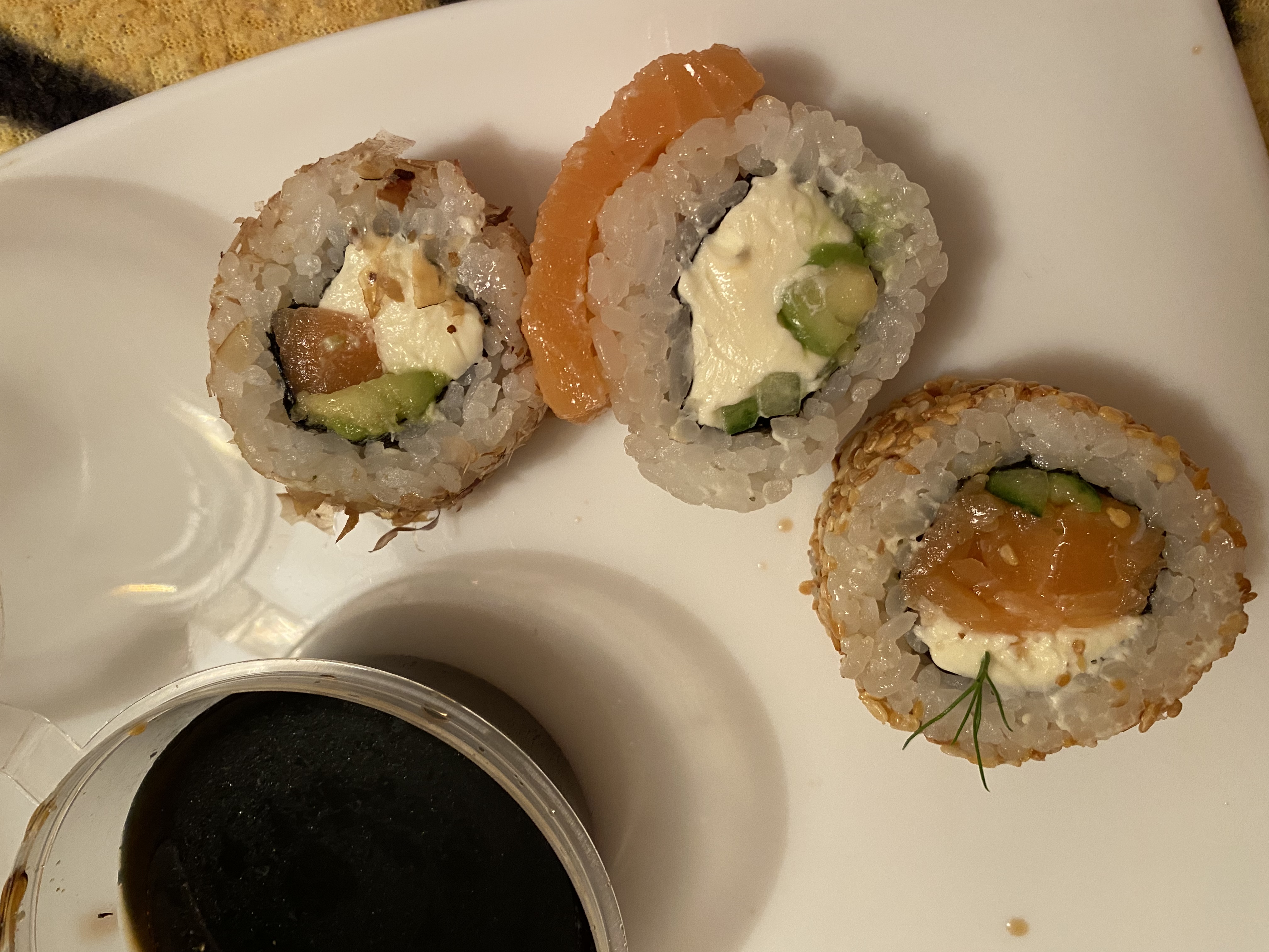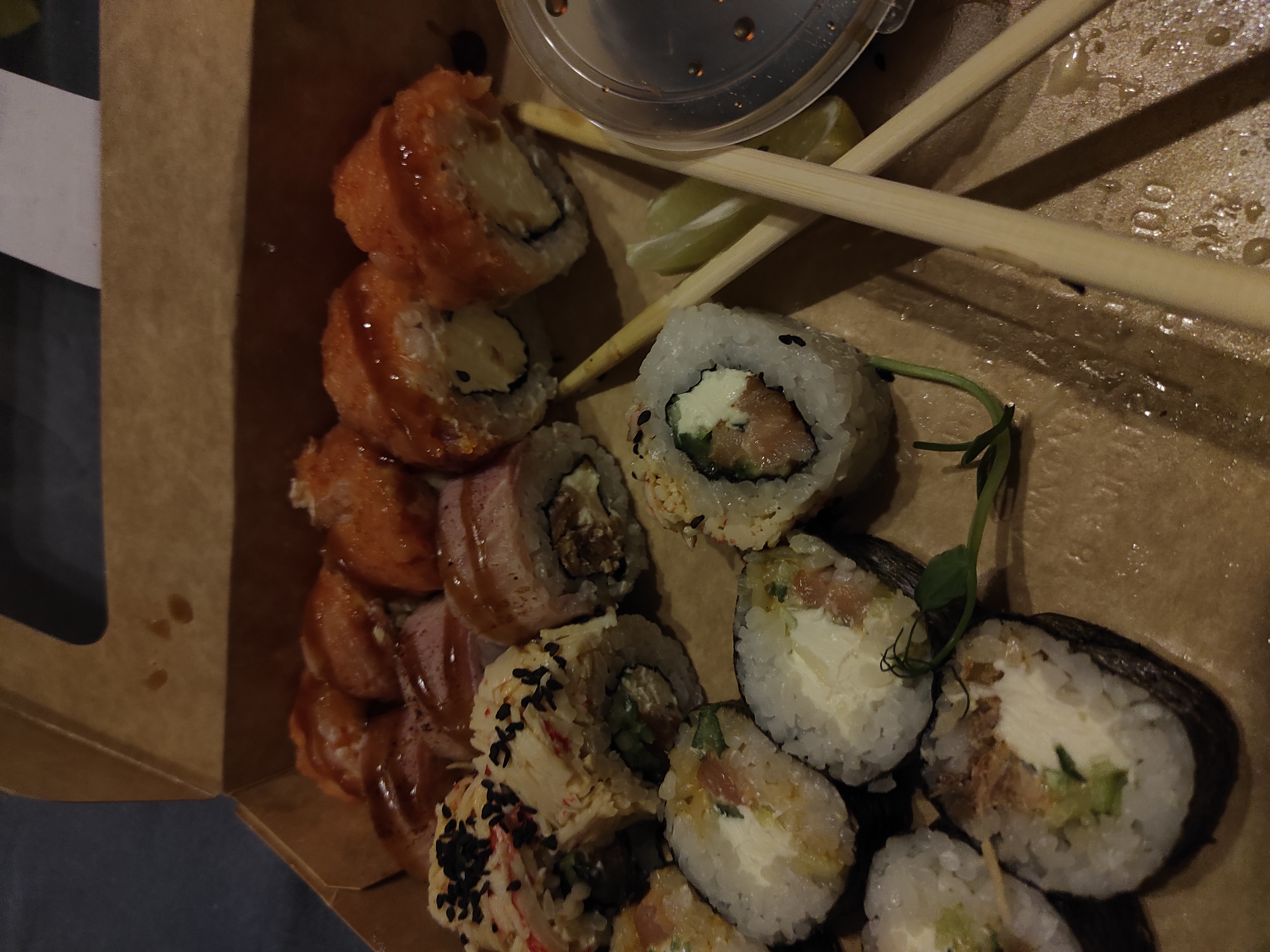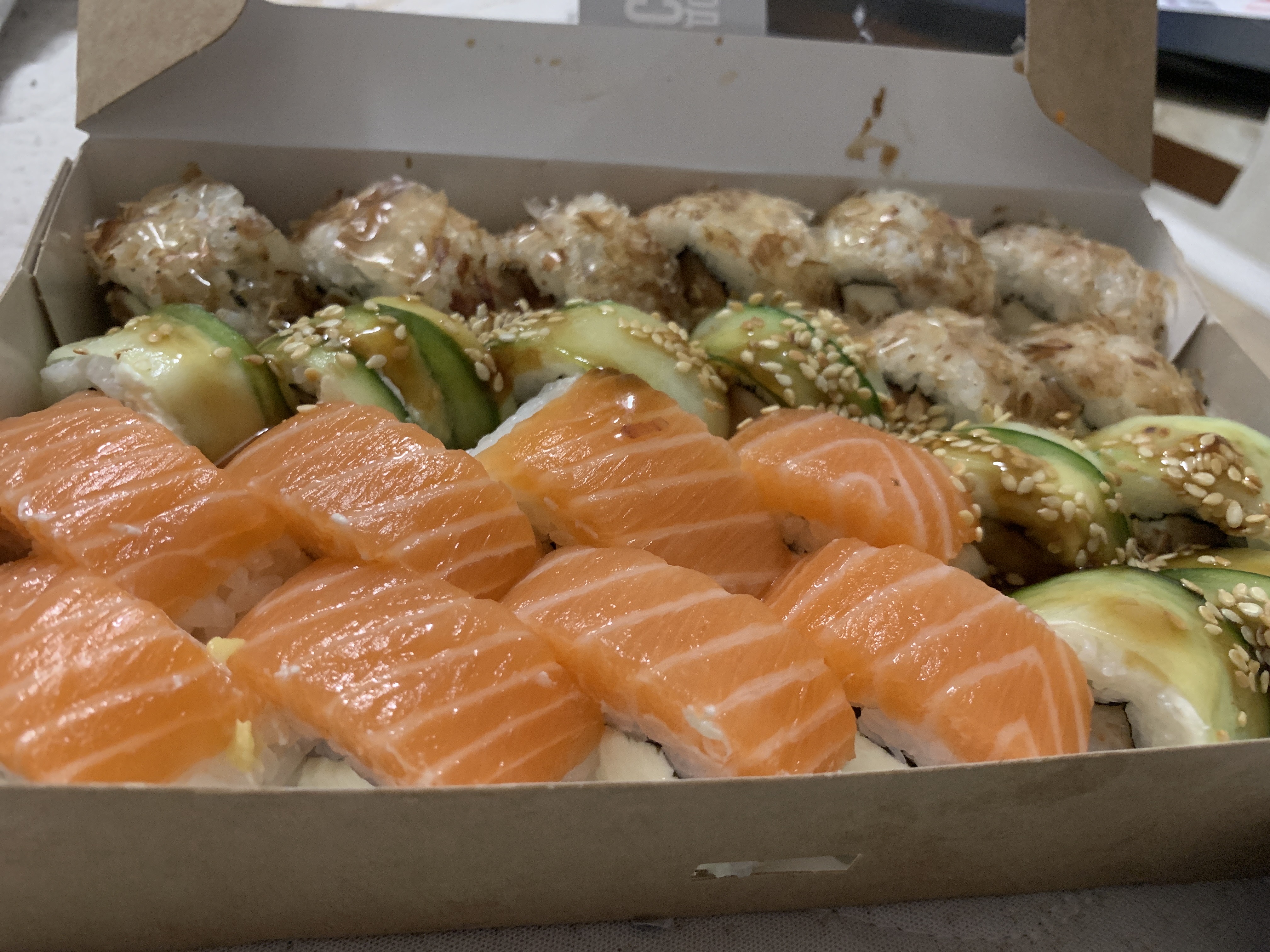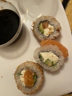 Состав: лосось, огурец, сливочный сыр, соус спайси, кунжут кимчи, соус терияки, кляр, сухари панко