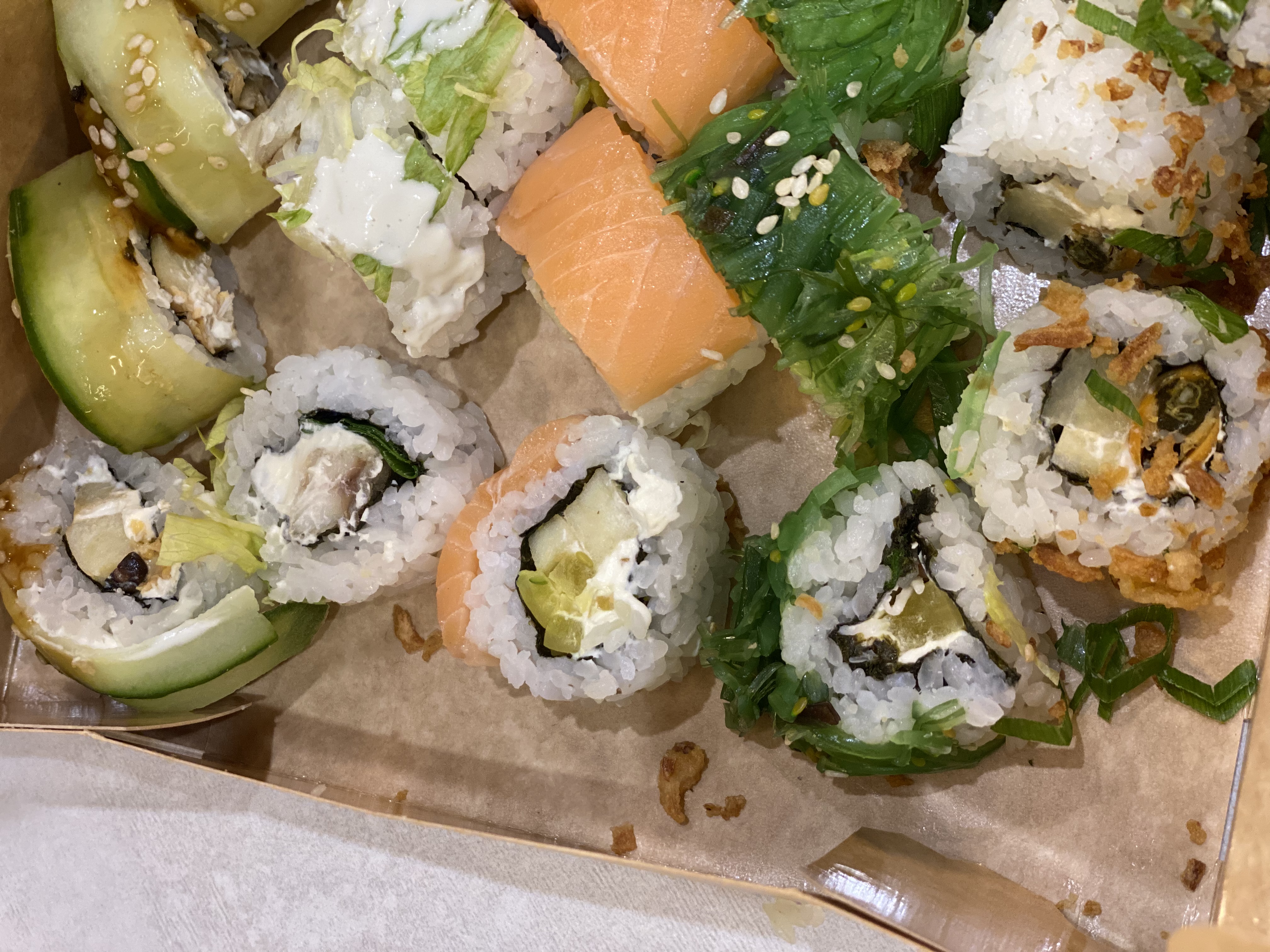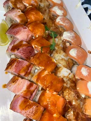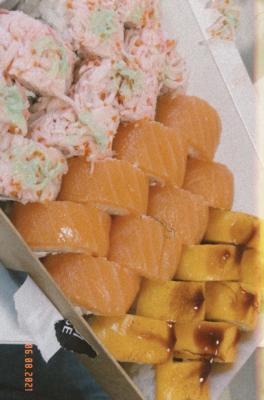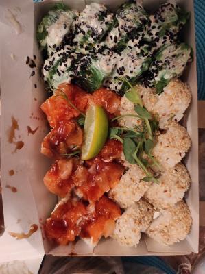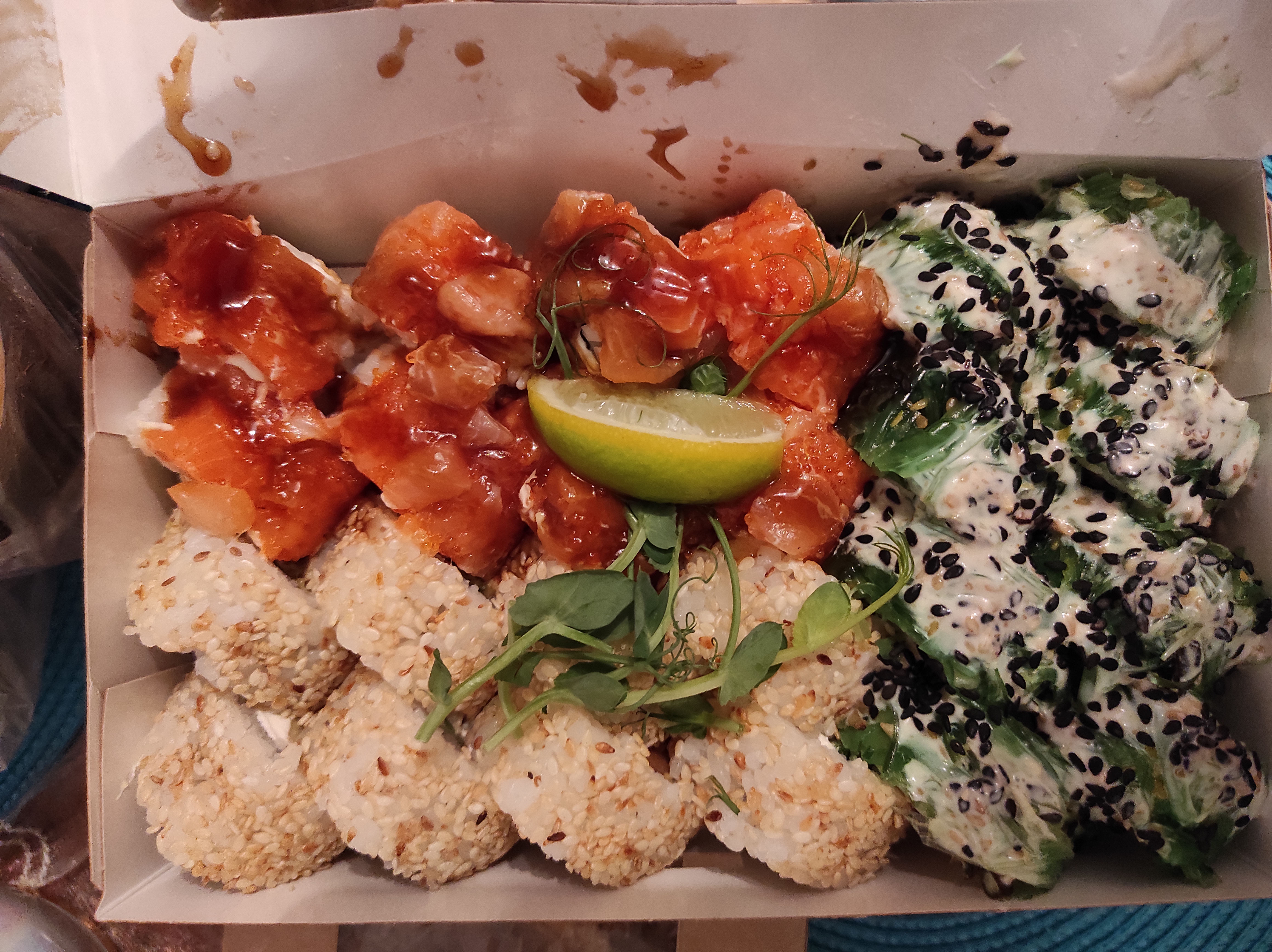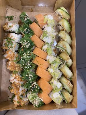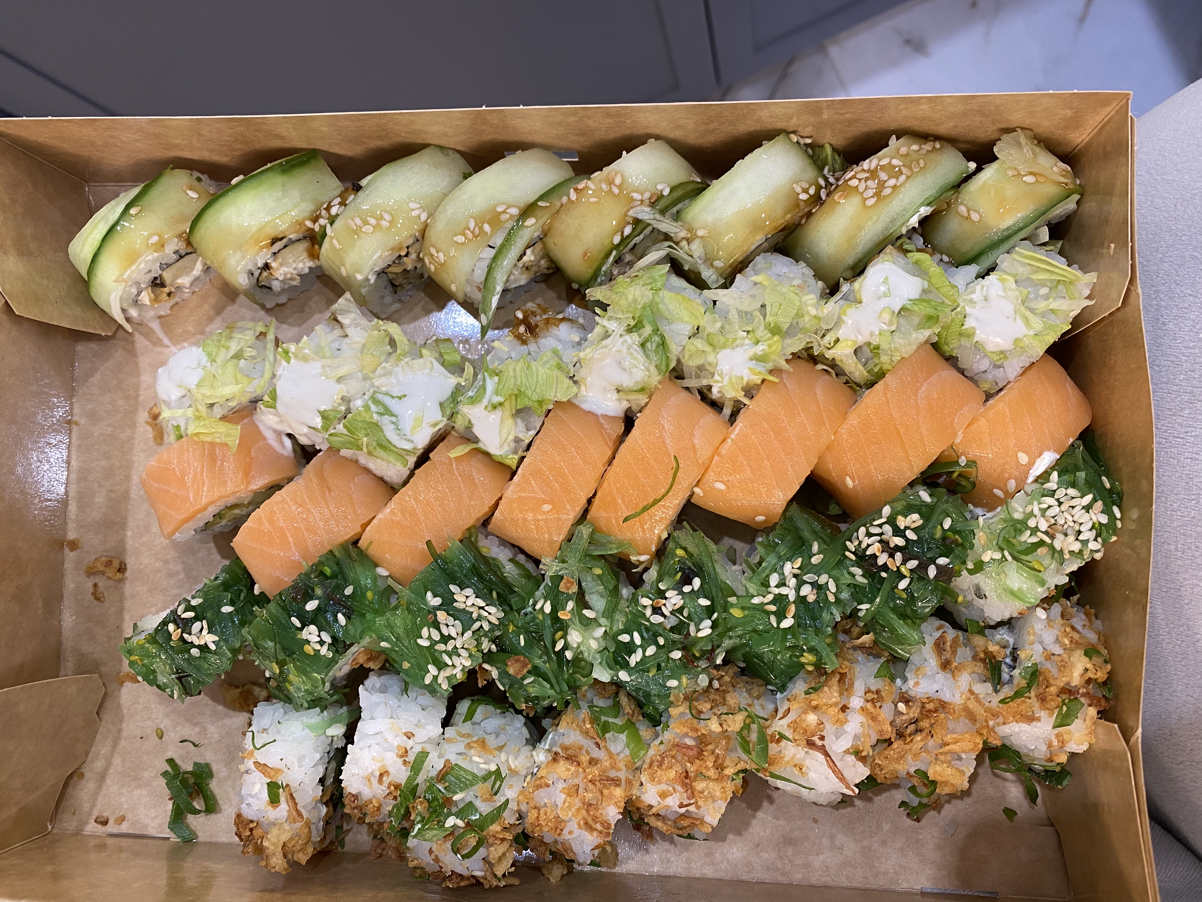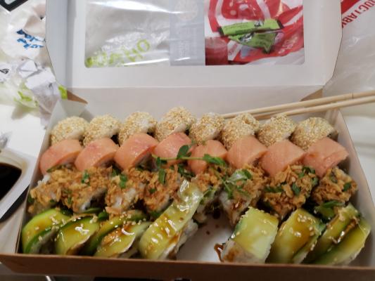 Состав: лосось, огурец, сливочный сыр, соус спайси, кунжут кимчи, соус терияки, кляр, сухари панко