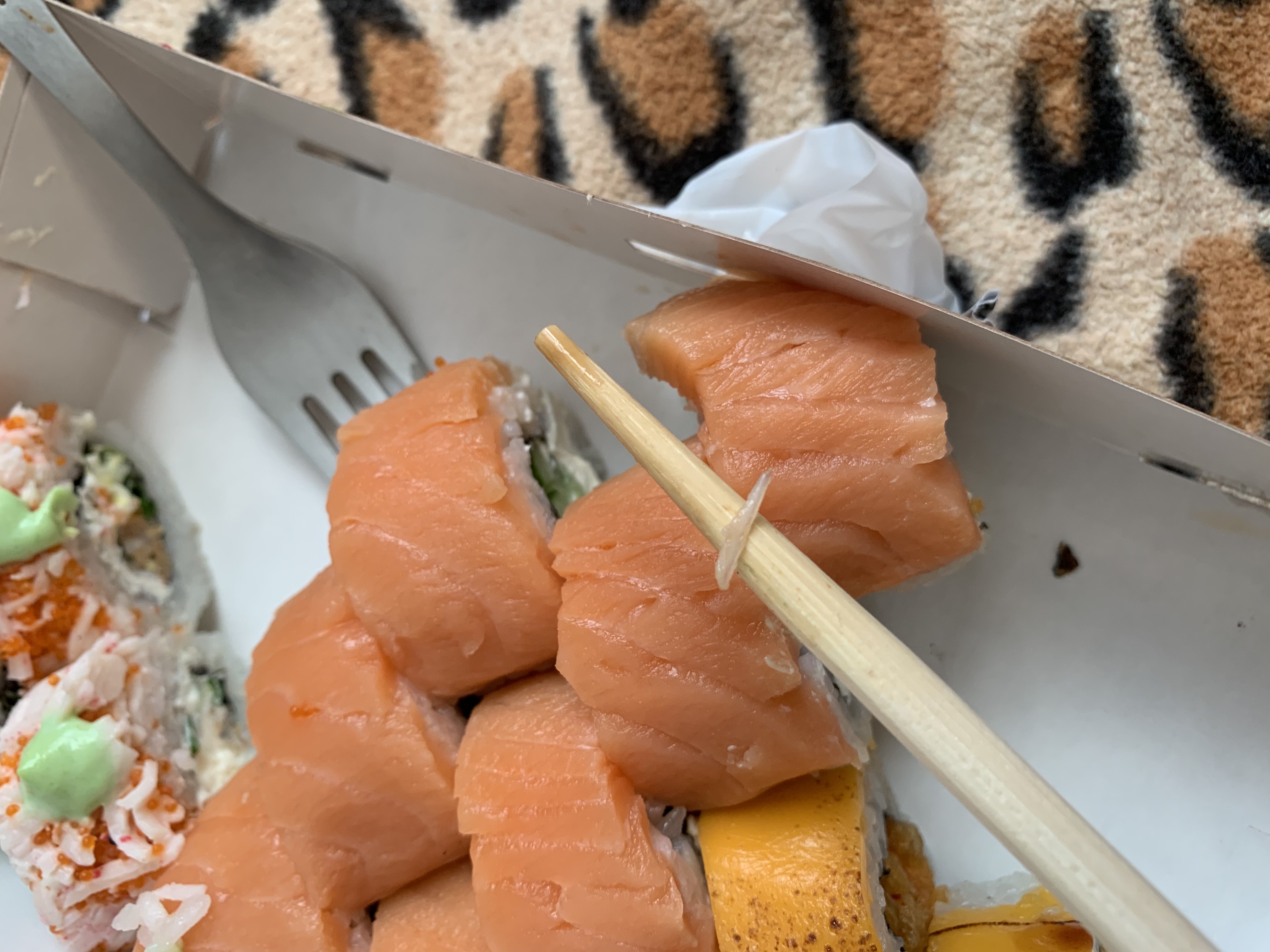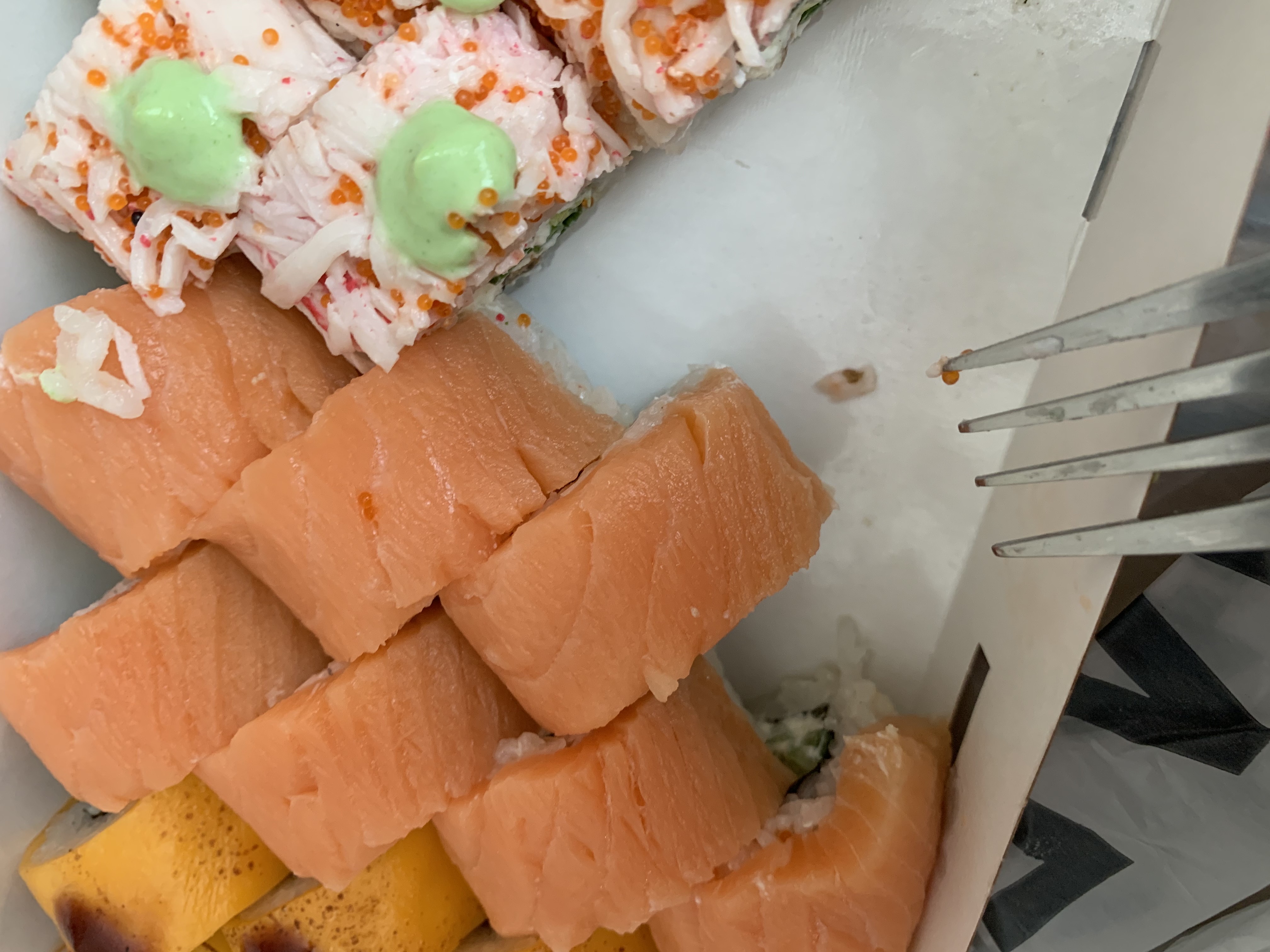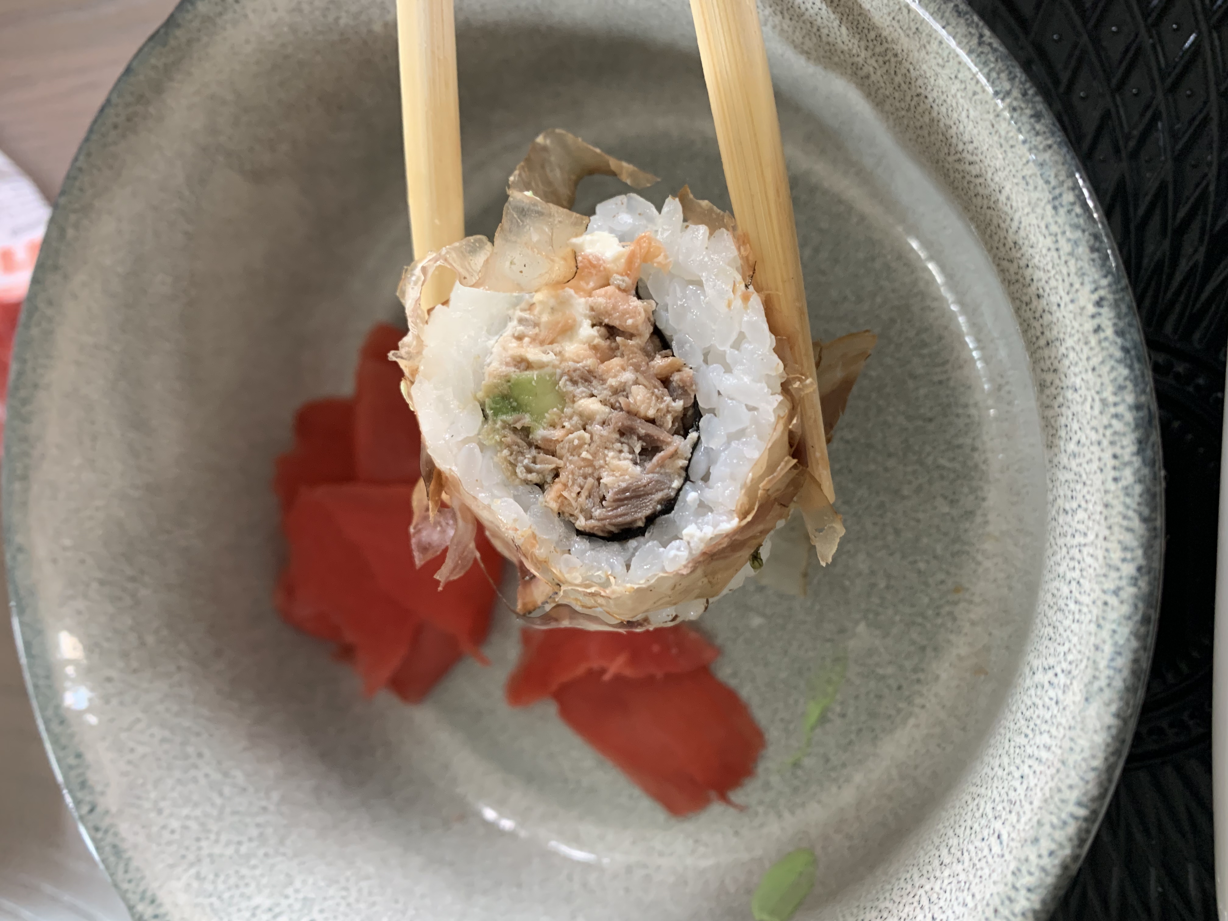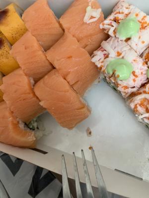Состав: лосось, огурец, сливочный сыр, соус спайси, кунжут кимчи, соус терияки, кляр, сухари панко