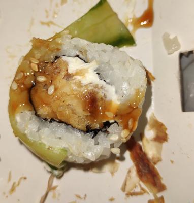 Состав: краб микс, сыр чеддер, огурец, чипс бекона, сливочный сыр, соус терияки, кляр, сухари панко