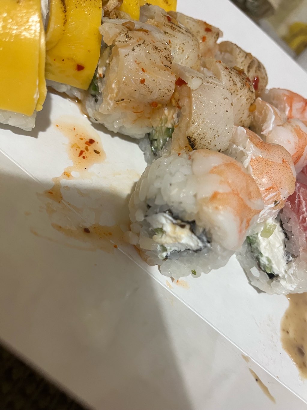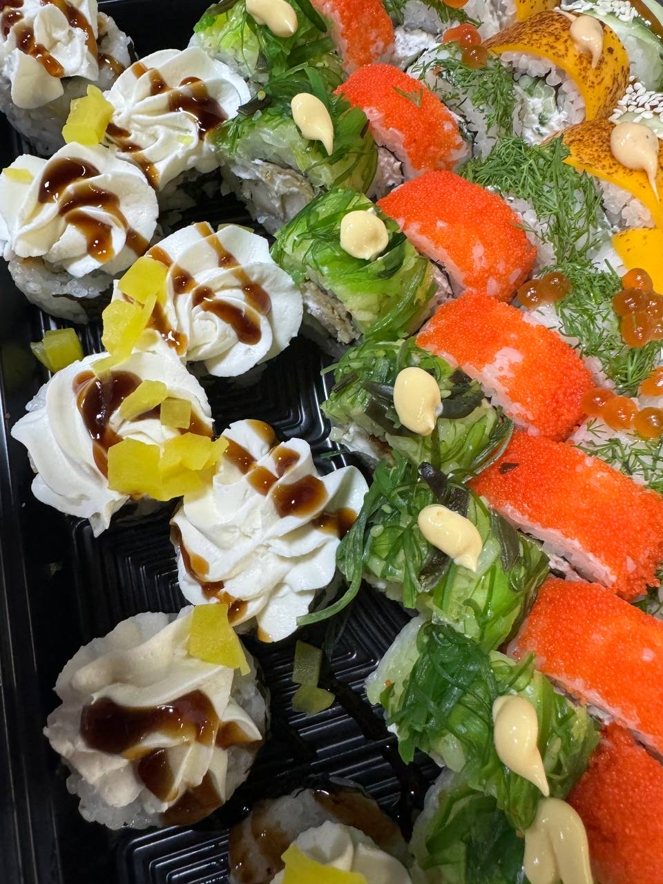 Состав: лосось, огурец, сливочный сыр, соус спайси, кунжут кимчи, соус терияки, кляр, сухари панко