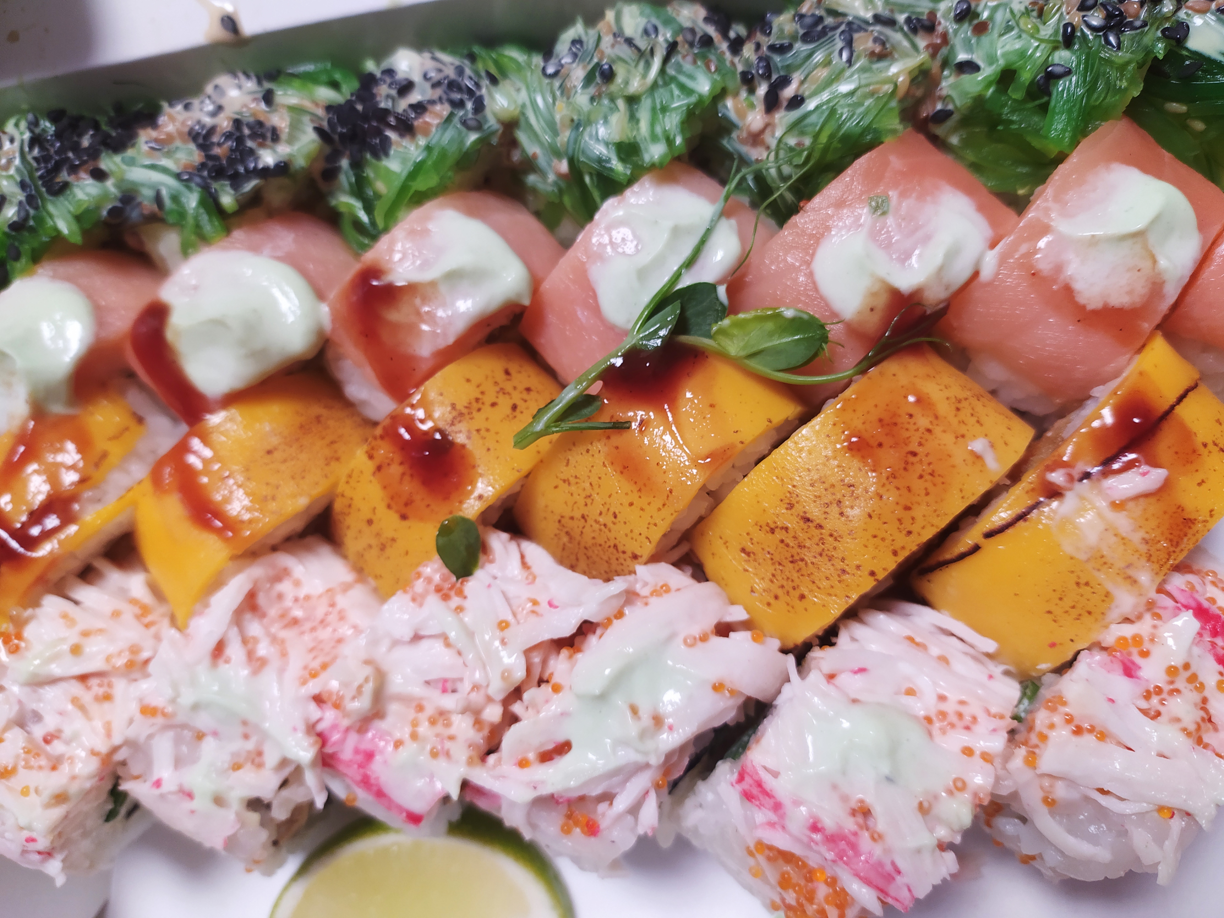 Состав: креветка, авокадо, манго, сливочный сыр, соус уорчестор, кунжутное масло, кунжут, сус кунжутный, петрушка