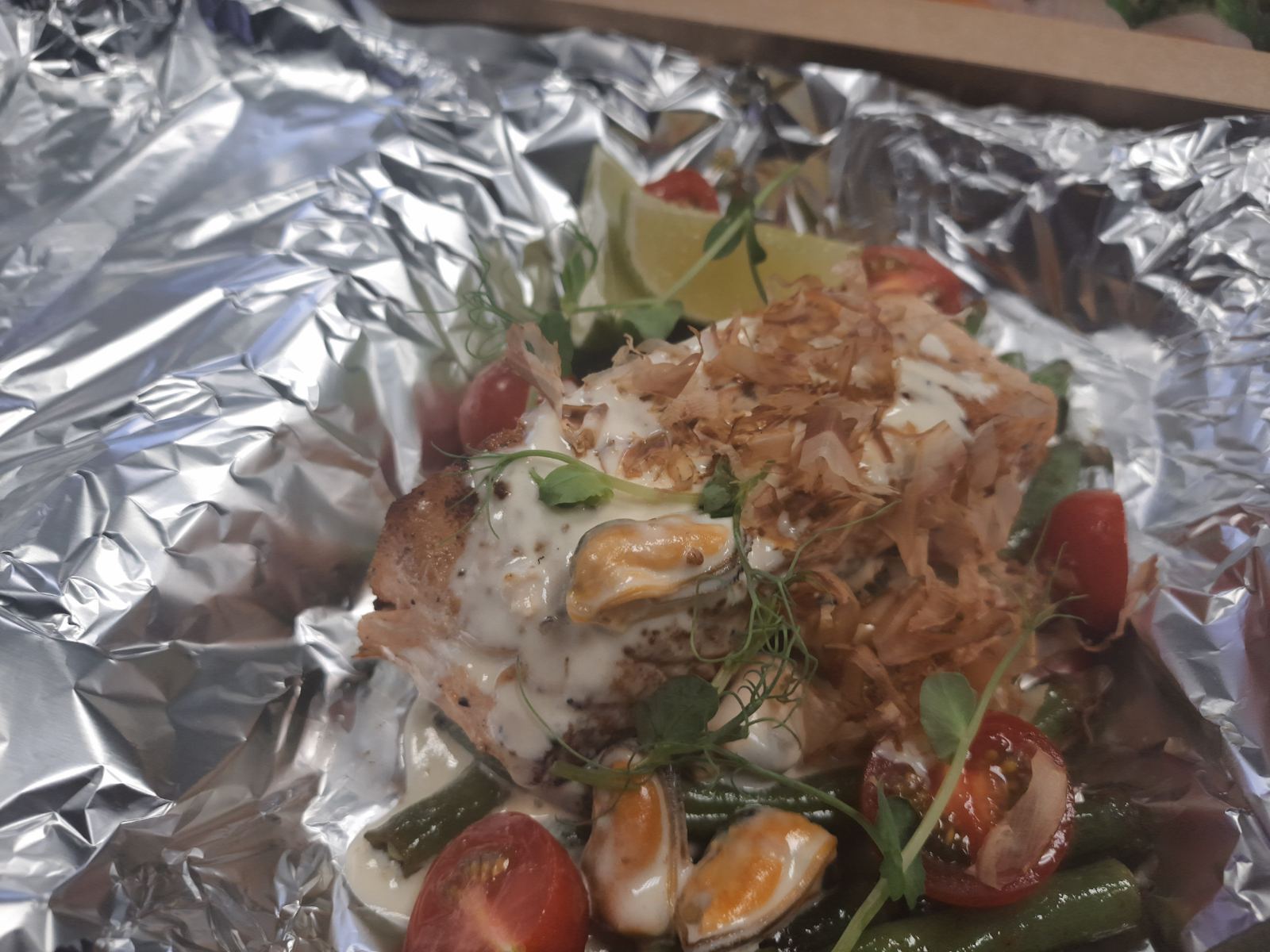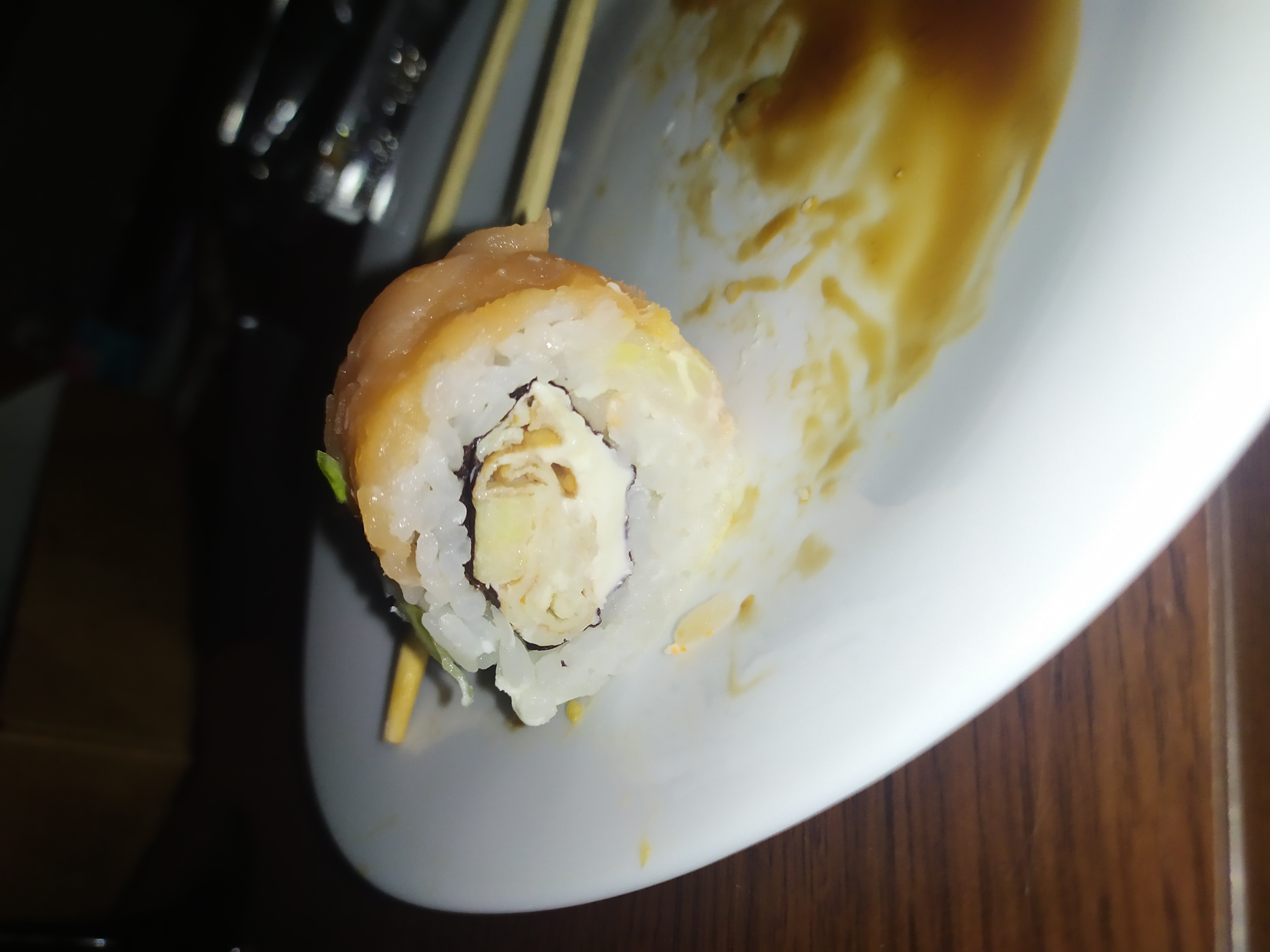 Состав: сунец, авокадо, сливочный сыр, кунжутное масло, картофель пай, соус терияки, кляр, сухари панко
