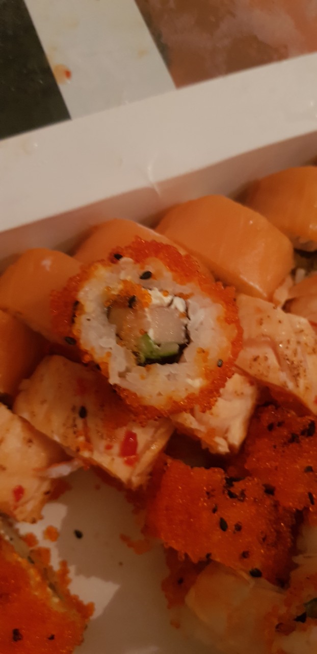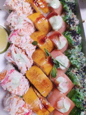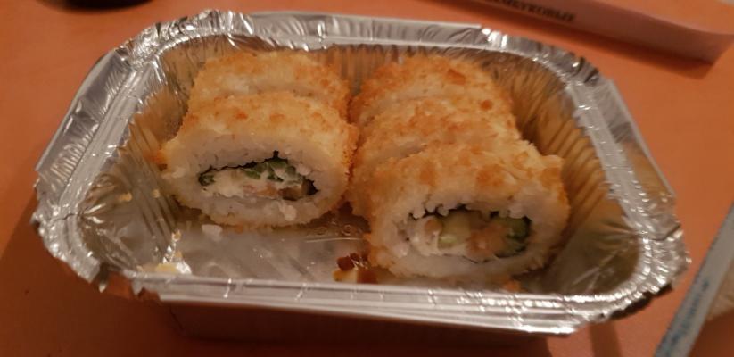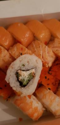Состав: лосось, огурец, сливочный сыр, соус спайси, кунжут кимчи, соус терияки, кляр, сухари панко