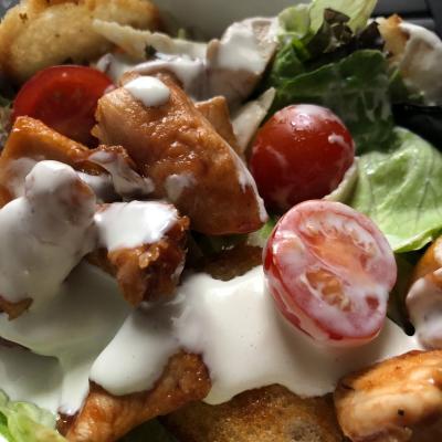 Состав: шампиньоны жаренные, сыр чеддер, кранч лук, сливочный сыр, томаты черри, соус спайси, соус терияки, кляр, сухари панко