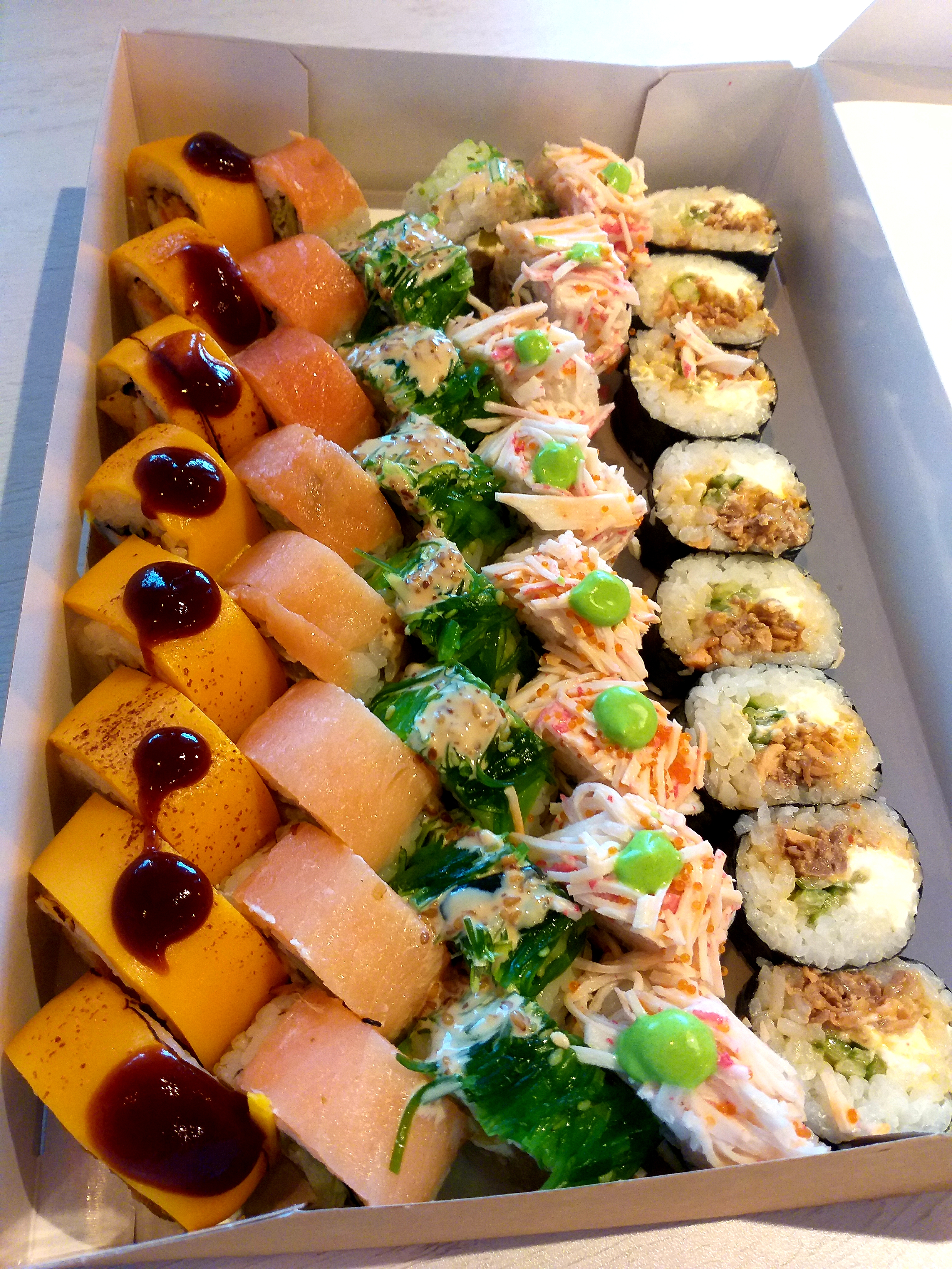Состав: сунец, авокадо, сливочный сыр, кунжутное масло, картофель пай, соус терияки, кляр, сухари панко