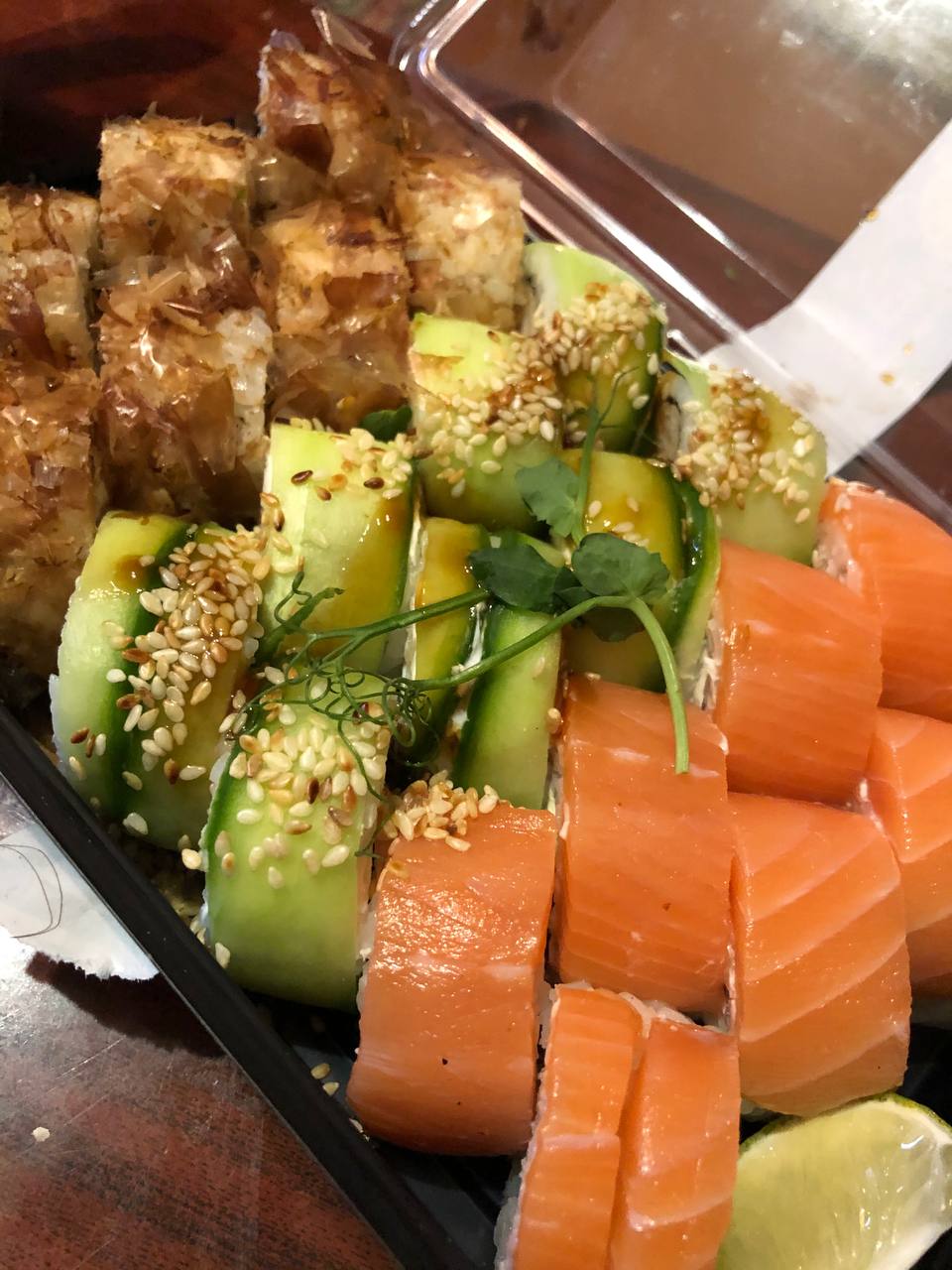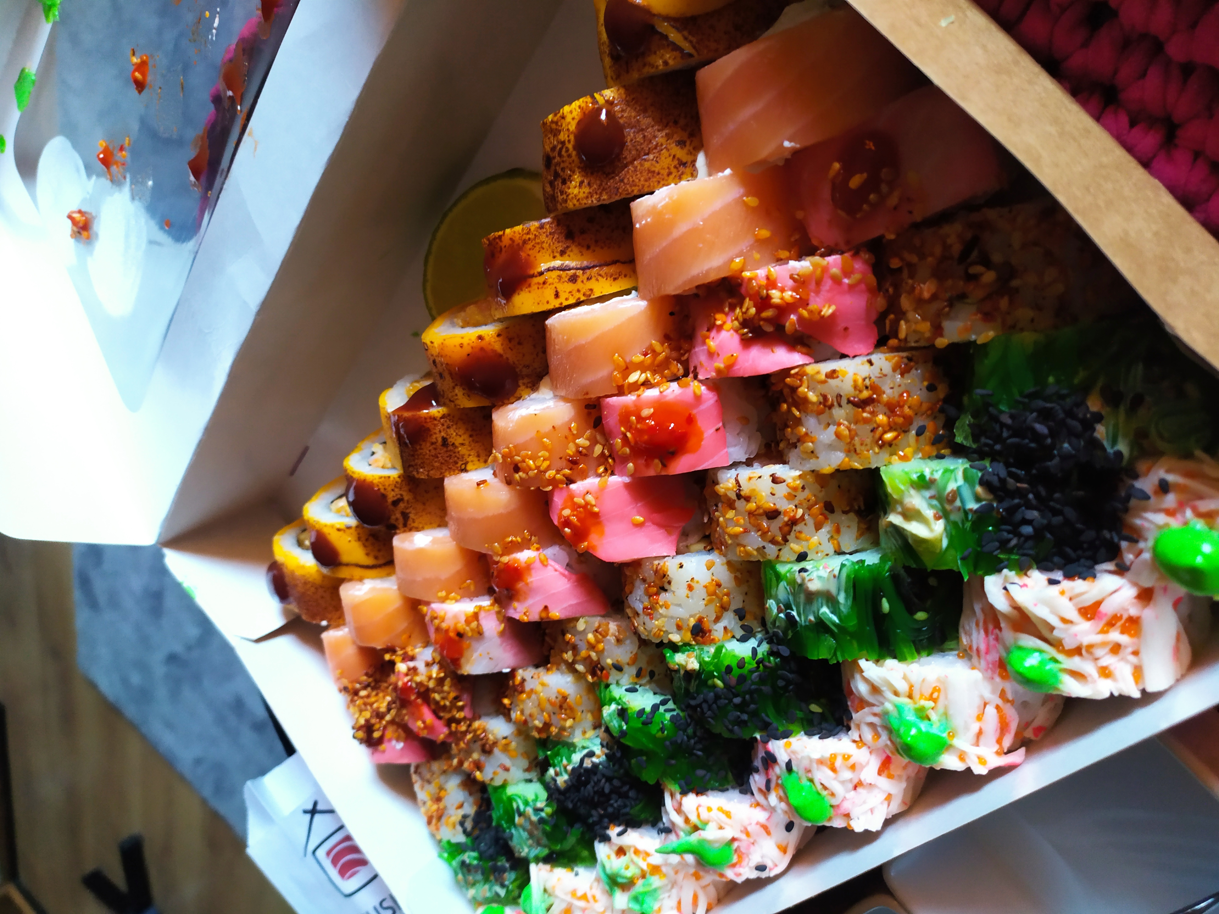 Состав: лосось, огурец, сливочный сыр, соус спайси, кунжут кимчи, соус терияки, кляр, сухари панко