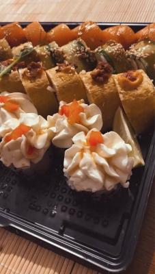 Состав: японский омлет, рис, нори, соус Унаги, кунжут белый
